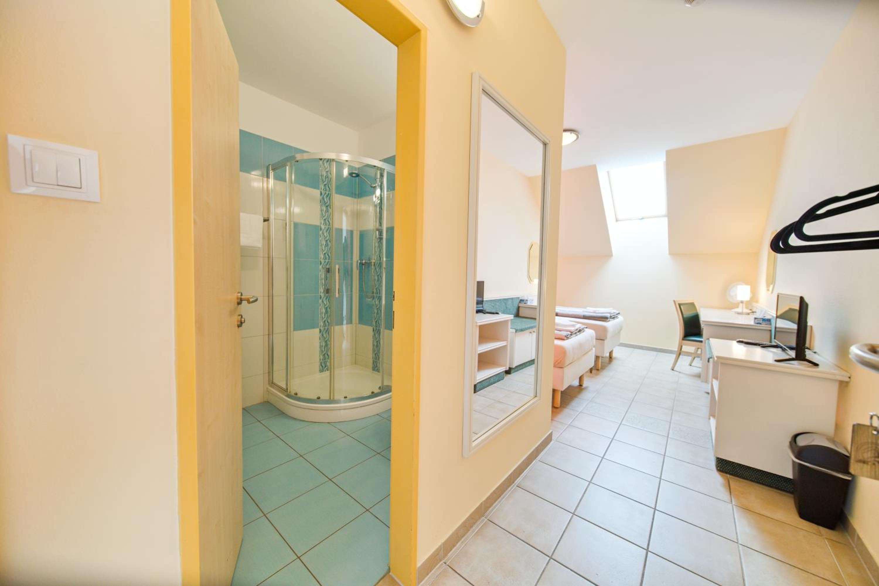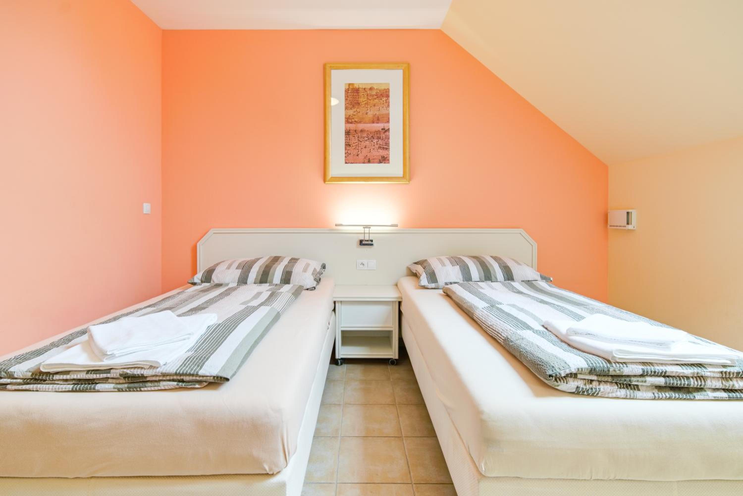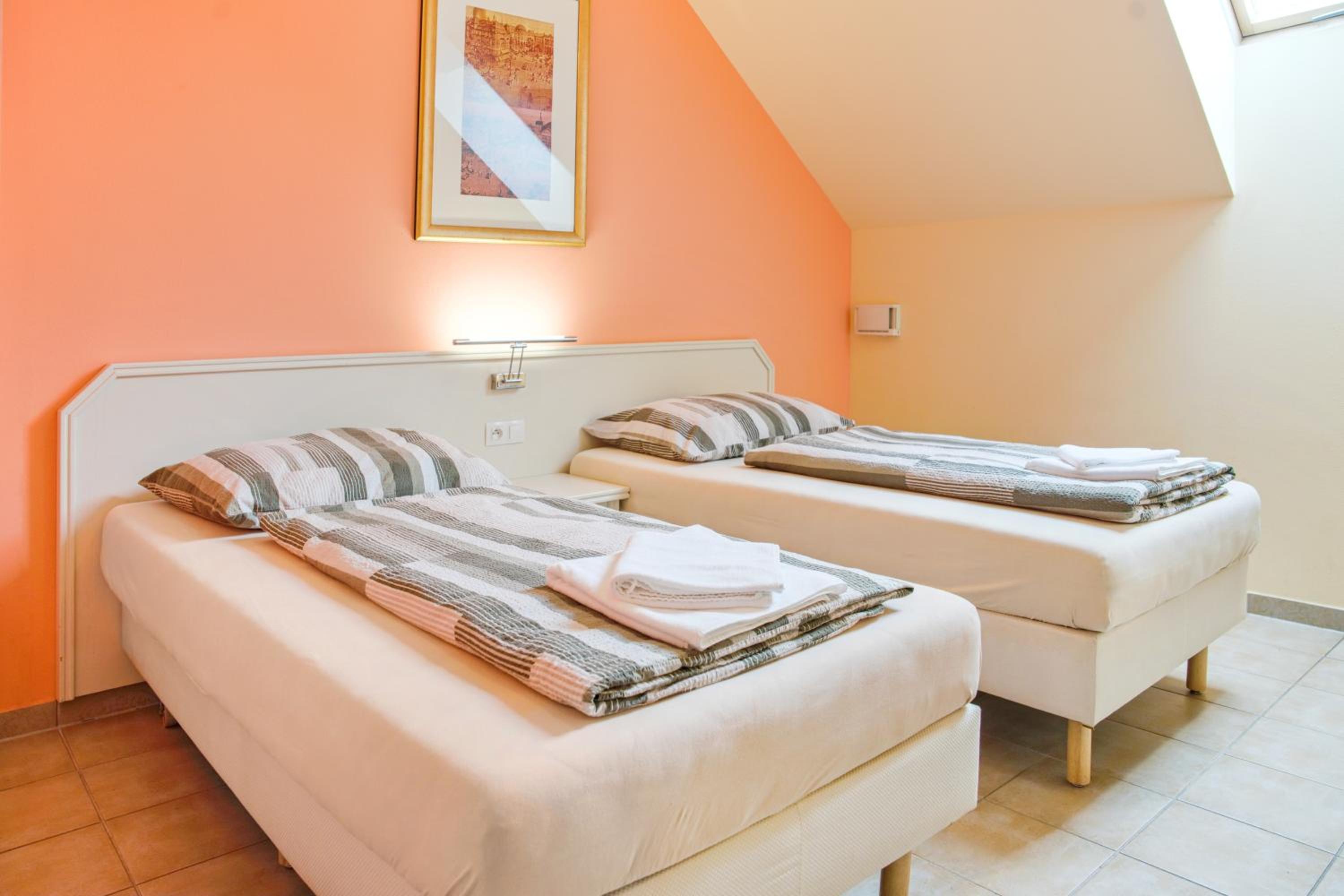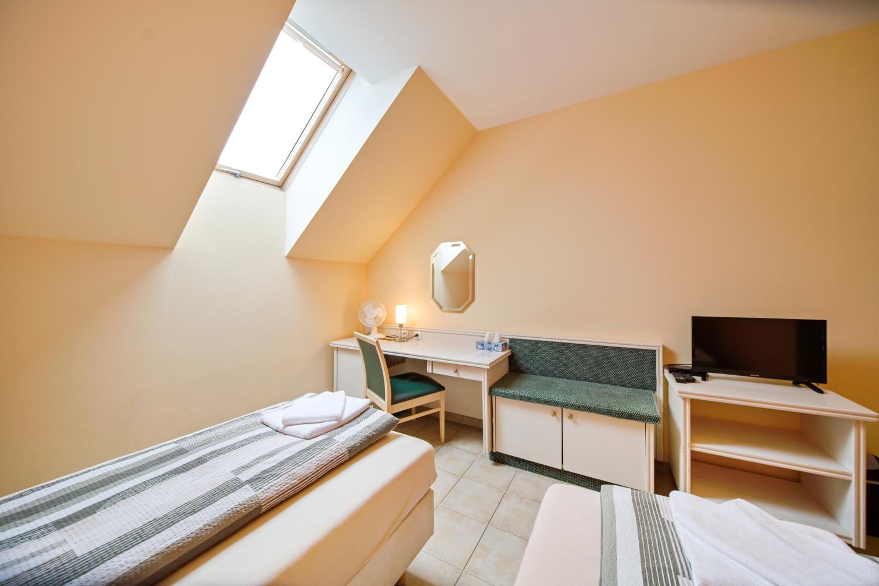 Podkrovní pokoj s malým okénkem u stropu byl spíše kobkou. Na jednu noc OK, ale na dovolenou je třeba si nějak pohlídat (zdá se, že takto vypadá celá kategorie 2L pokojů s oddělenými postelemi). Fotky jsou věrné, akorát nasvícené lépe než v realitě.