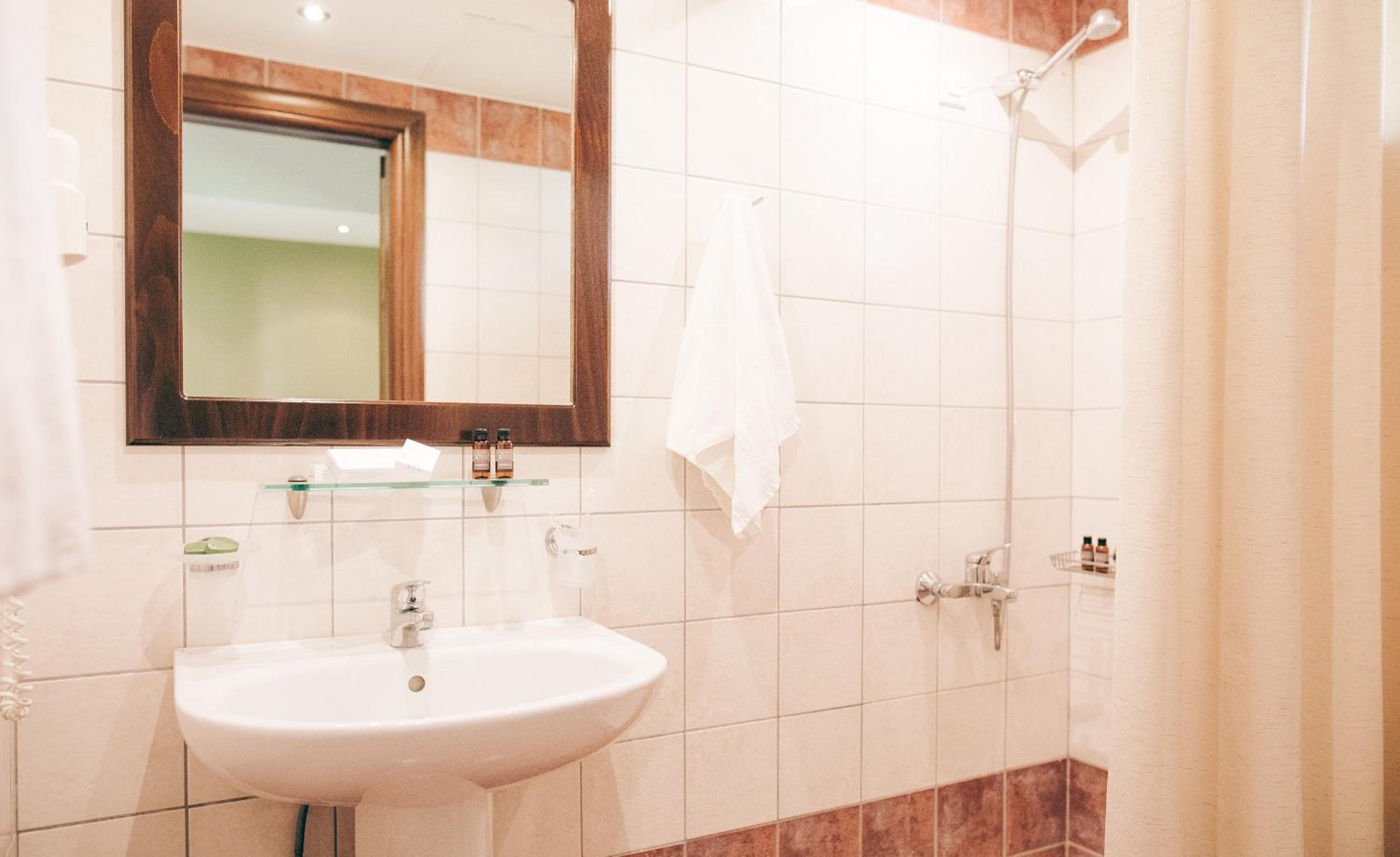 חדר מקלחת מיושן והמקלחת עם וילון לא נוח, המים מתיזים לכל עבר, ממש ברמה ירודה.