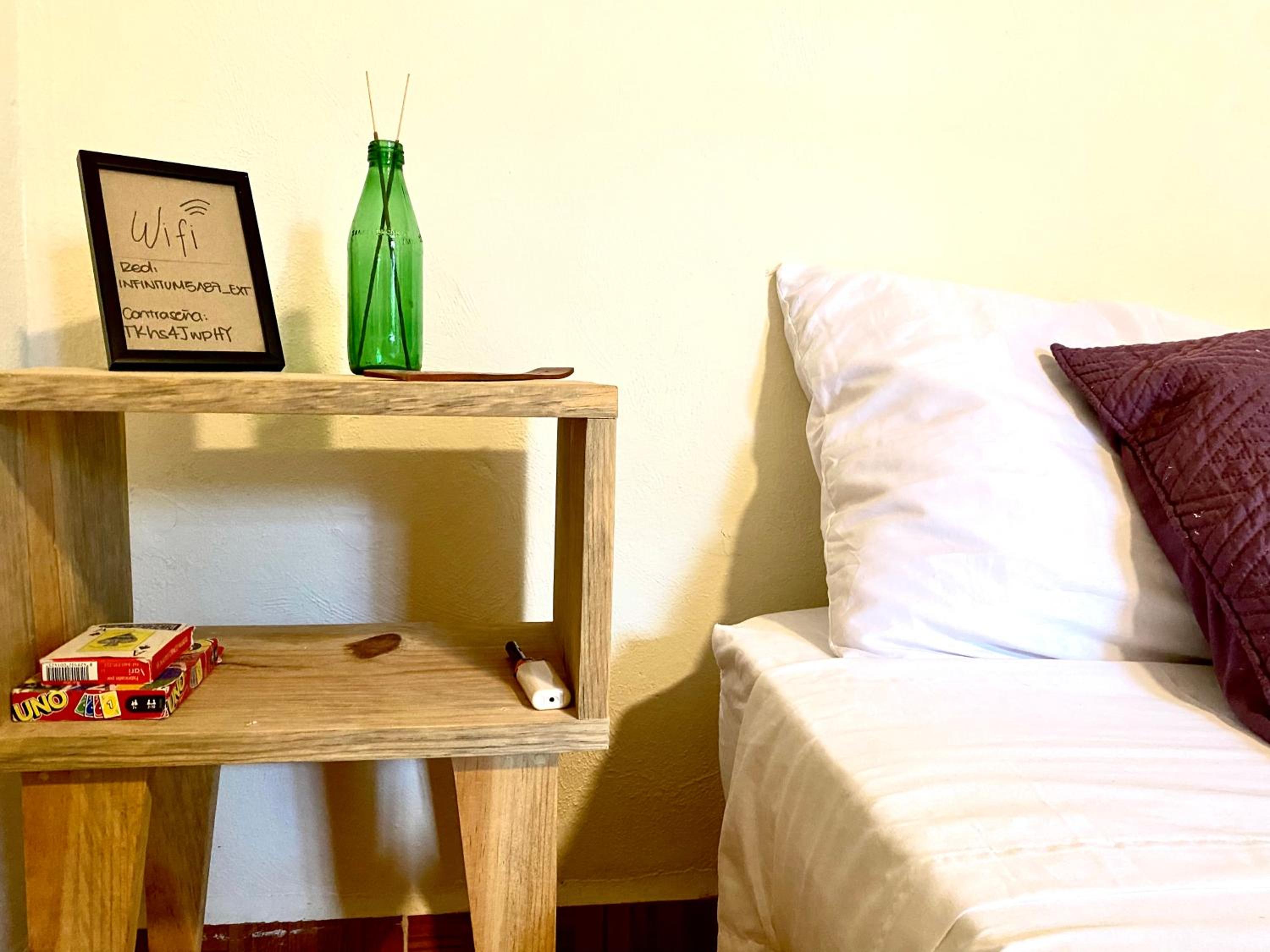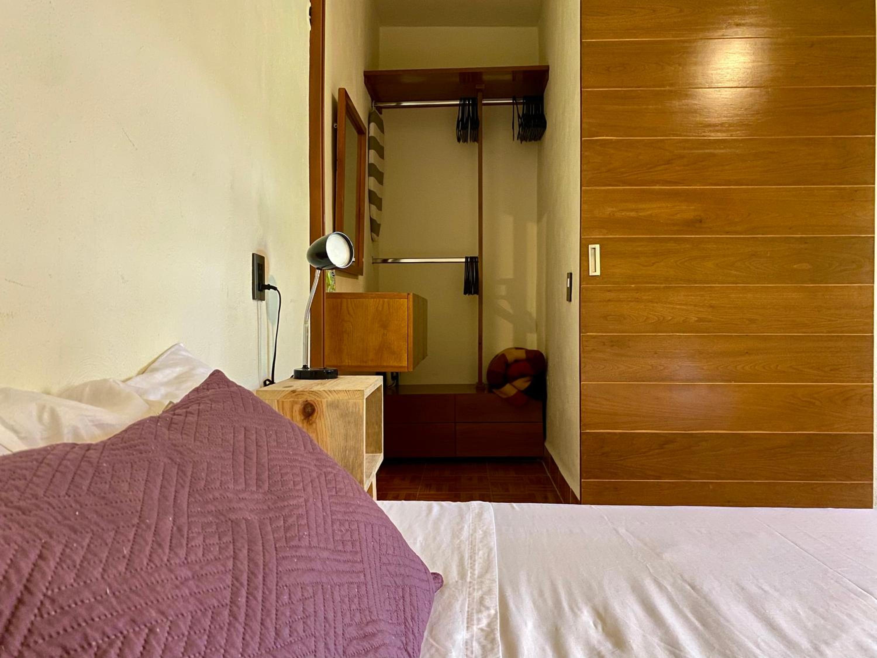 la recamara estaba muy bonita y comoda, me gusto que tenga todo lo necesario, como la clave de wifi a la mano, que tenga agua purificada disponible, y una plancha en el closet que no use porque lleve la mia pero es bueno saber que habia una disponible a la mano
