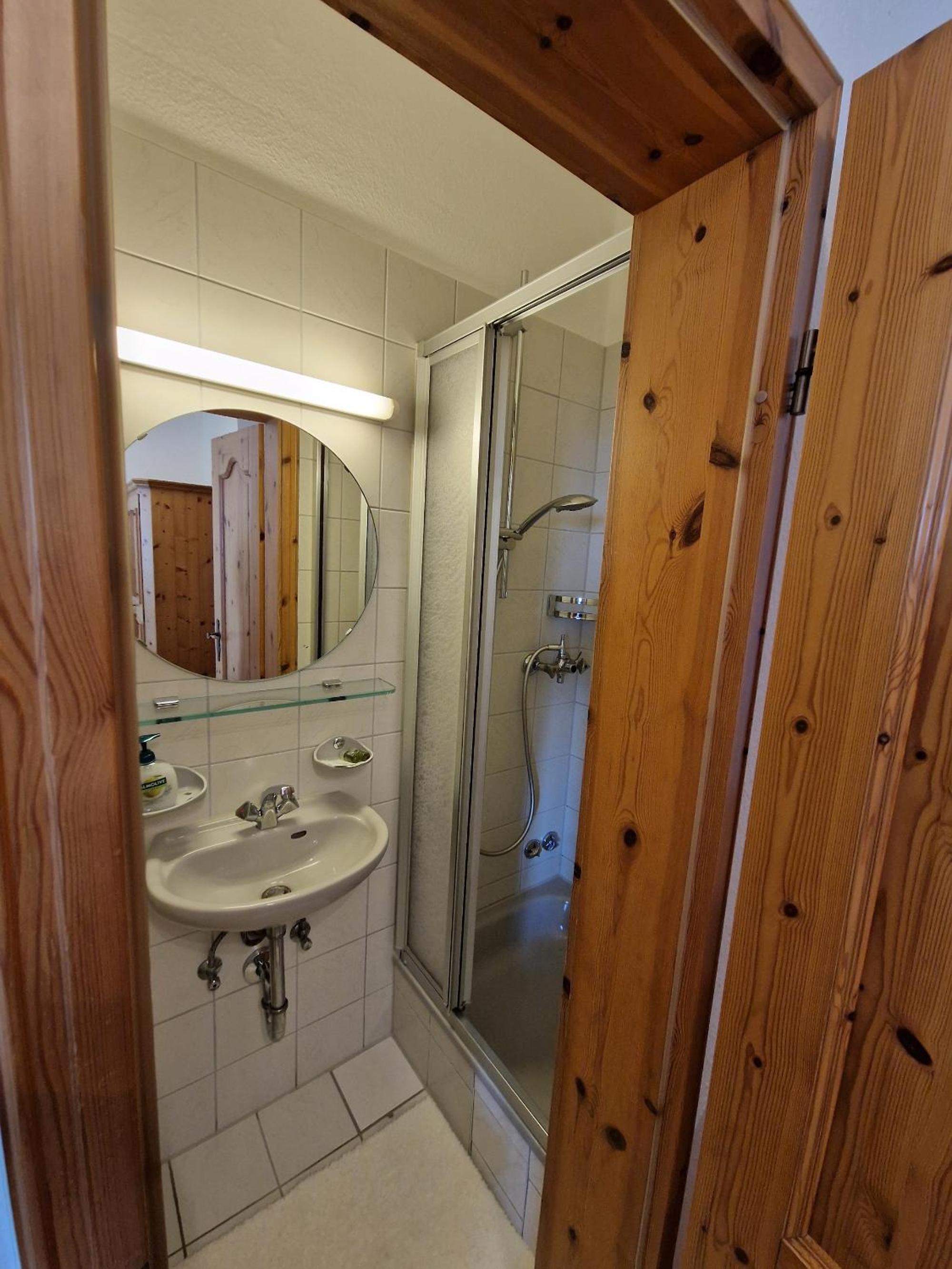 2 Fernseher im Zimmer, aber nicht angeschlossen und die falsche Fernbedienung. Tür der Duschkabine schließt nicht richtig.