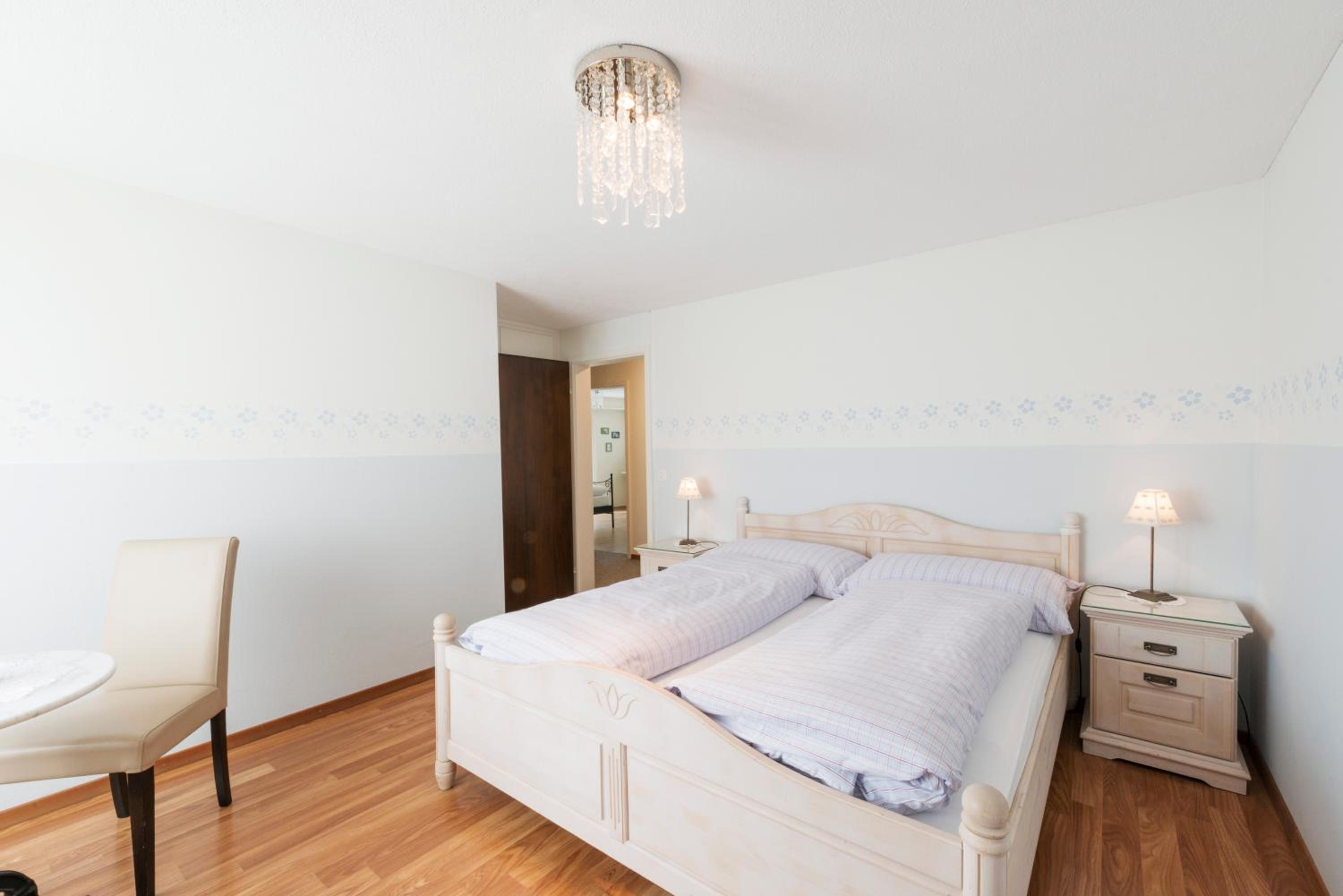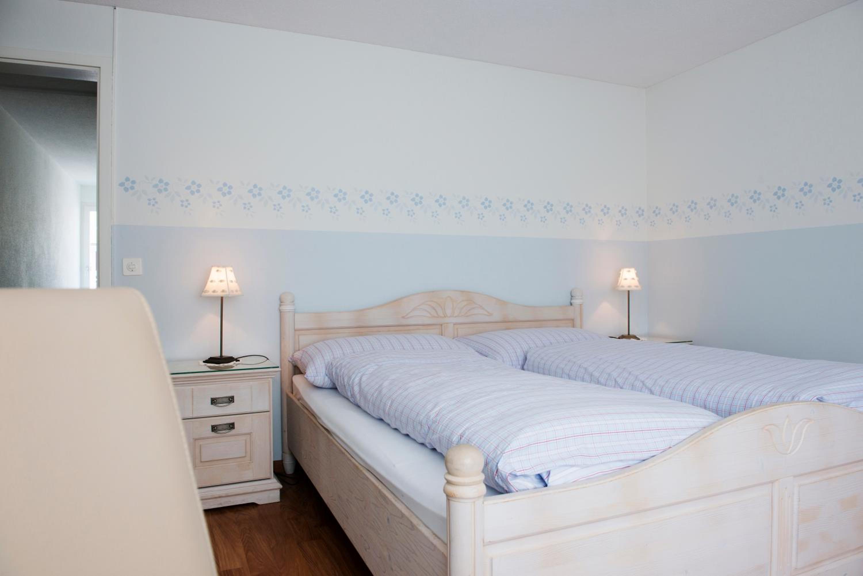 Notre chambre était très sombre et vielle au niveau des meubles , assez petite et la télé se trouvait dans un coin de la chambre et en partie occulter par la pièce douche et quand ont est sur le lit seule une personne arrive à voir la télé, et à part la chaîne Arte tout est en allemand ….fâcheux car en Suisse ont parle plusieurs langues donc l’italien et le français…..chambre numéro 4 . Naturellement pas d’air conditionné et il y faisait étouffant et deux fenêtres donnant sur le toit .