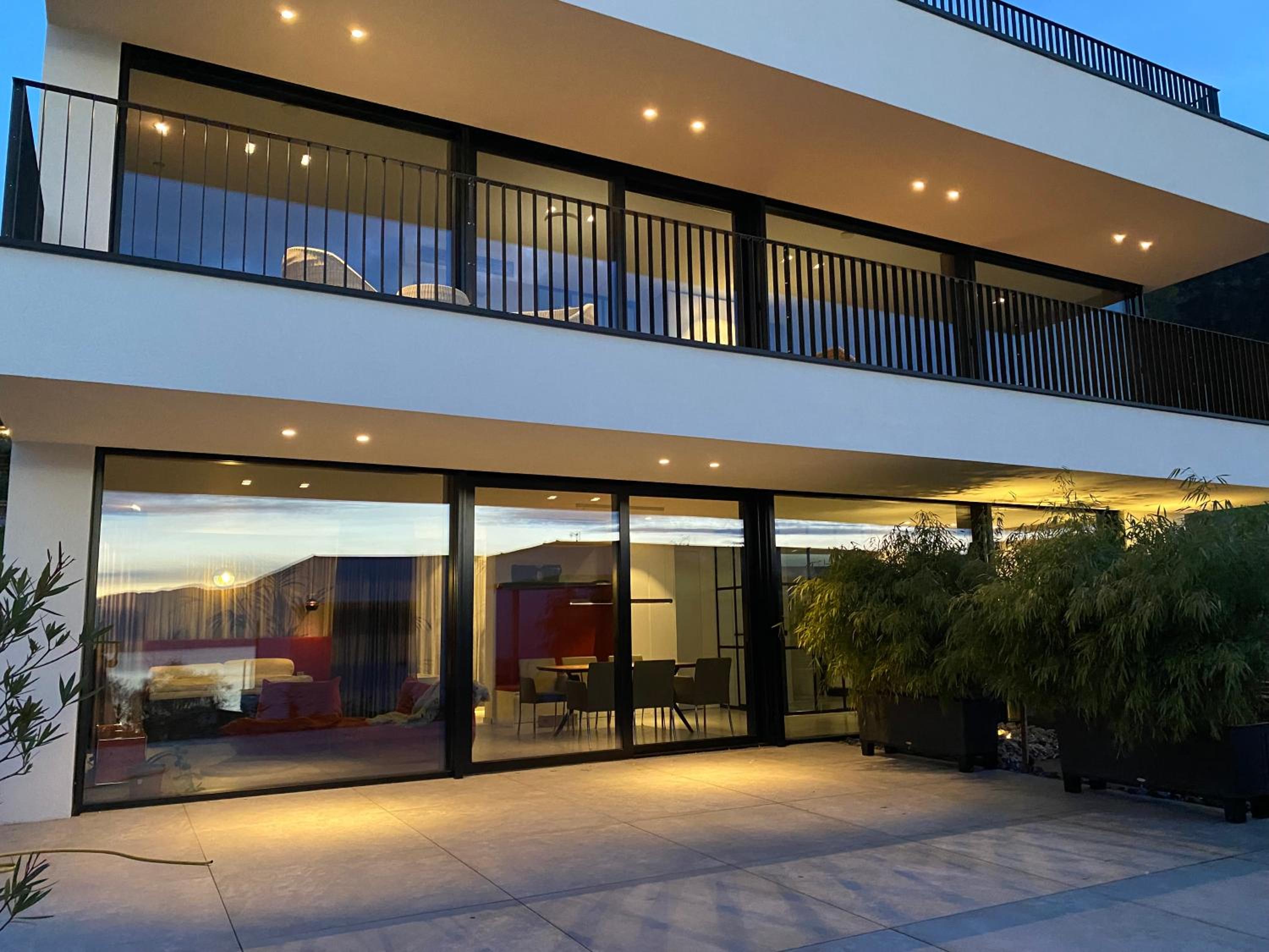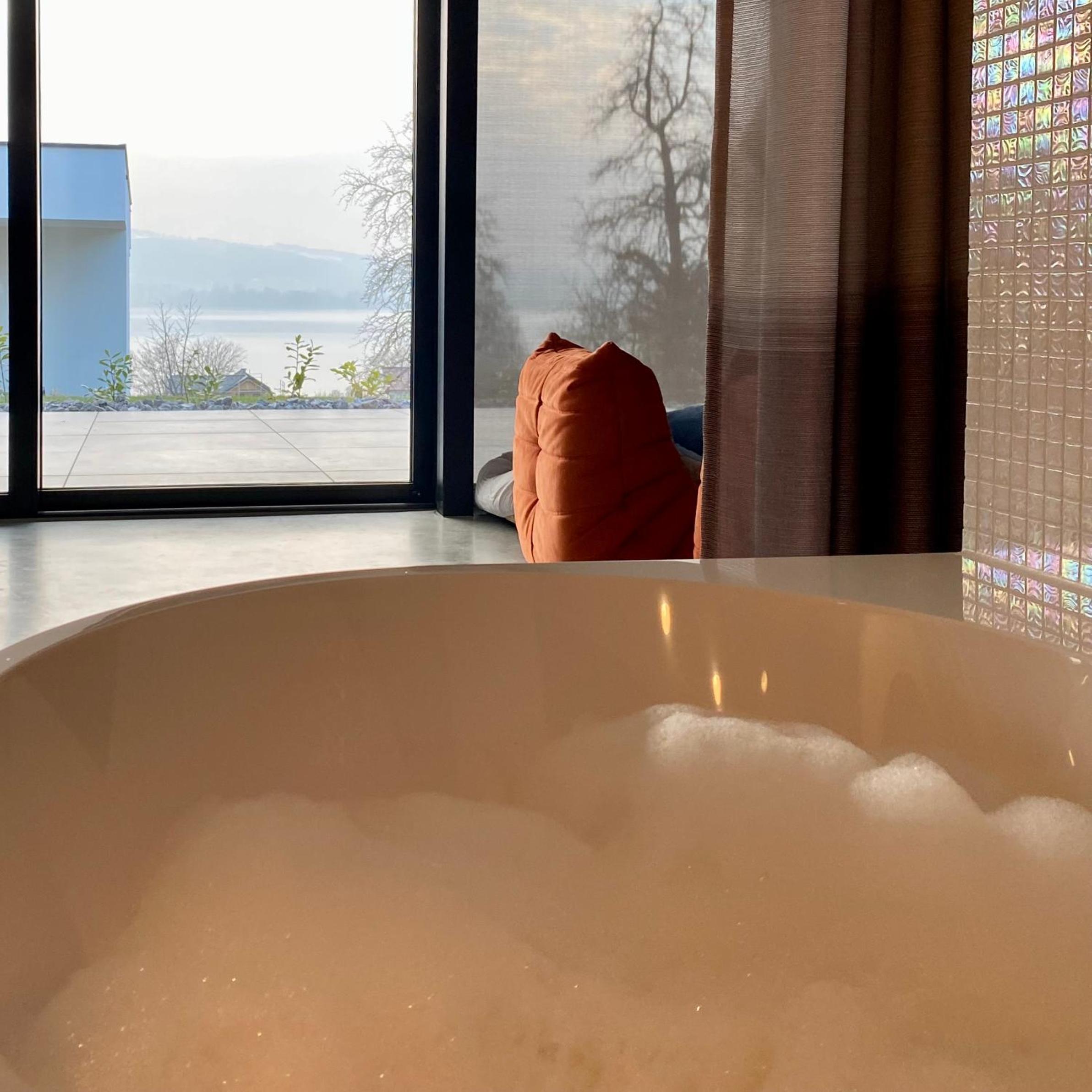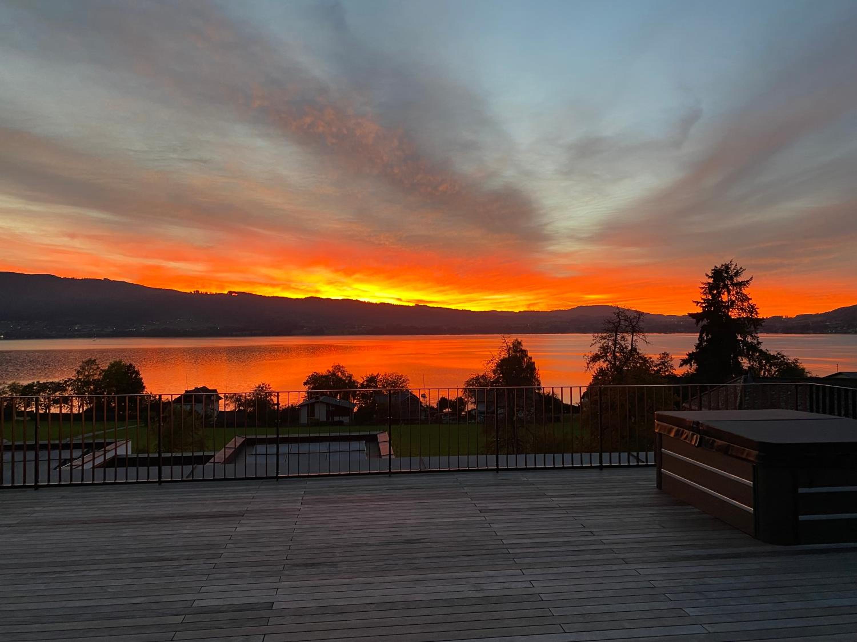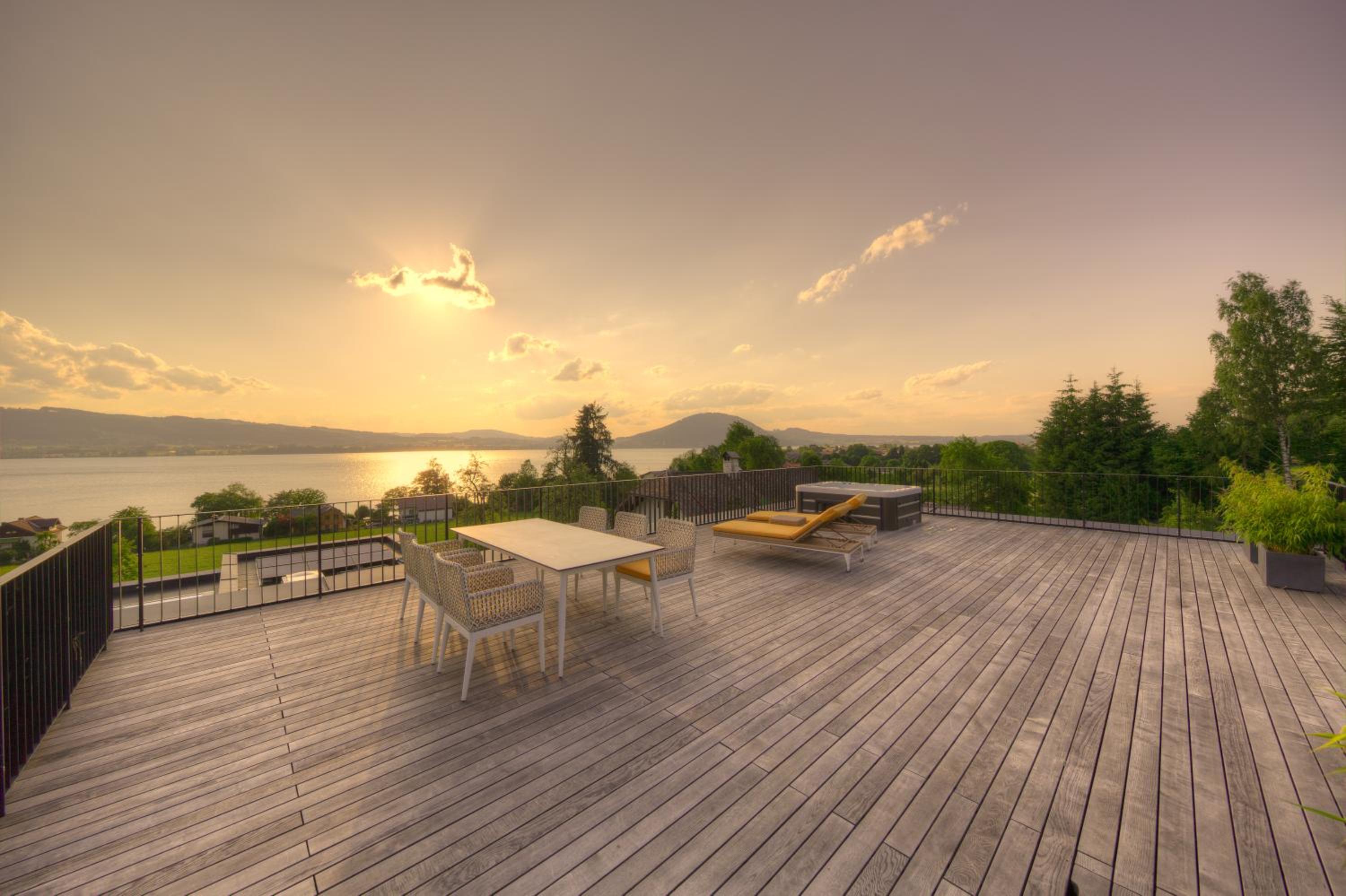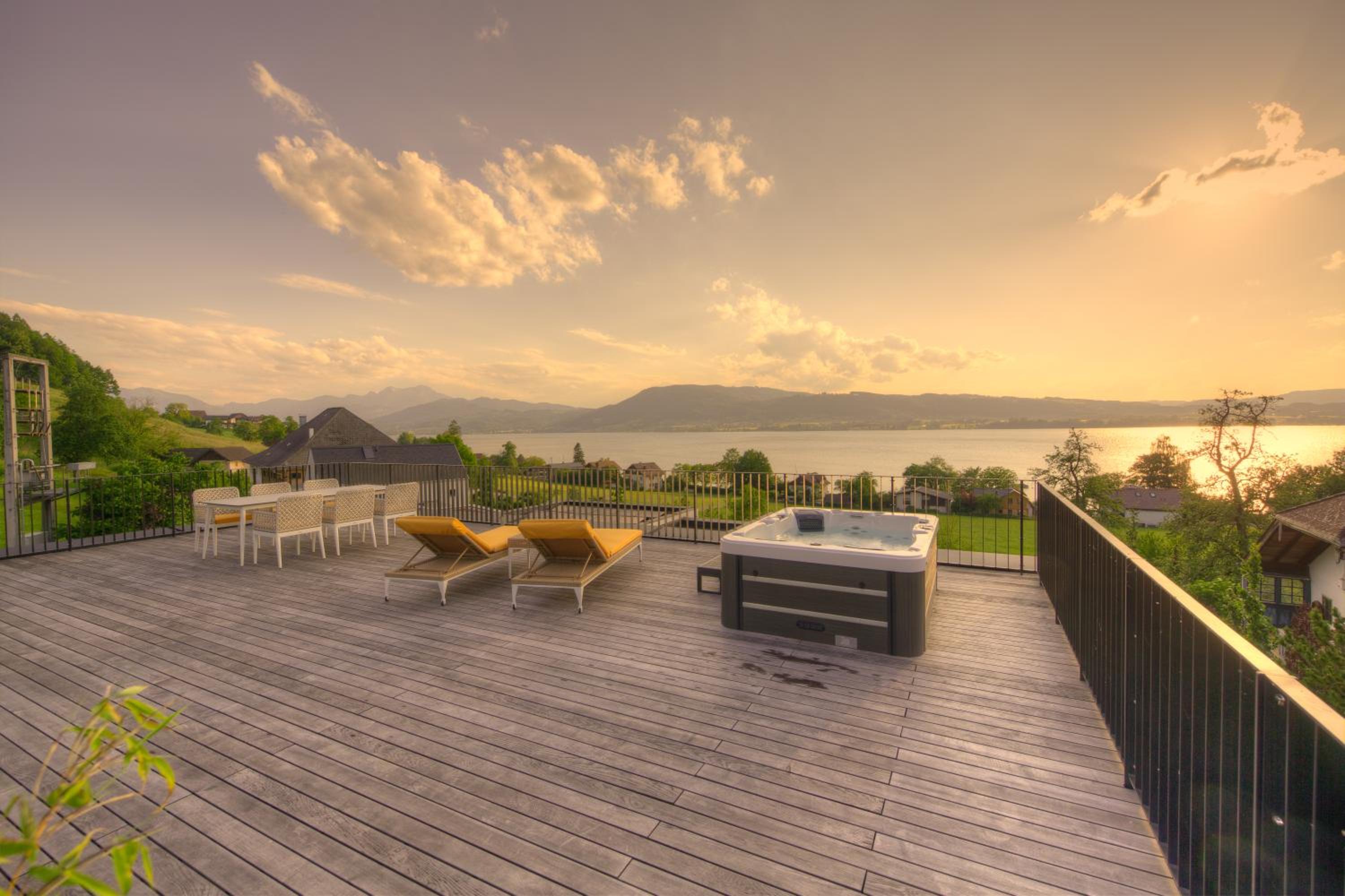 Der Seeblick ist atemberaubend und in allen Räumen zu genießen. Zusätzlich lädt eine große Terrasse mit Whirlpool zum Entspannen ein.