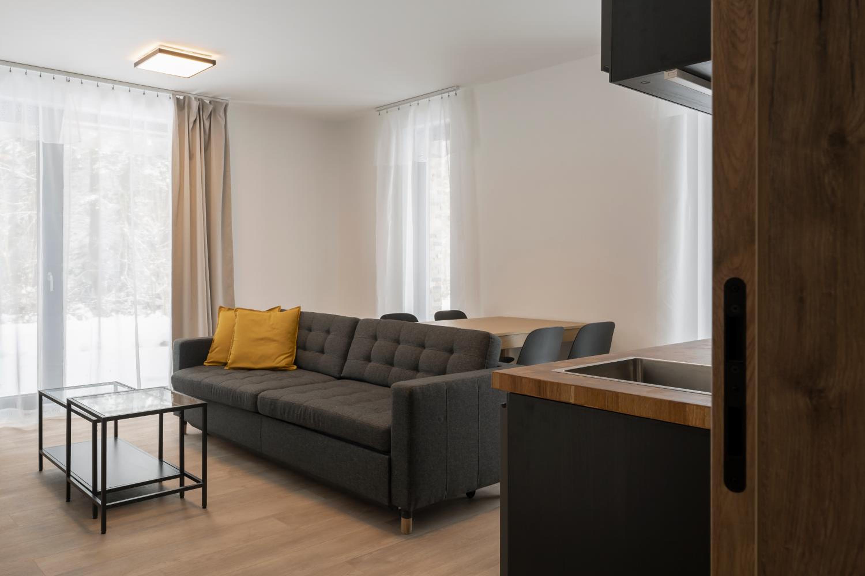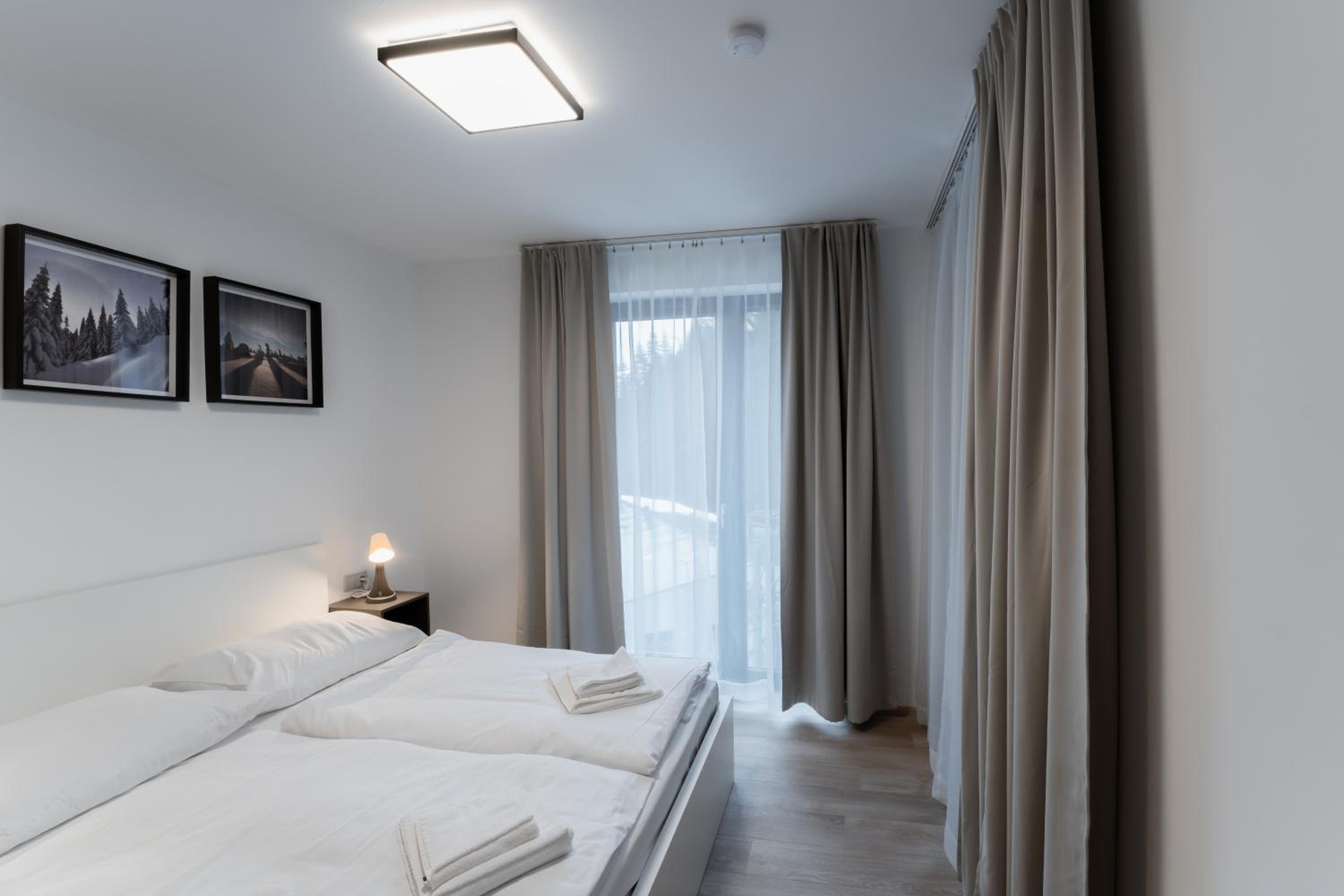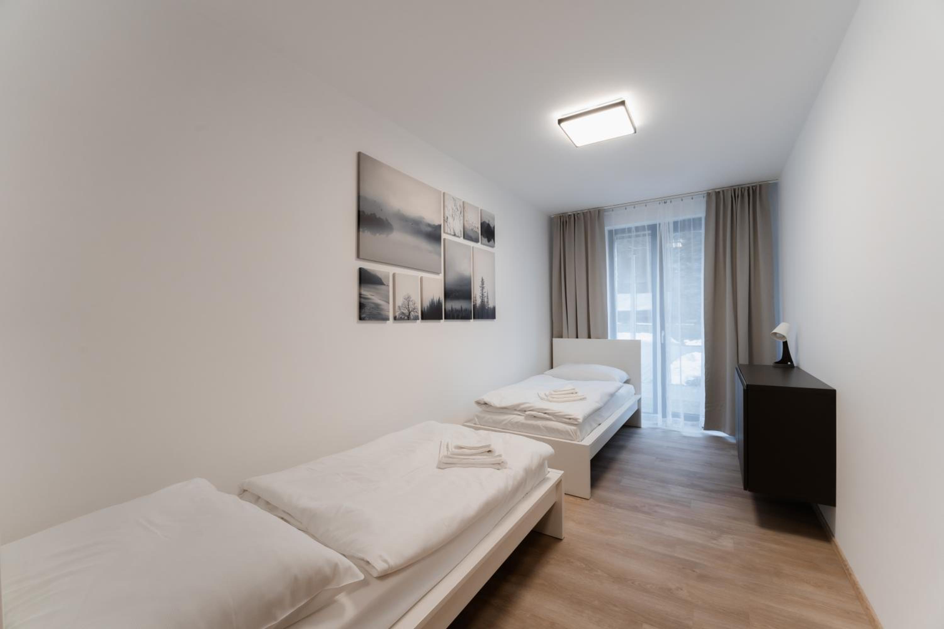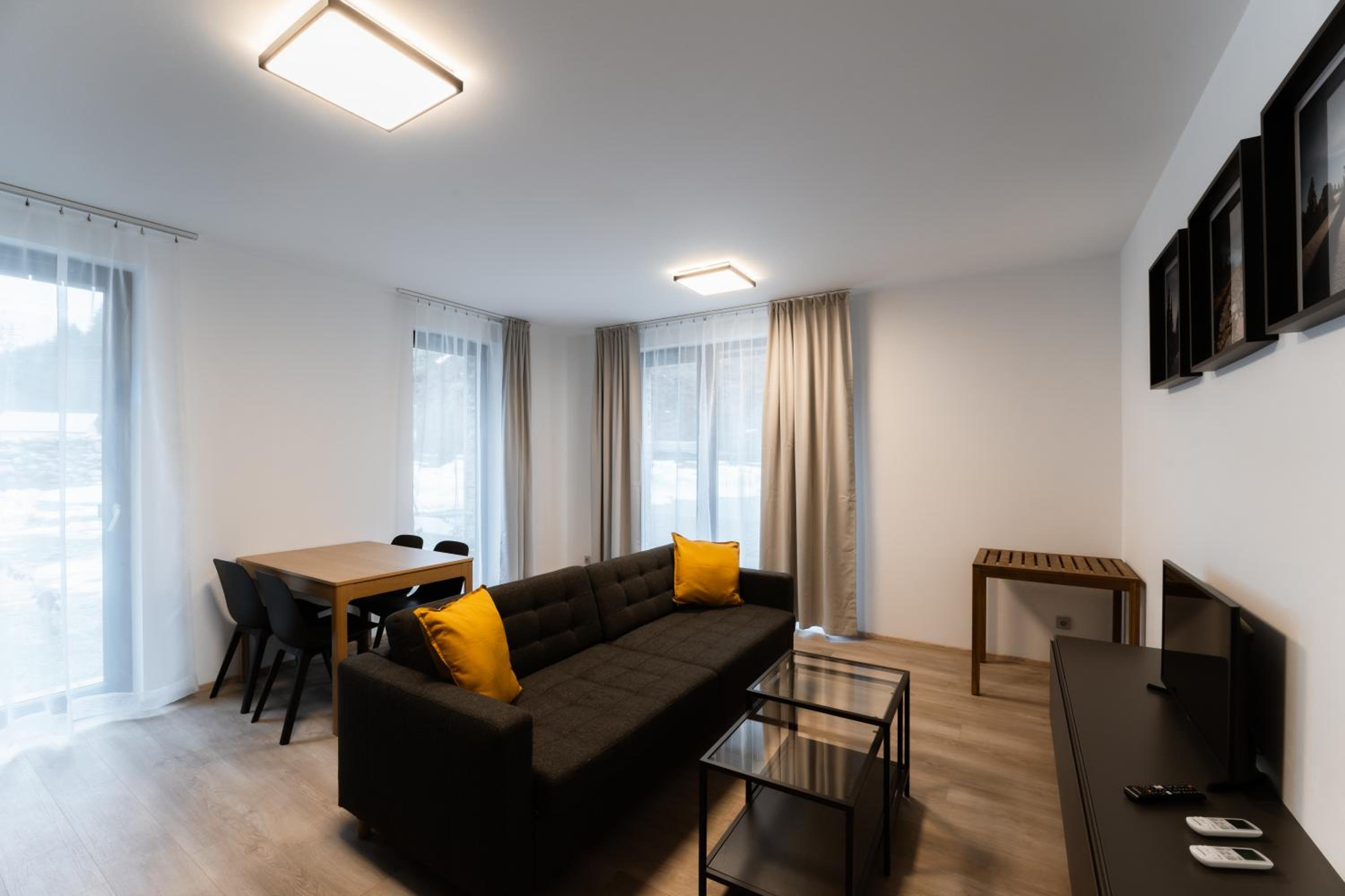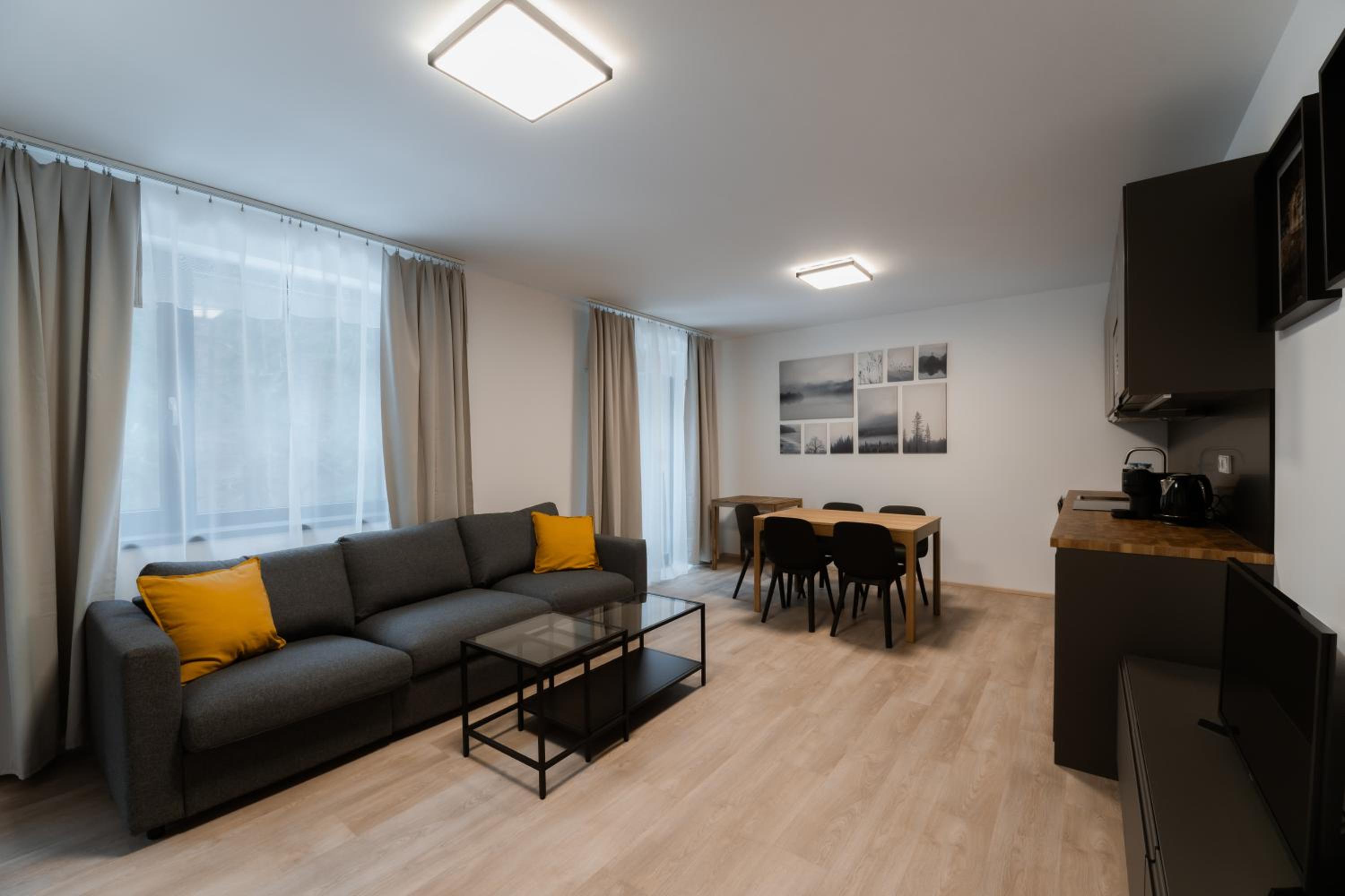 Clean, modern, comfy apartments in good location. Quiet despite being very well communicated with ski resort. Well equipped kitchen and bathrooms.