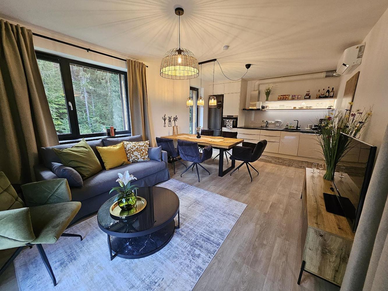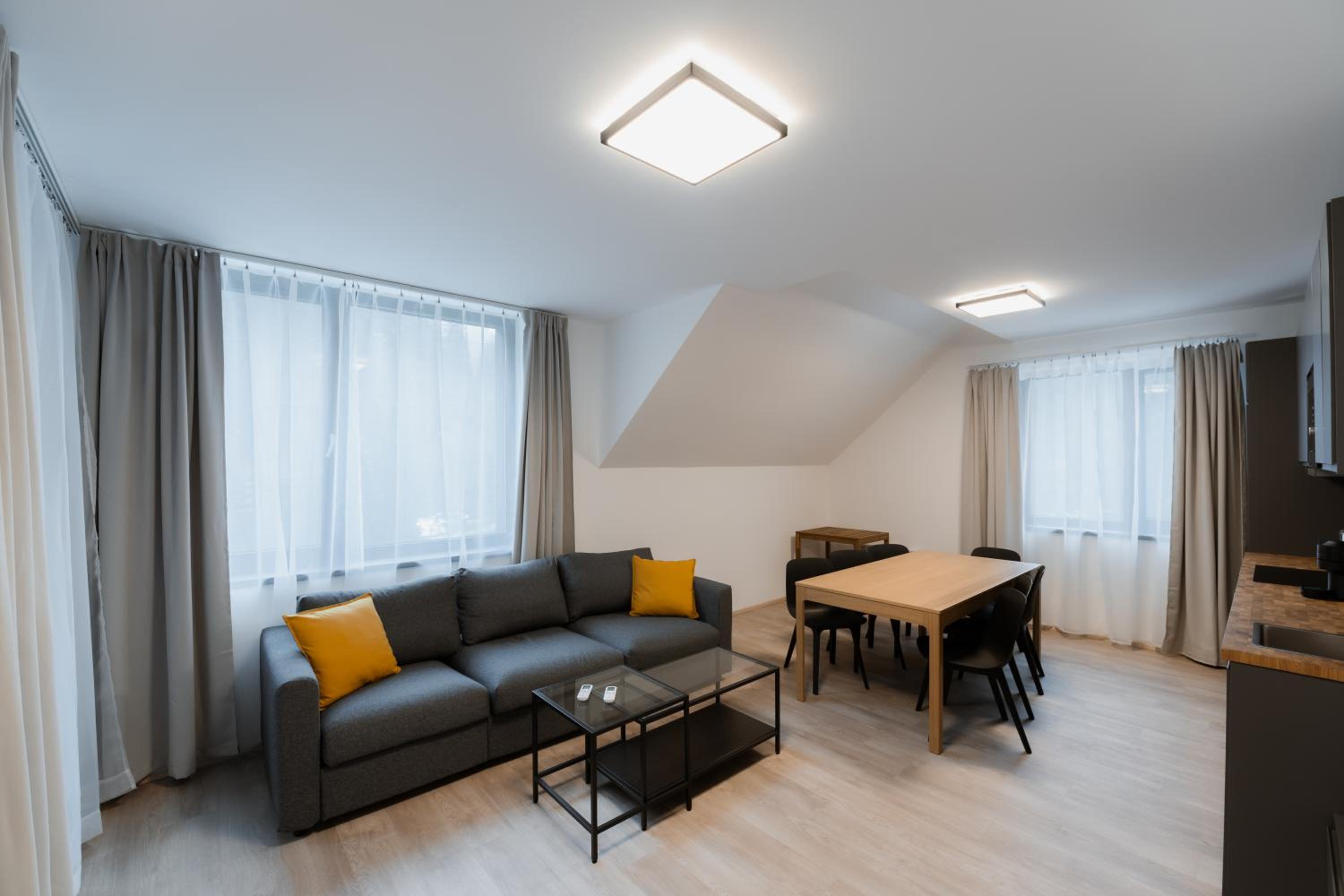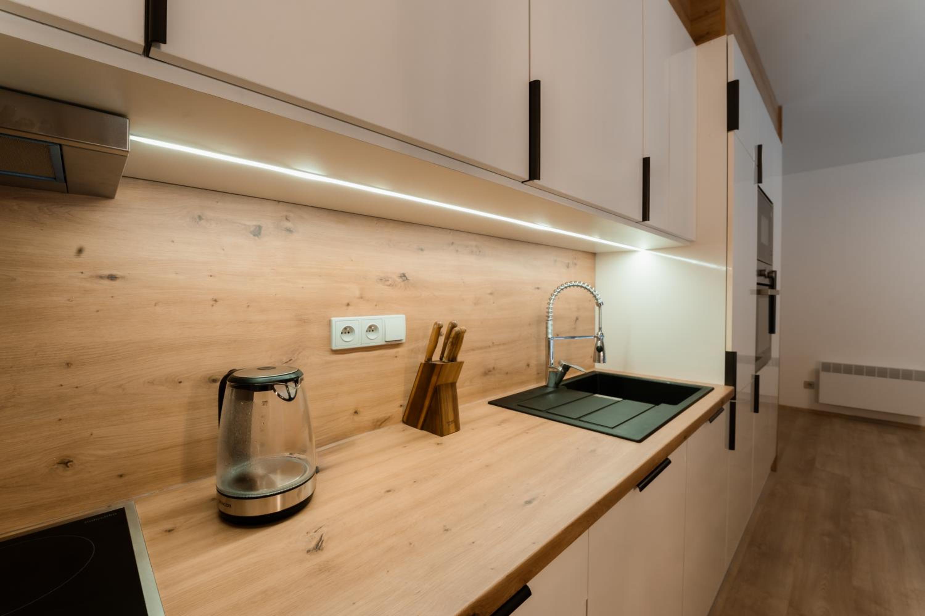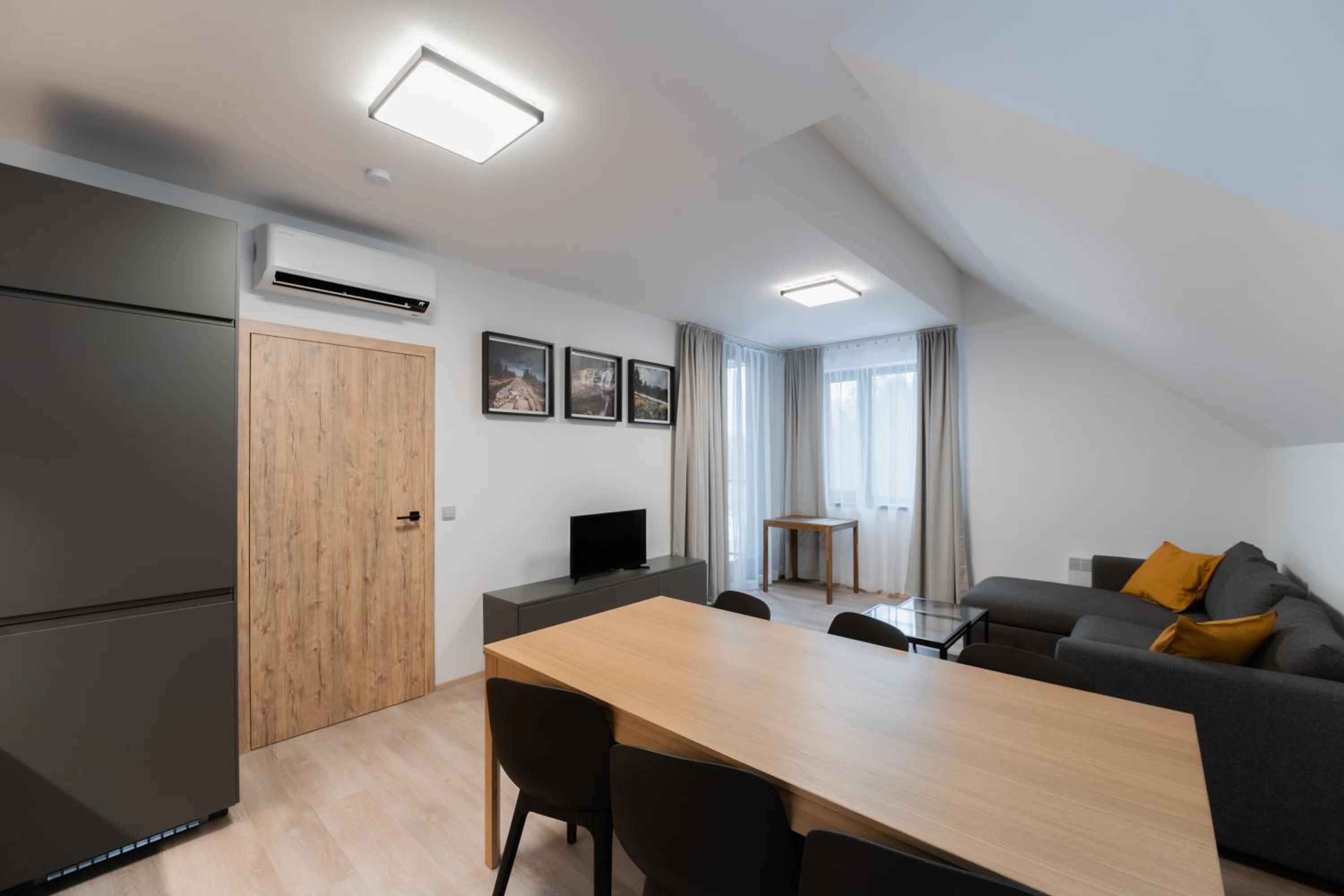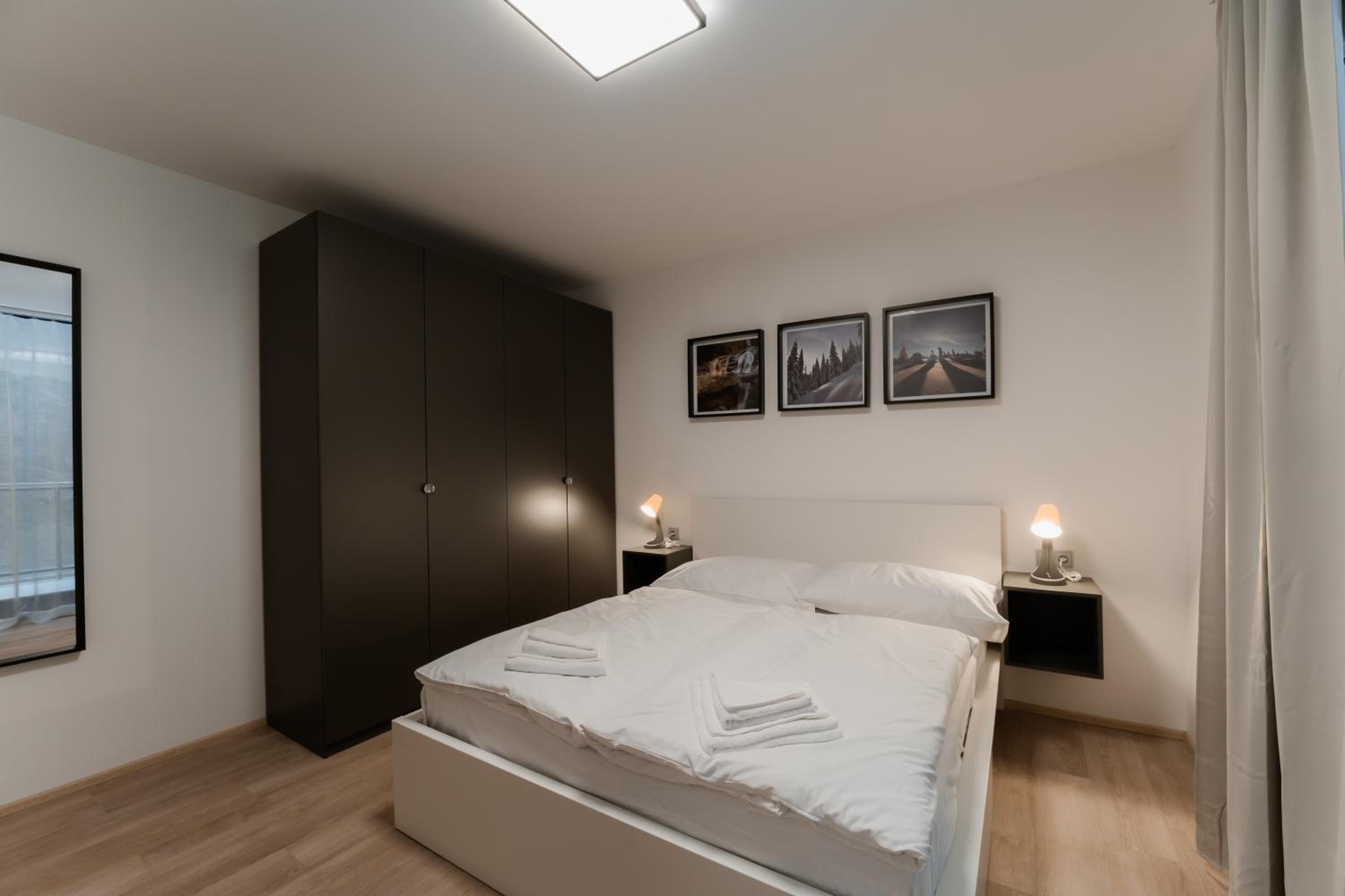 Clean, modern, comfy apartments in good location. Quiet despite being very well communicated with ski resort. Well equipped kitchen and bathrooms.