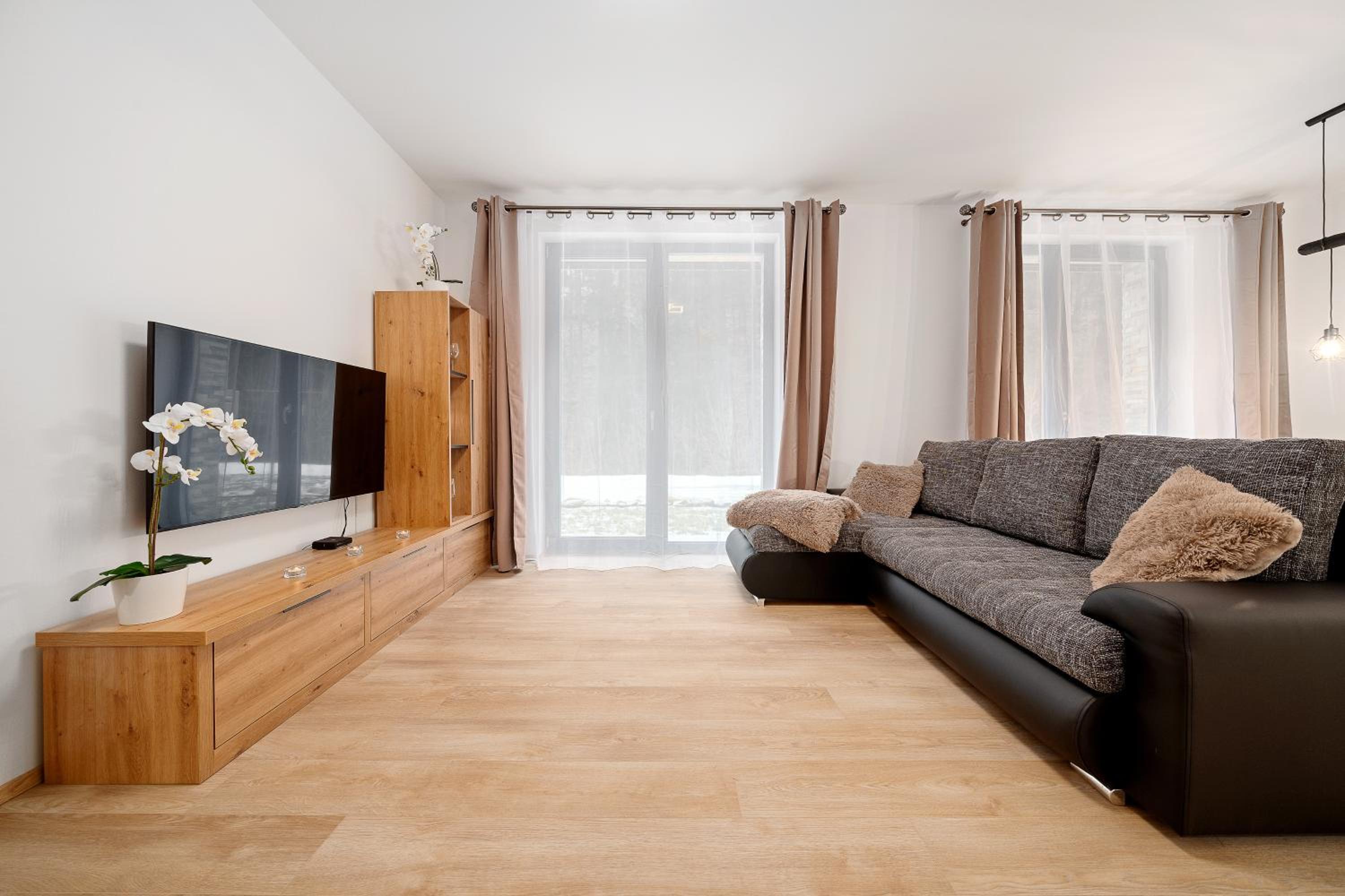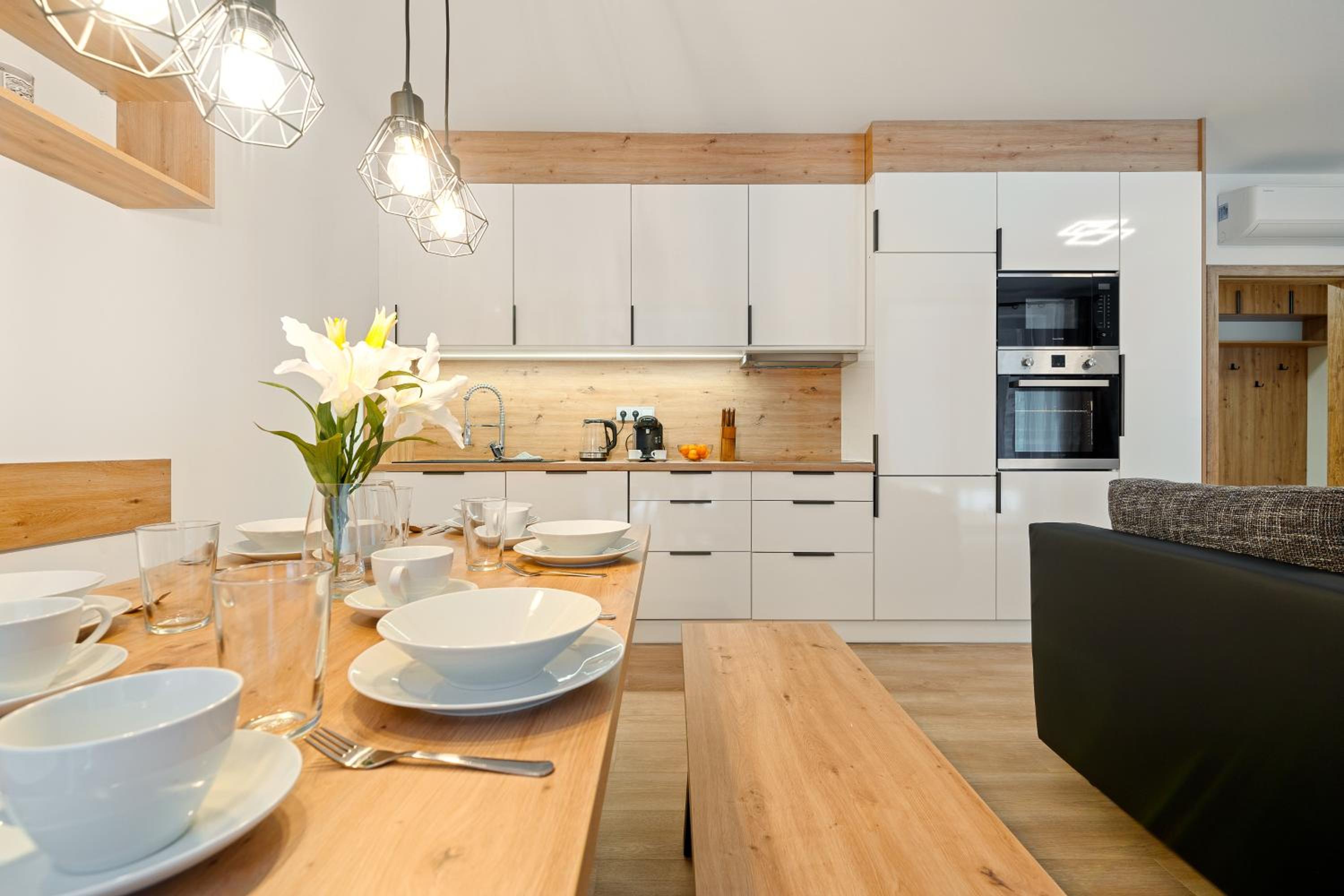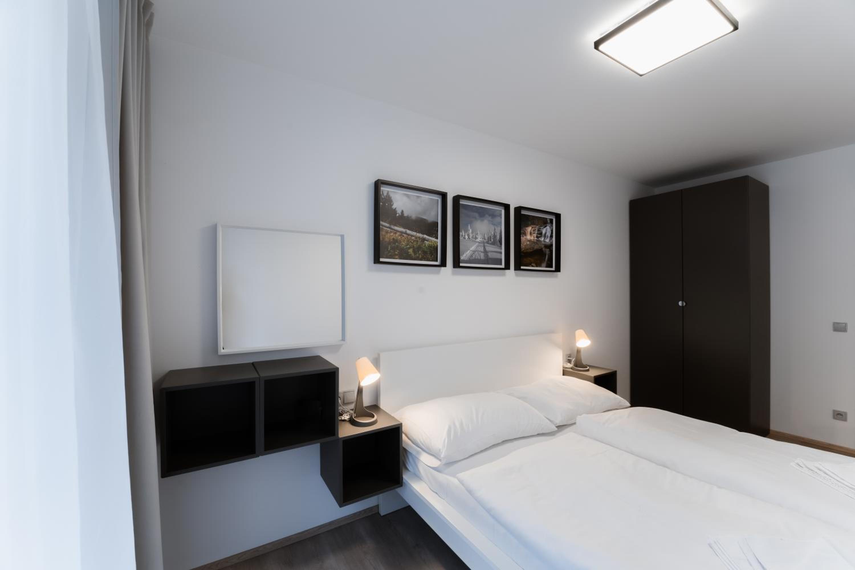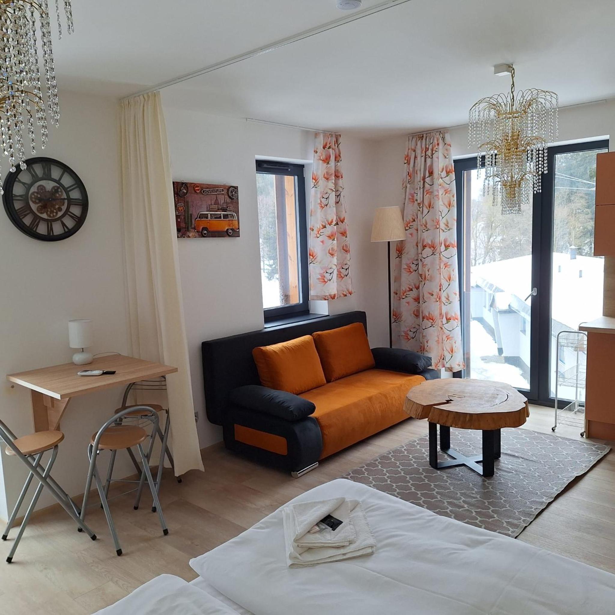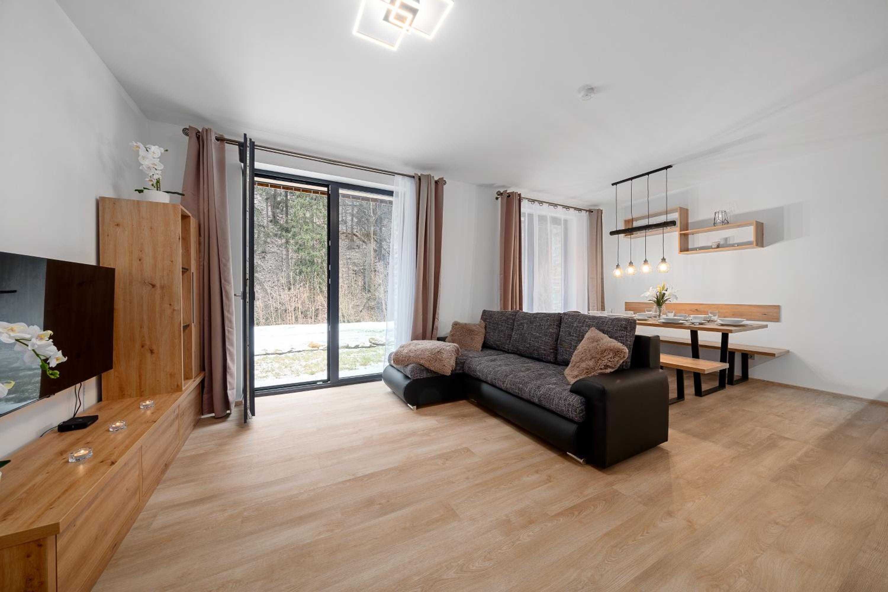Clean, modern, comfy apartments in good location. Quiet despite being very well communicated with ski resort. Well equipped kitchen and bathrooms.