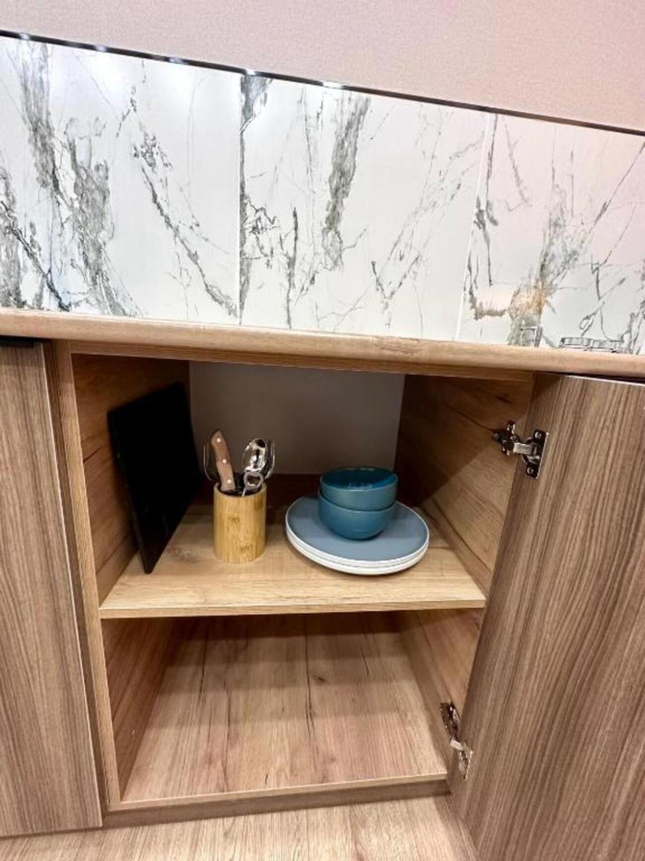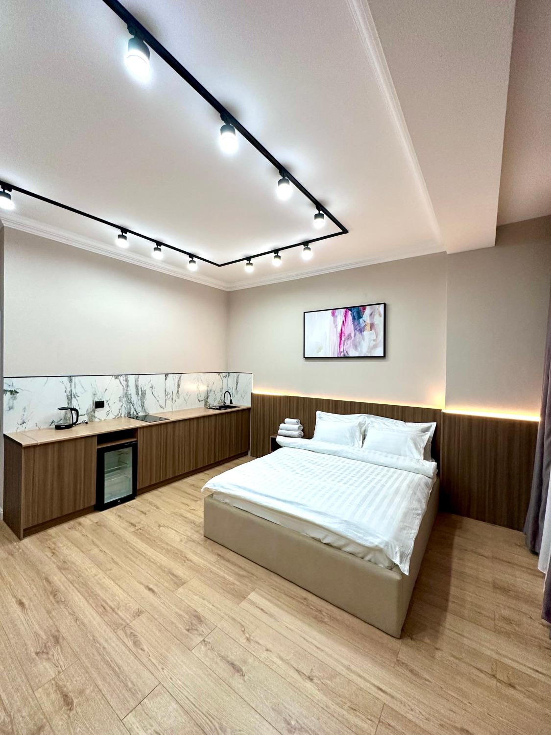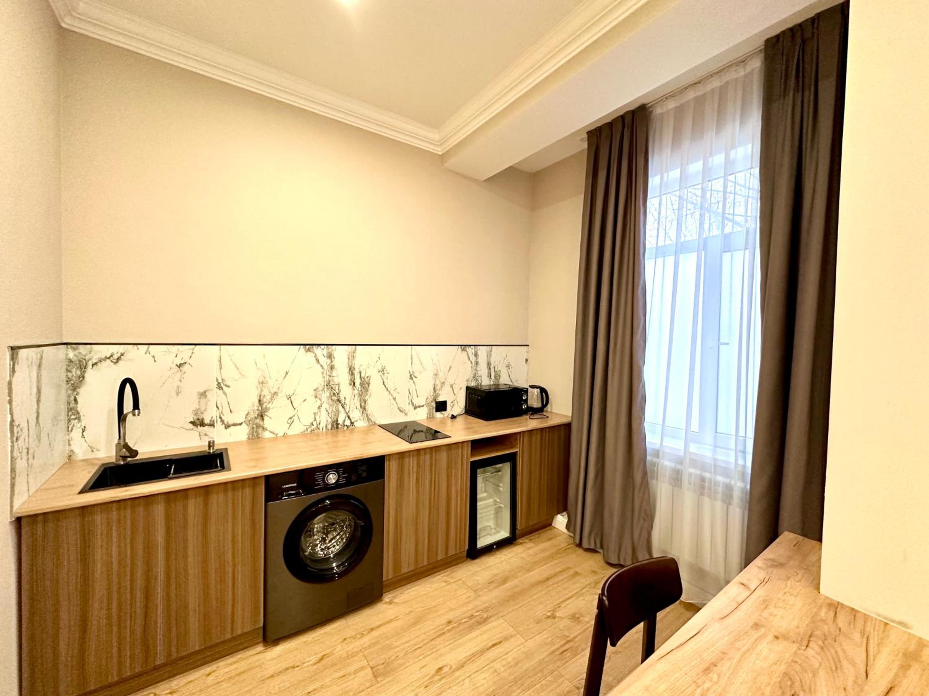 Номер очень просторный, в ванной большая душевая, в номере свежий ремонт, есть большой телевизор и кухня с минимальным набором посуды. В номере сохраняется комфортная температура (мы были в жаркие дни, но в номере было прохладно). Достаточно удобная кровать, хорошие одеяла. В отеле хороший Wi Fi. Соседей мы ни разу не слышали. Окна заклеены матовой пленкой, потому что вид там на соседский двор.