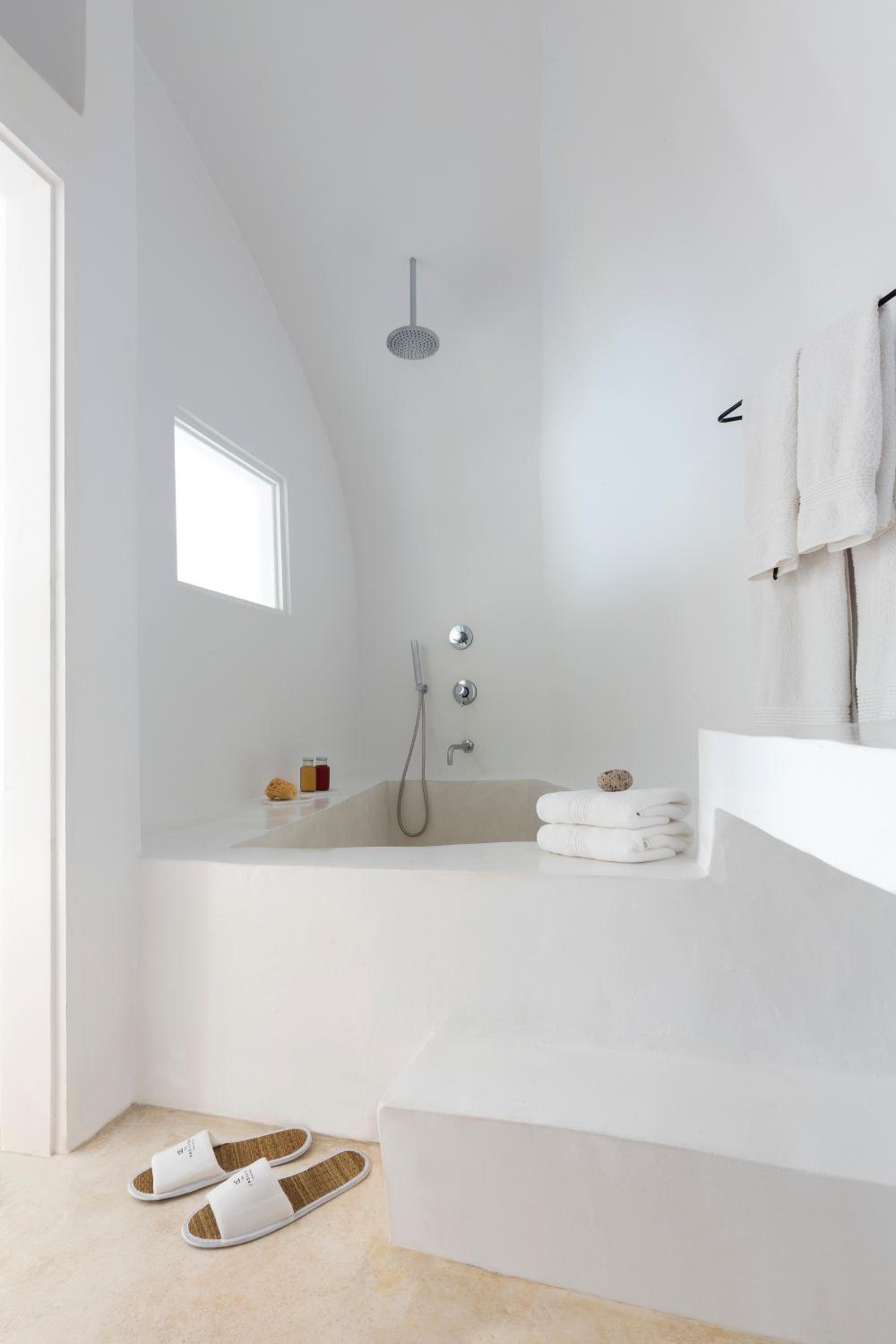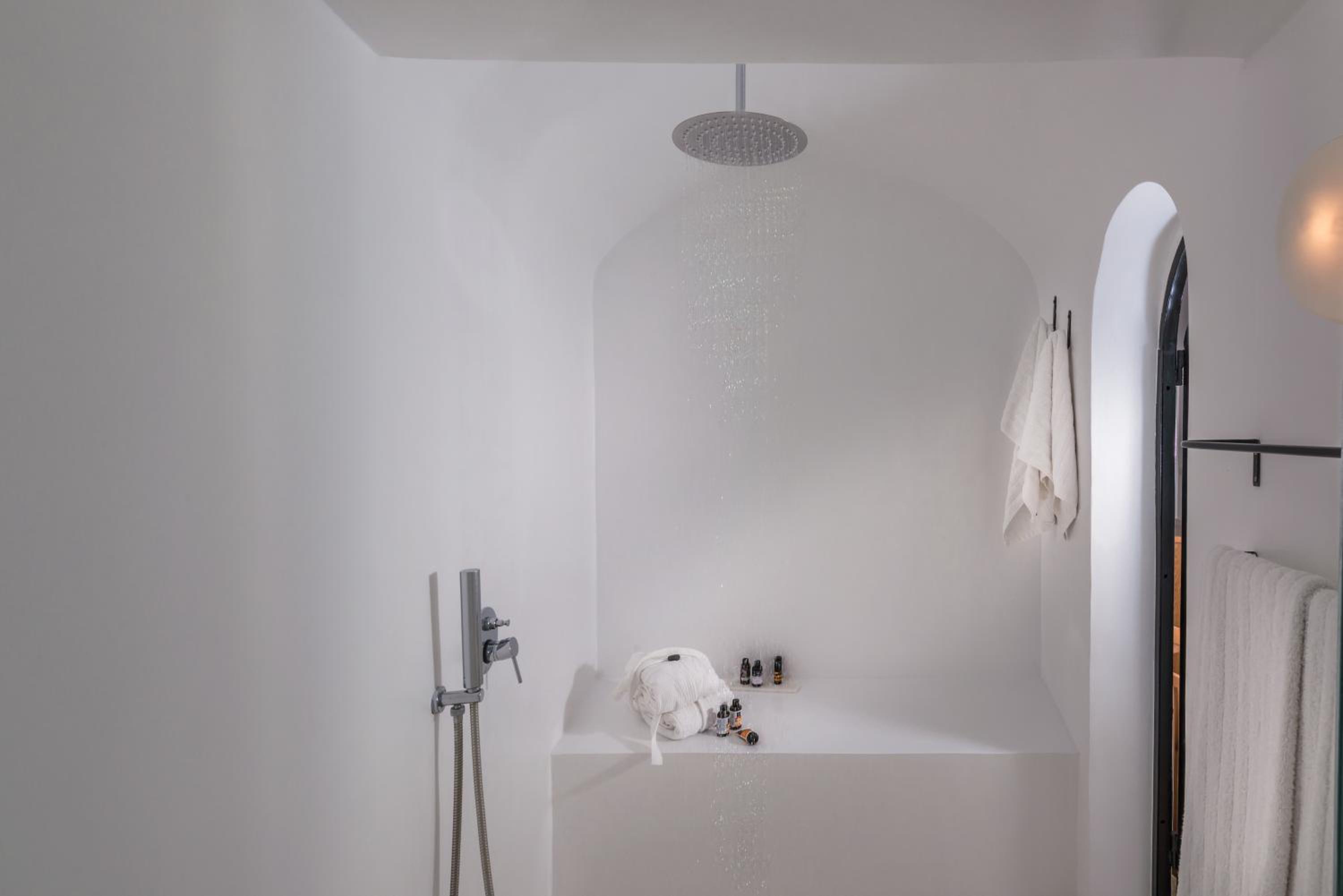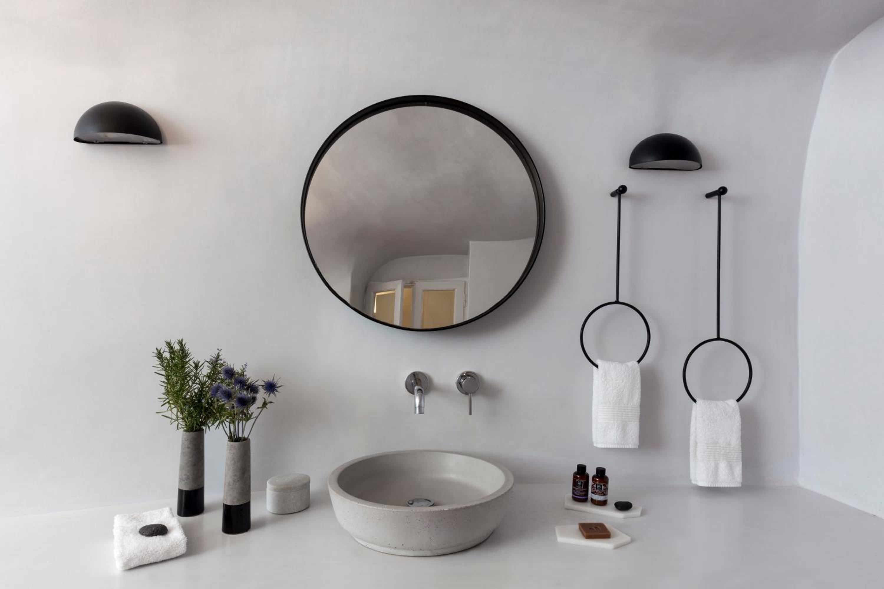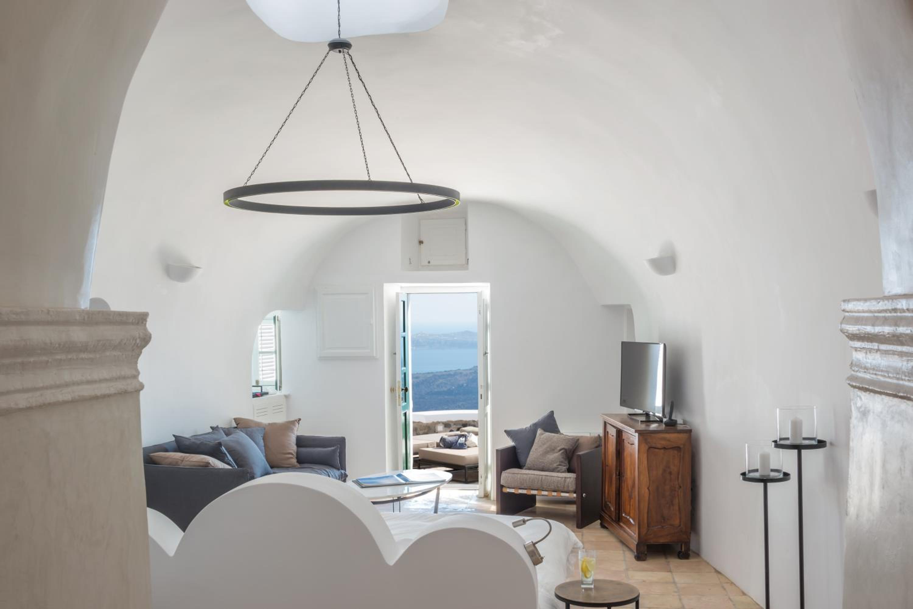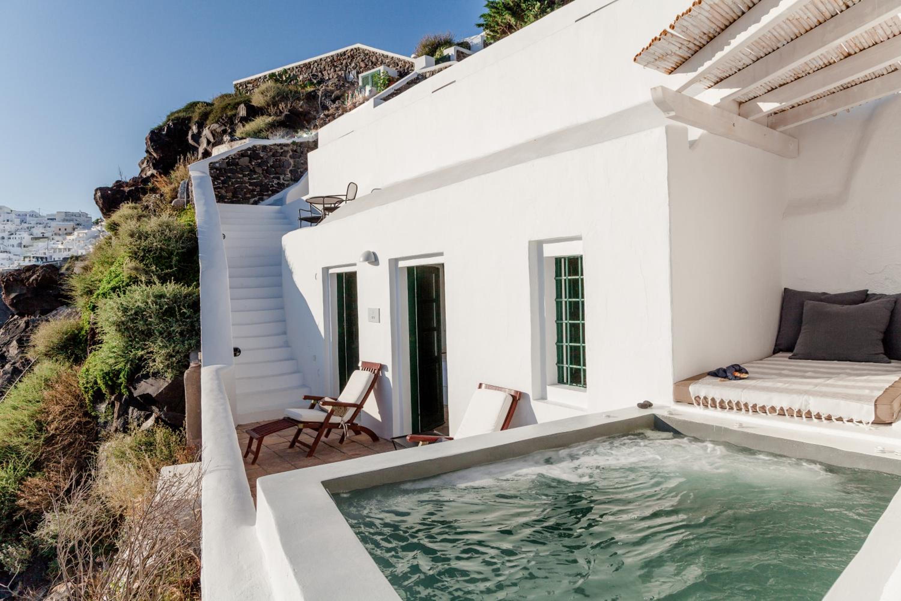 Indulge in elegantly decorated suites offering unique Caldera views, equipped with modern amenities like a Smart TV and complimentary iPad. Some suites even feature an outdoor hot tub or private pool for a truly lavish experience.