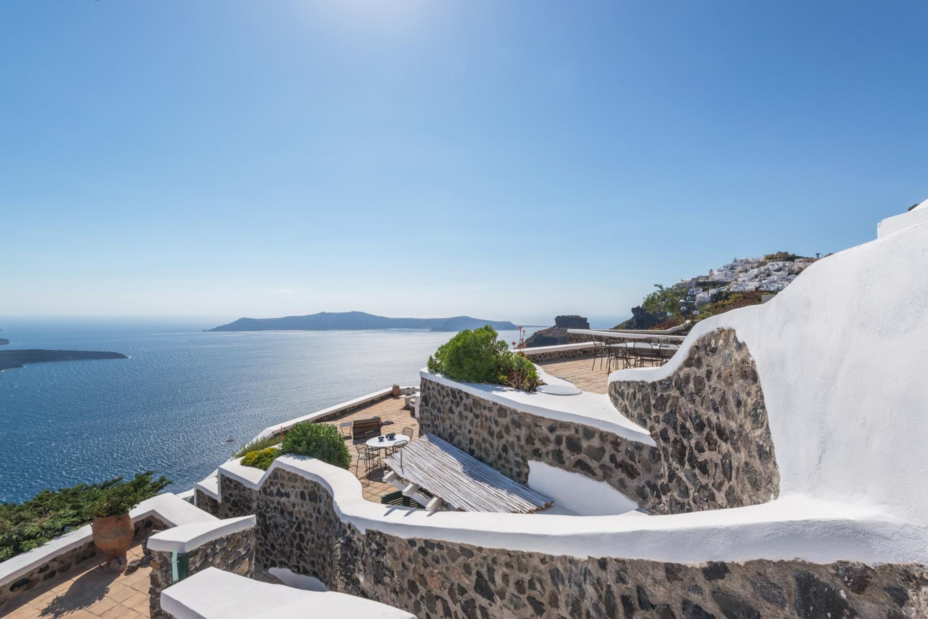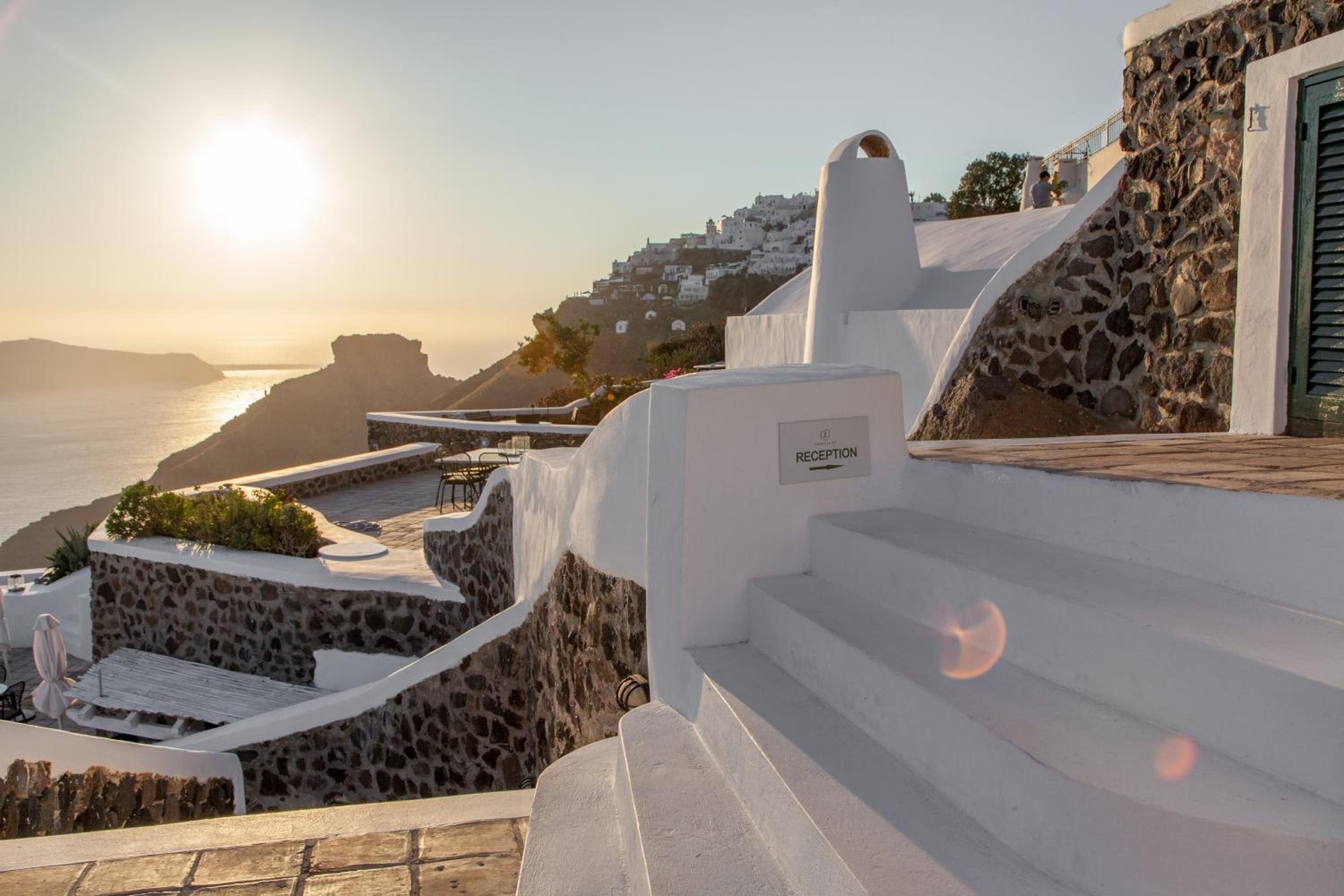 Secluded and quiet but within easy walking distance of Fira. Unlike other nearby hotels, the grounds were totally private. We appreciated the warm welcome and excellent service and enjoyed tasty breakfasts and dinners served on the patio of our room. The bed was very comfortable. Great view of the sunset each night was icing on the cake!