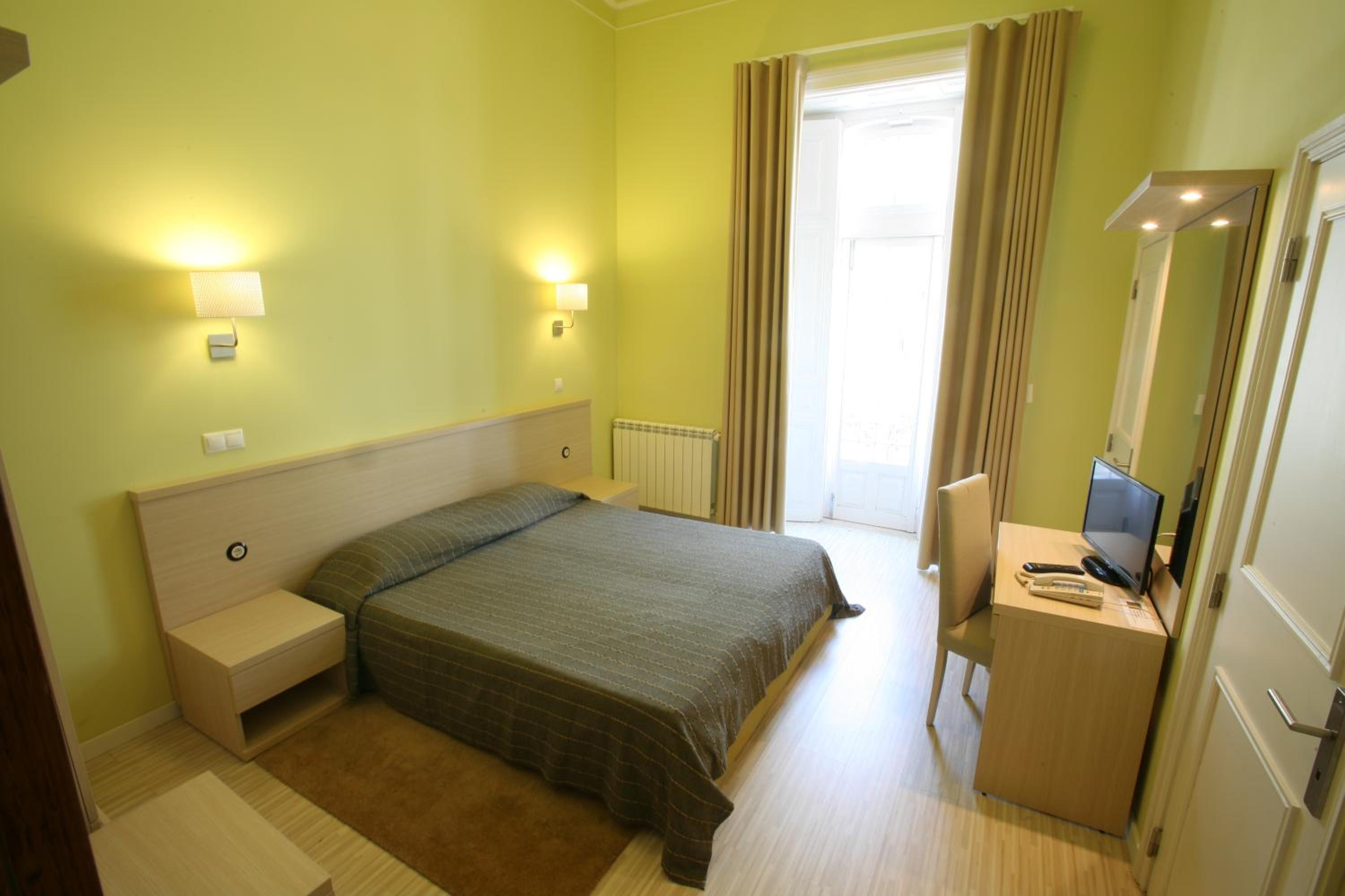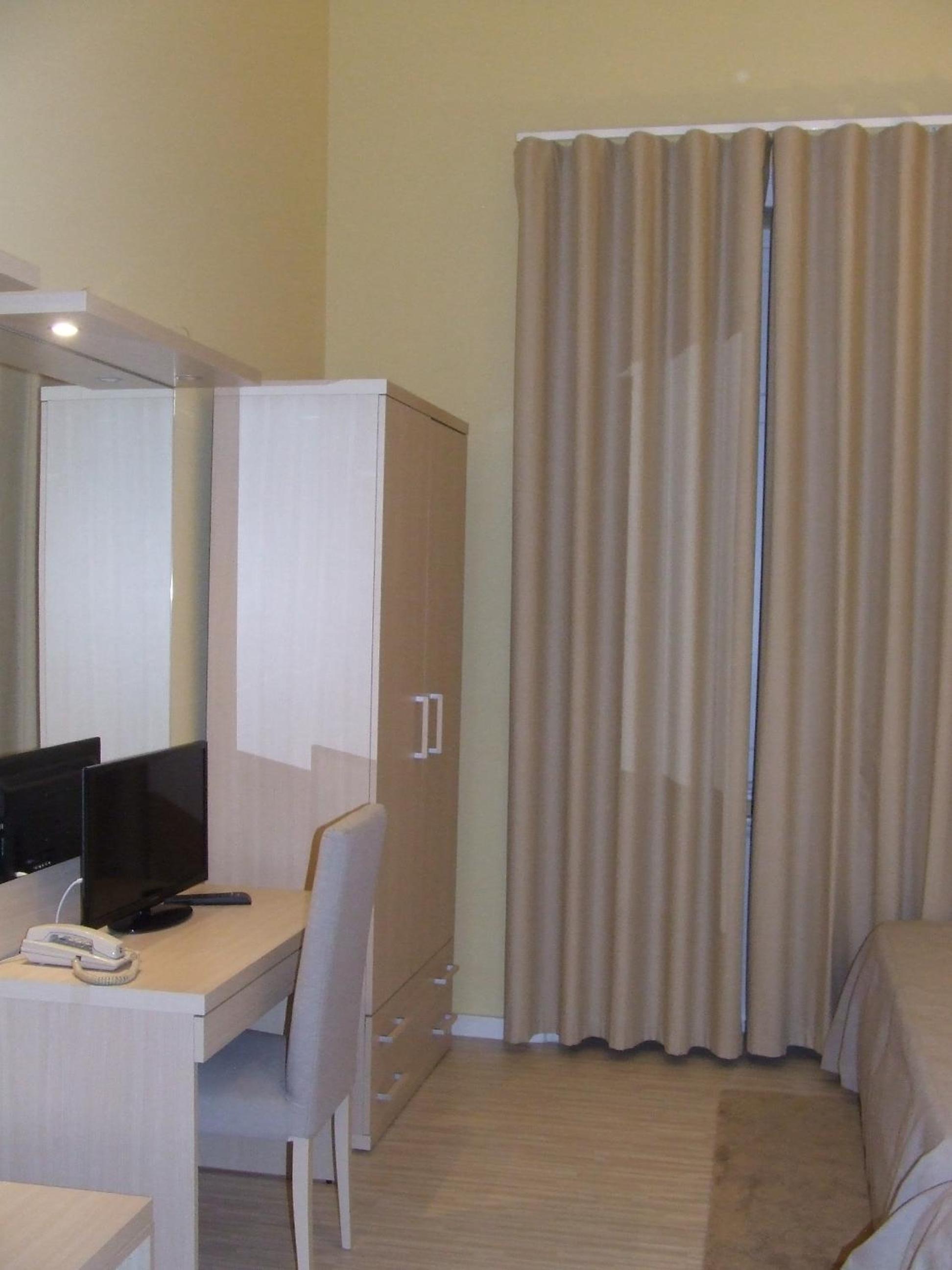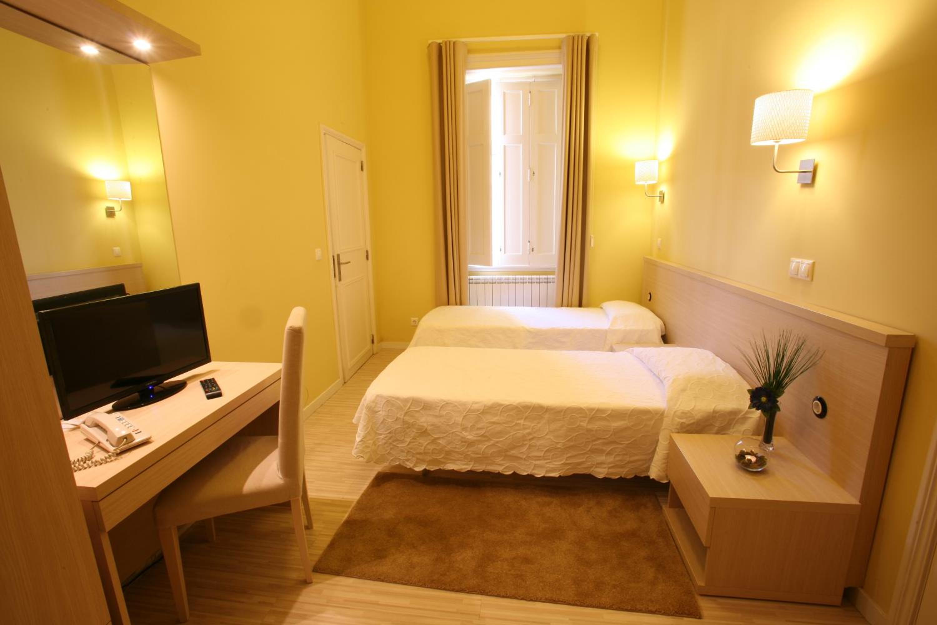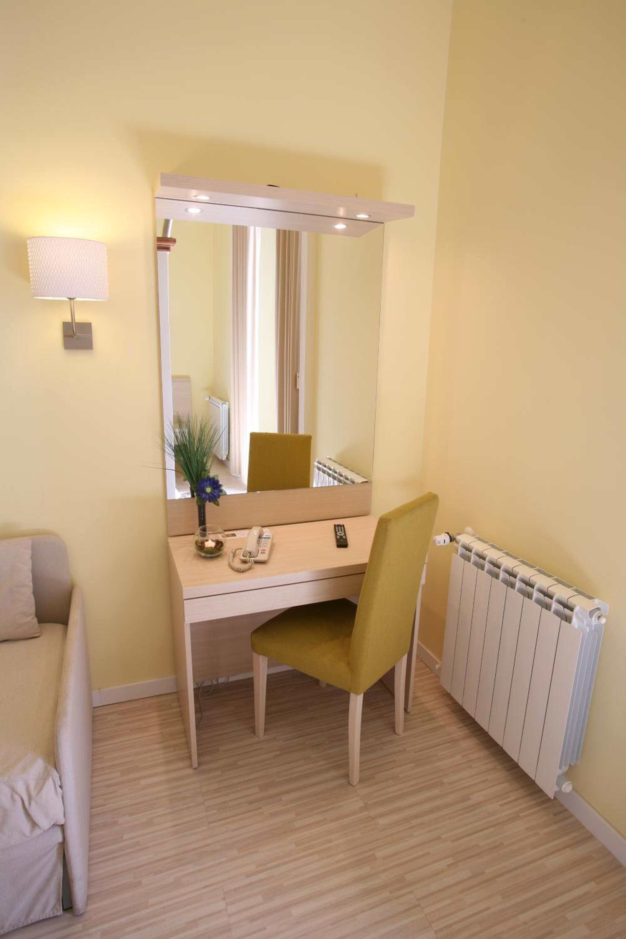 The rooms at Hotel Primavera feature a minimalist design with essential amenities such as a desk, flat-screen TV, and a private bathroom with a shower. The light wood furnishings create a warm and inviting atmosphere for guests to unwind after a day of sightseeing.