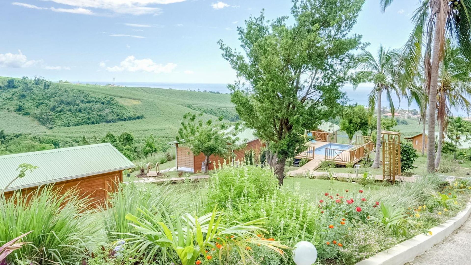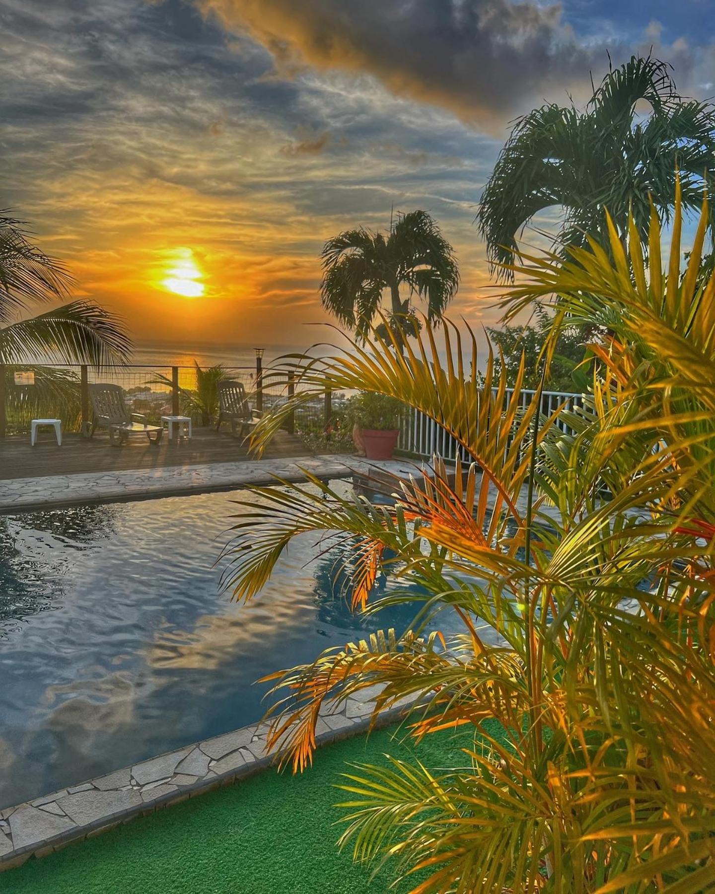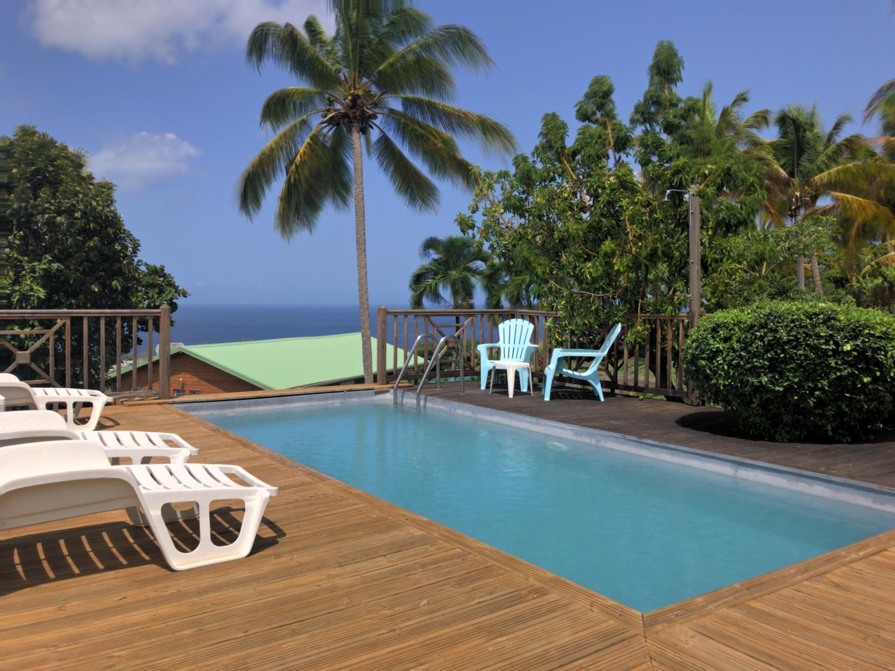 Garden Oasis: Step into a lush paradise at Résidence Paradis Tropical, where an extensive garden surrounds a sun terrace and sparkling swimming pool, offering a tranquil retreat for guests.
