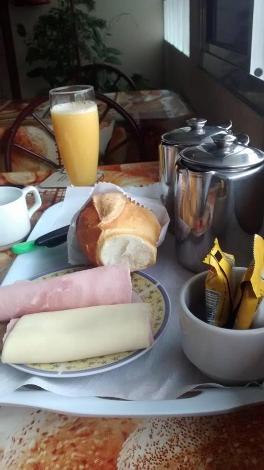 No café da manhã a funcionária,serviu para nós café com leite,mussarela e pão.Para os demais hóspedes foram servidos: Café com leite, pão,frios,suco e bolo.