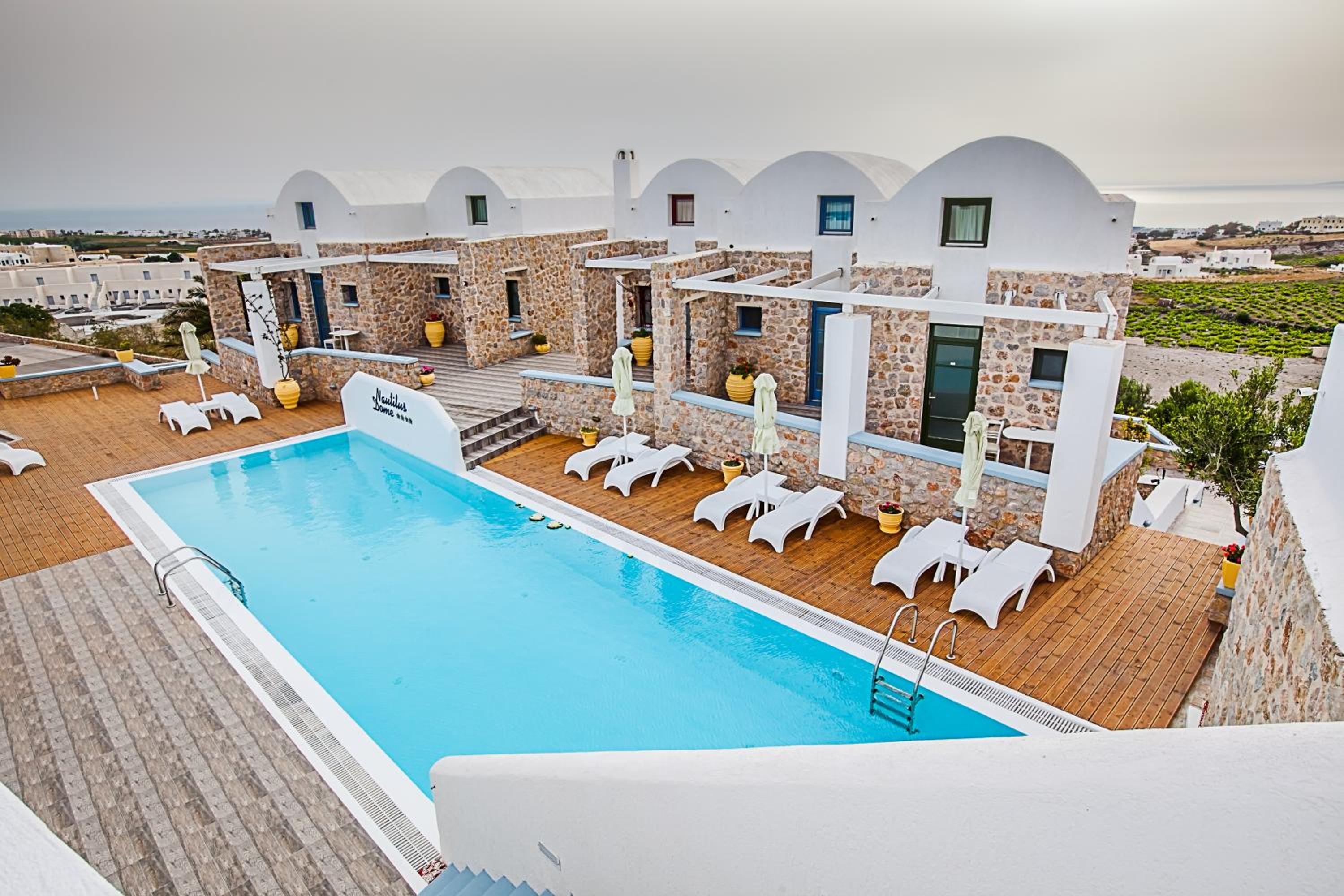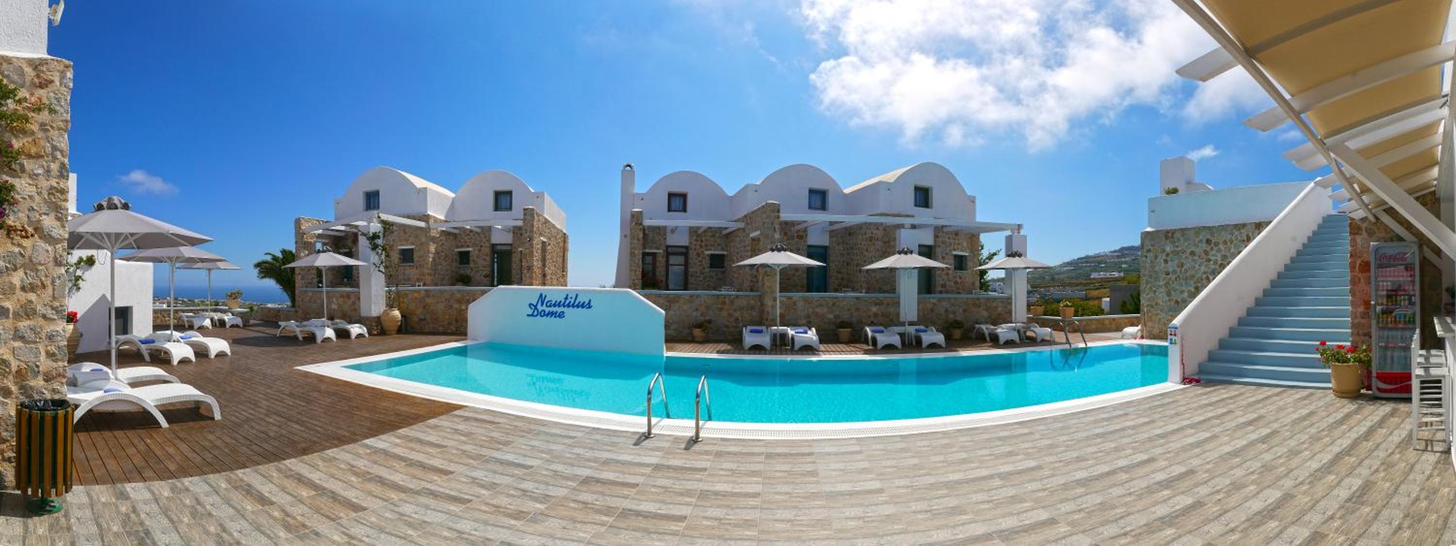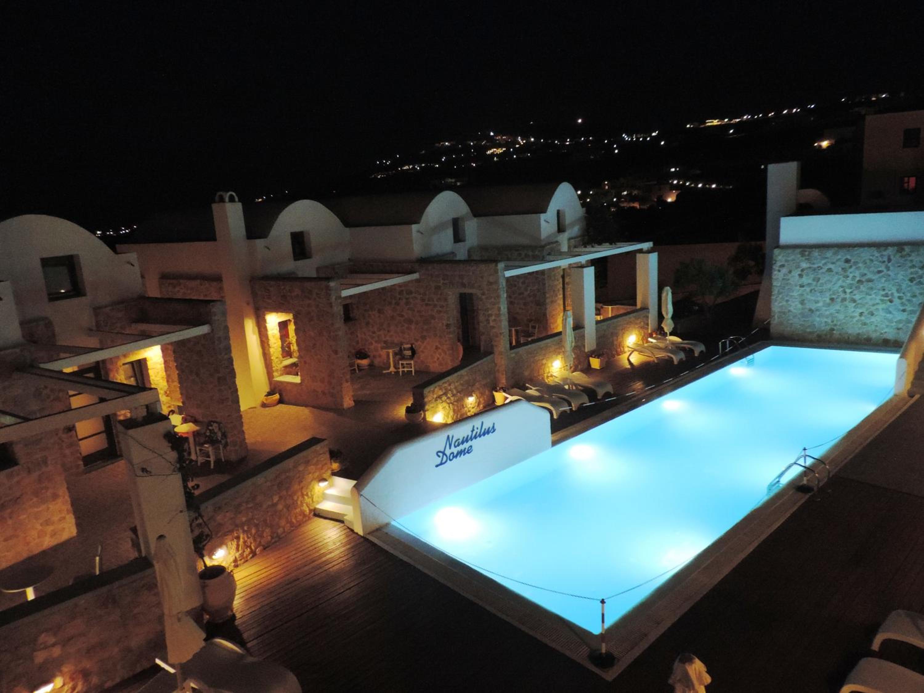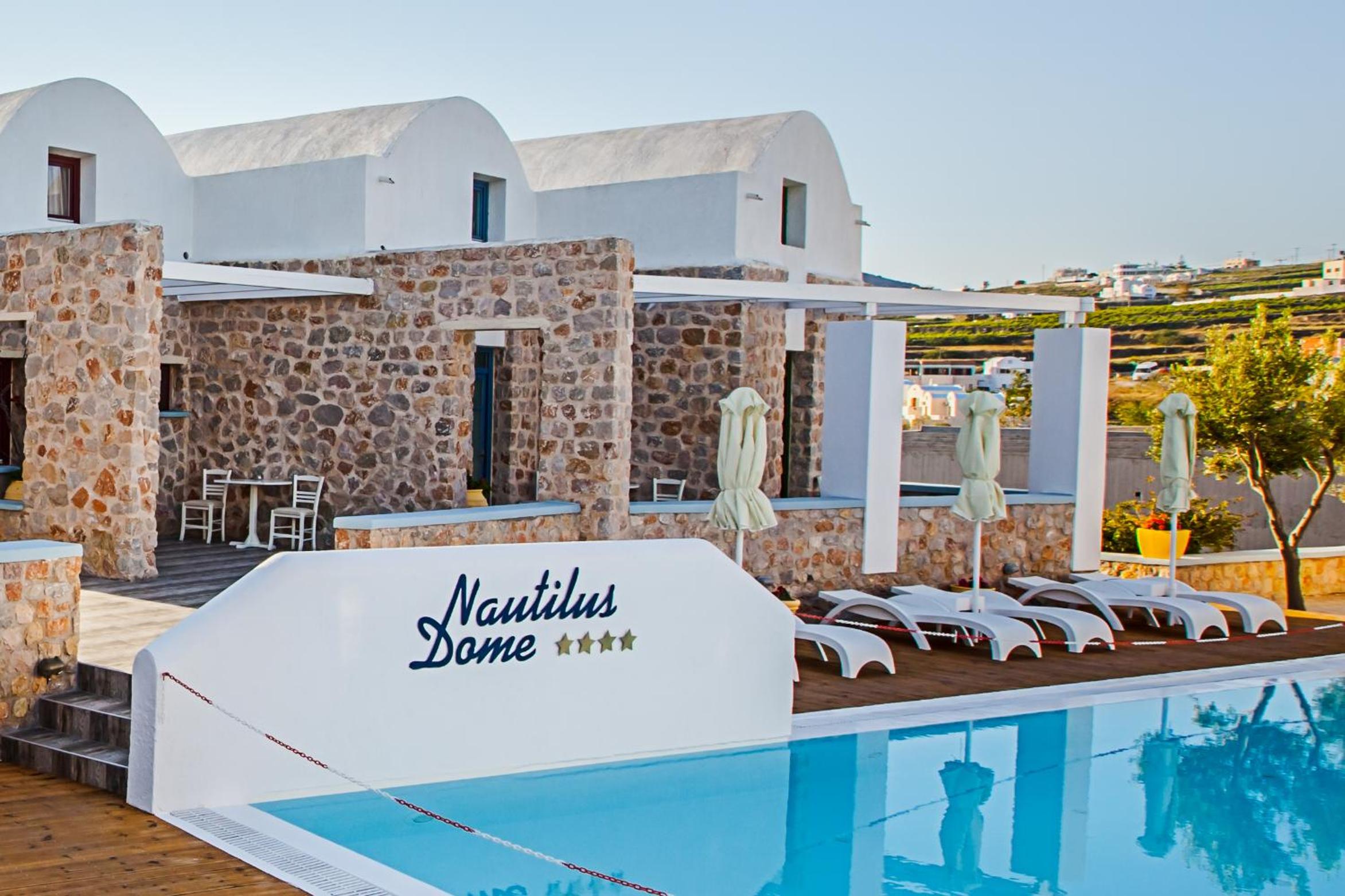 Nautilus Dome Suites offers a luxurious stay on the side of the caldera, boasting a pool with a wooden deck and breathtaking views of the Aegean Sea and volcano. The traditionally decorated suites feature private balconies or patios, perfect for enjoying the garden, volcano, or sea views.