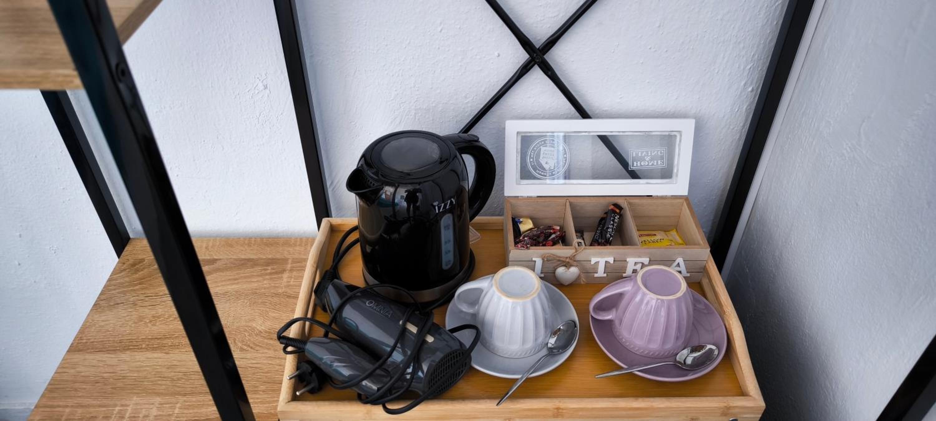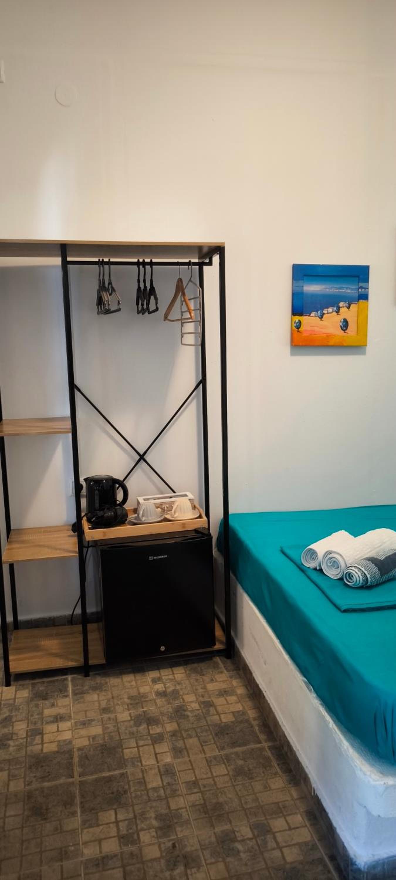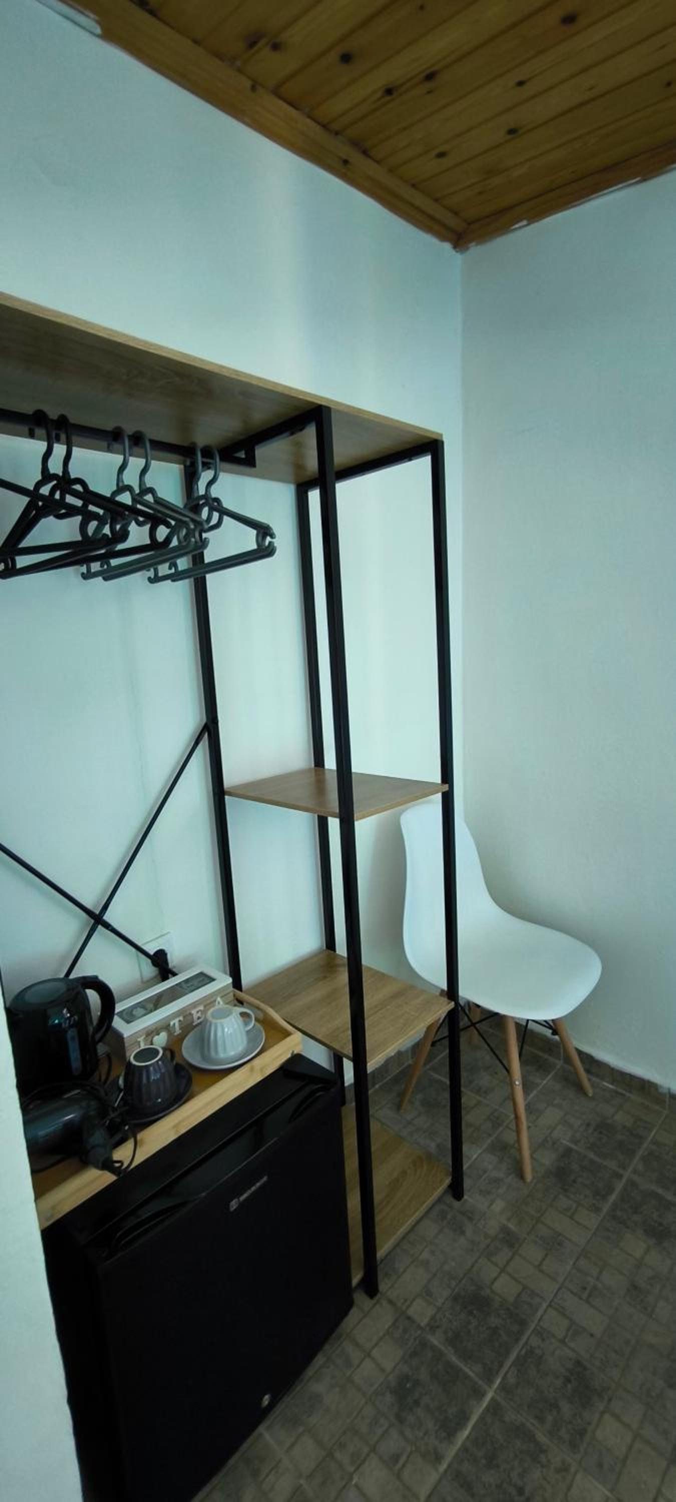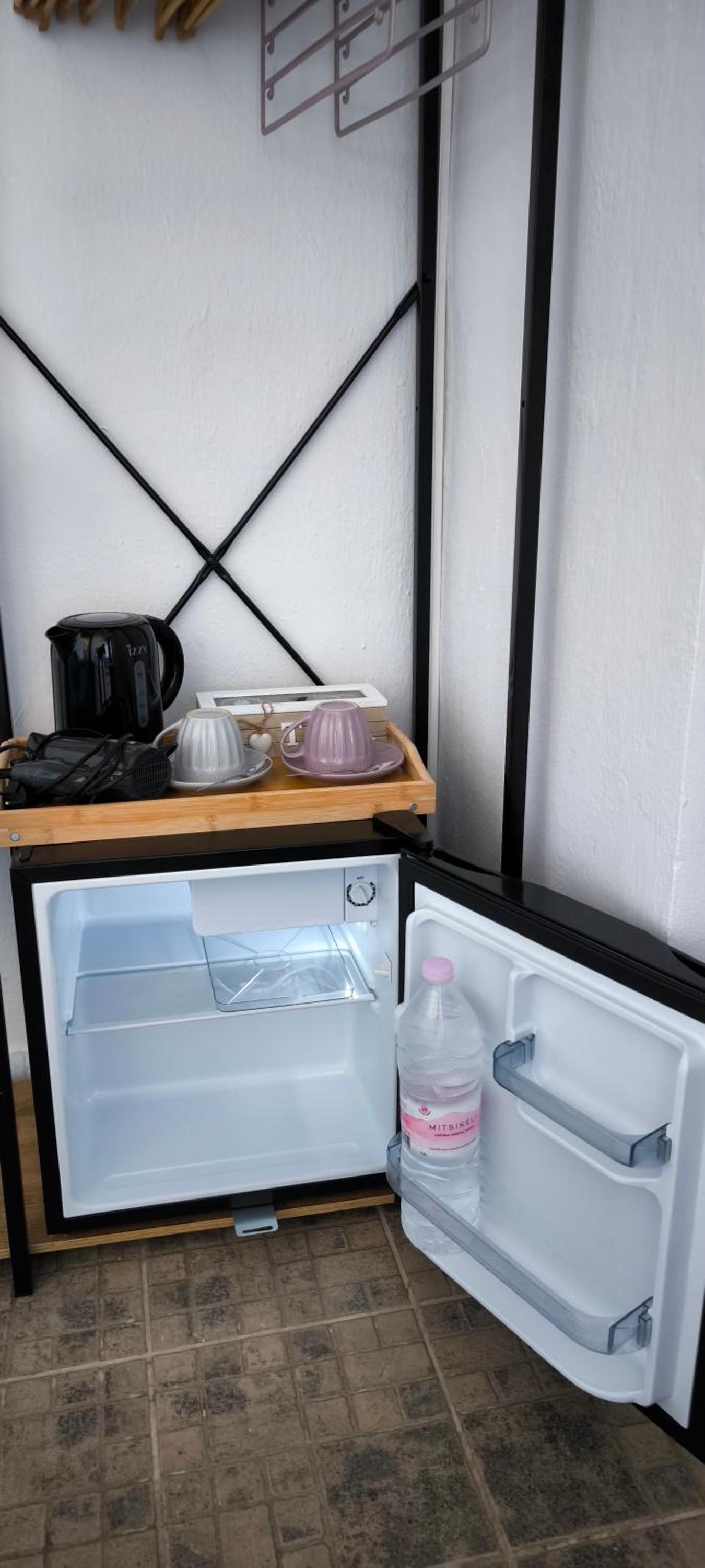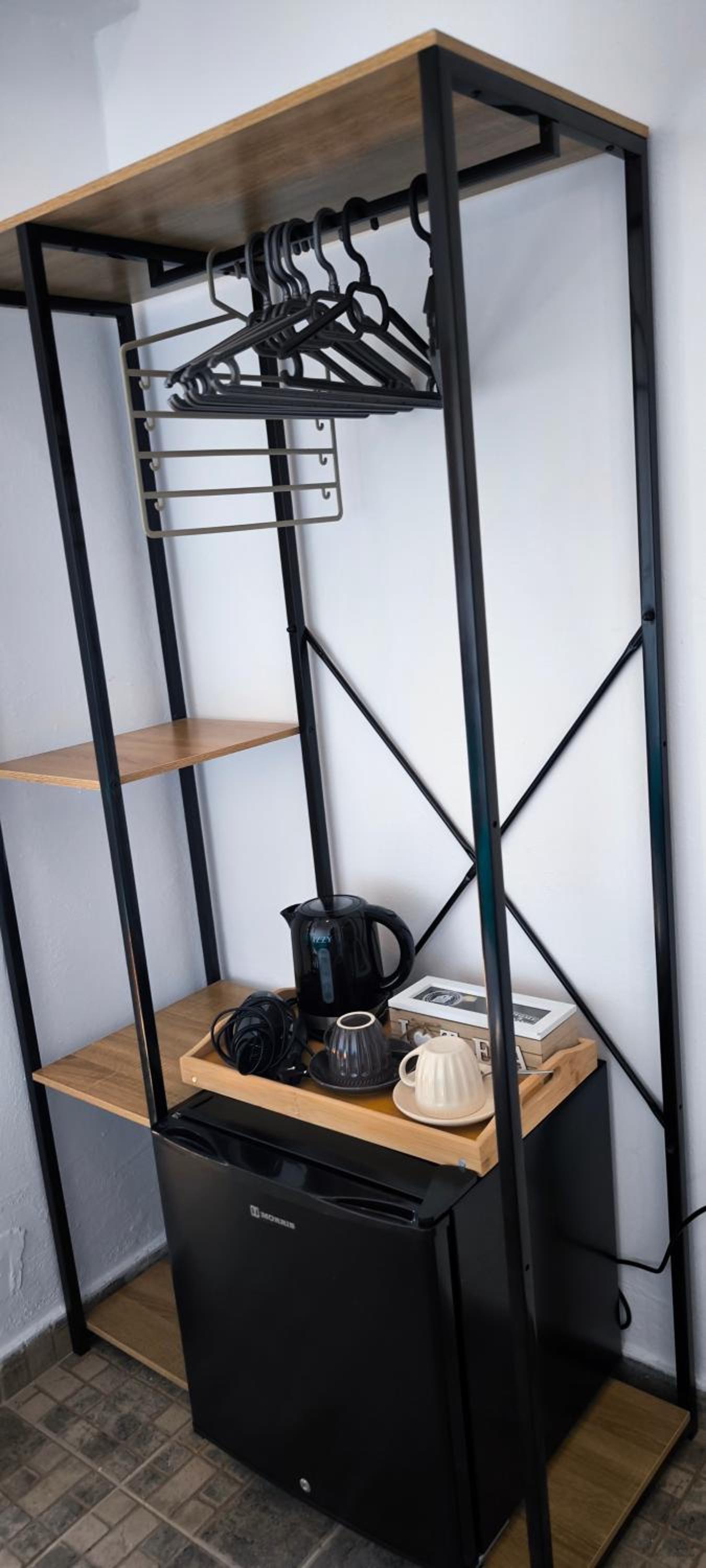 The fridge is too small and there is no wardrobe. There are some shelves, but still the room lacks better organization.