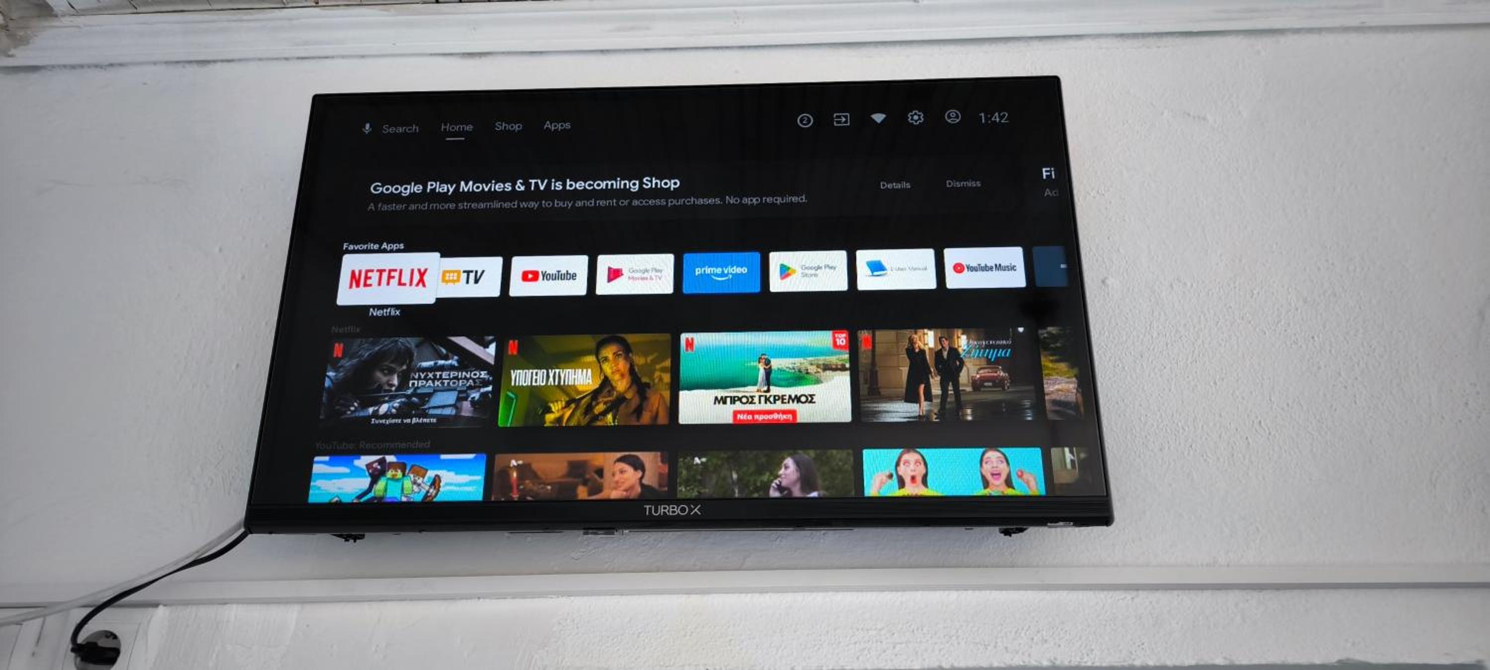 We didn't use the TV, but we noticed that it is too high, just under the ceiling and you have to view it at 45 or even 60 degrees.