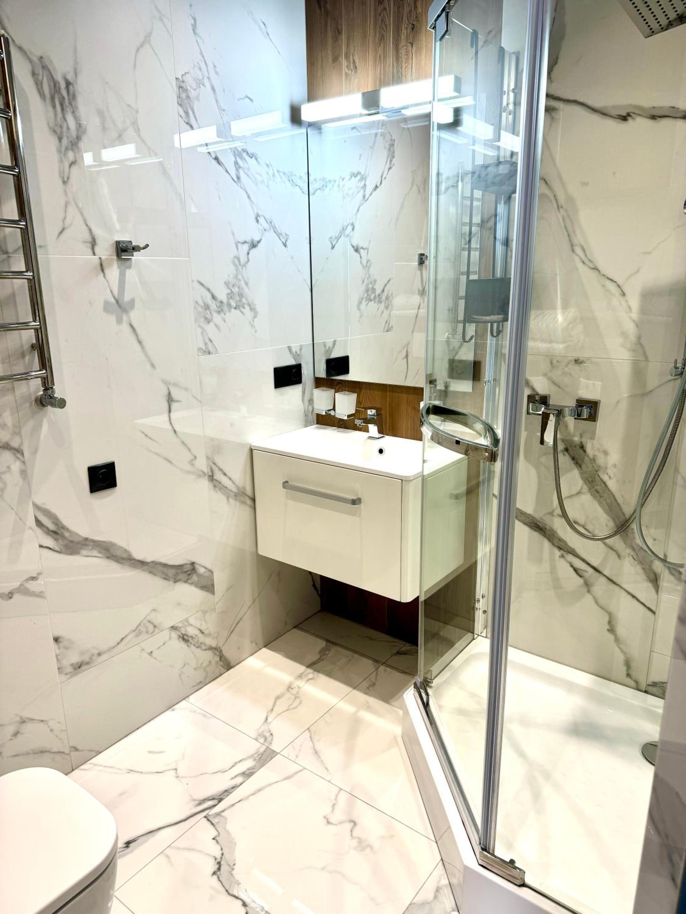 Неймовірний та приємний персонал. Гарна квартира, сучасний дизайн, чисто, є чайник, фен, чай та навіть пляшки води для кожного гостя. Для нас відкрили заїзд в двір, де можна прям під домом поставити безкоштовно машину, що є дуже зручно та комфортно.