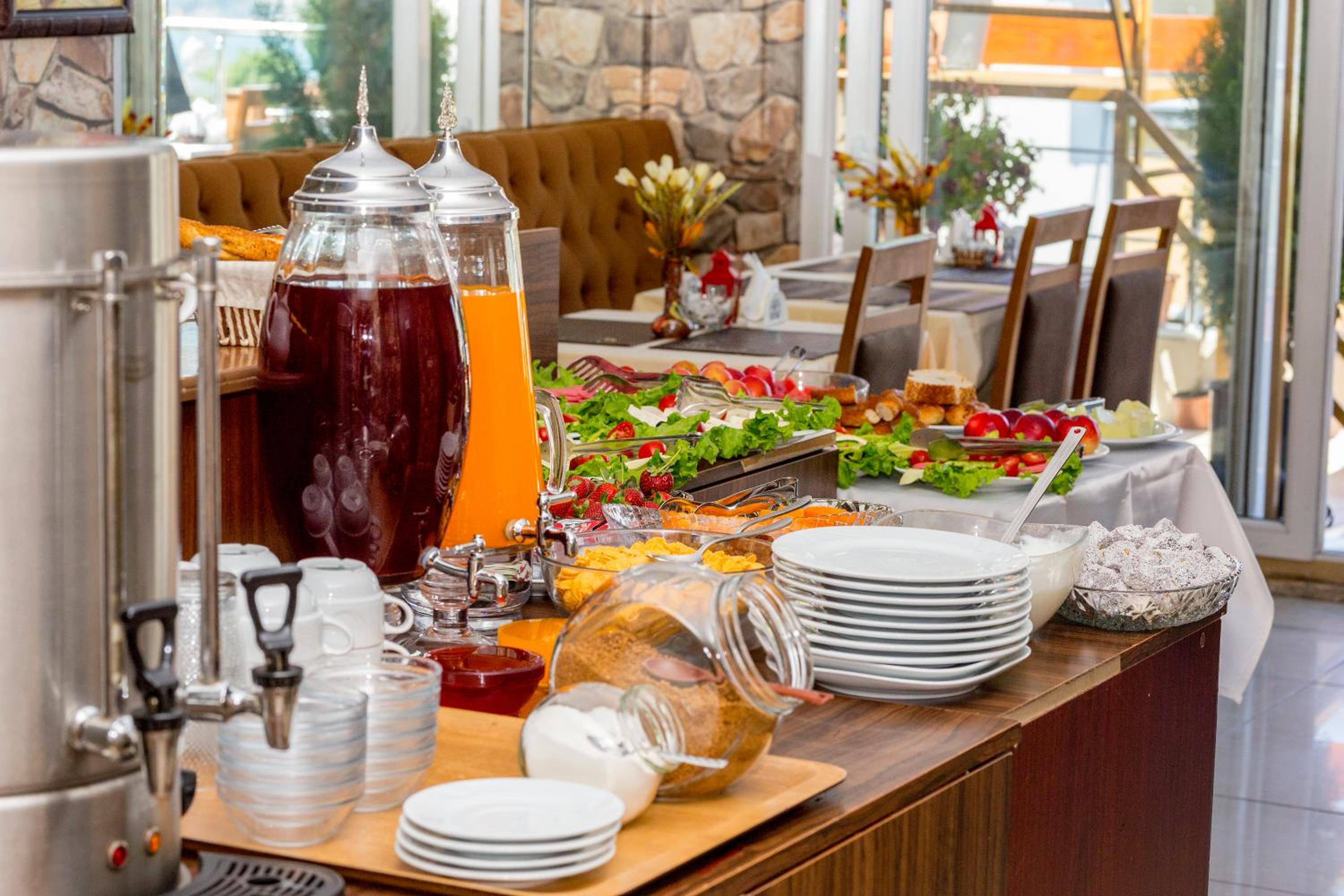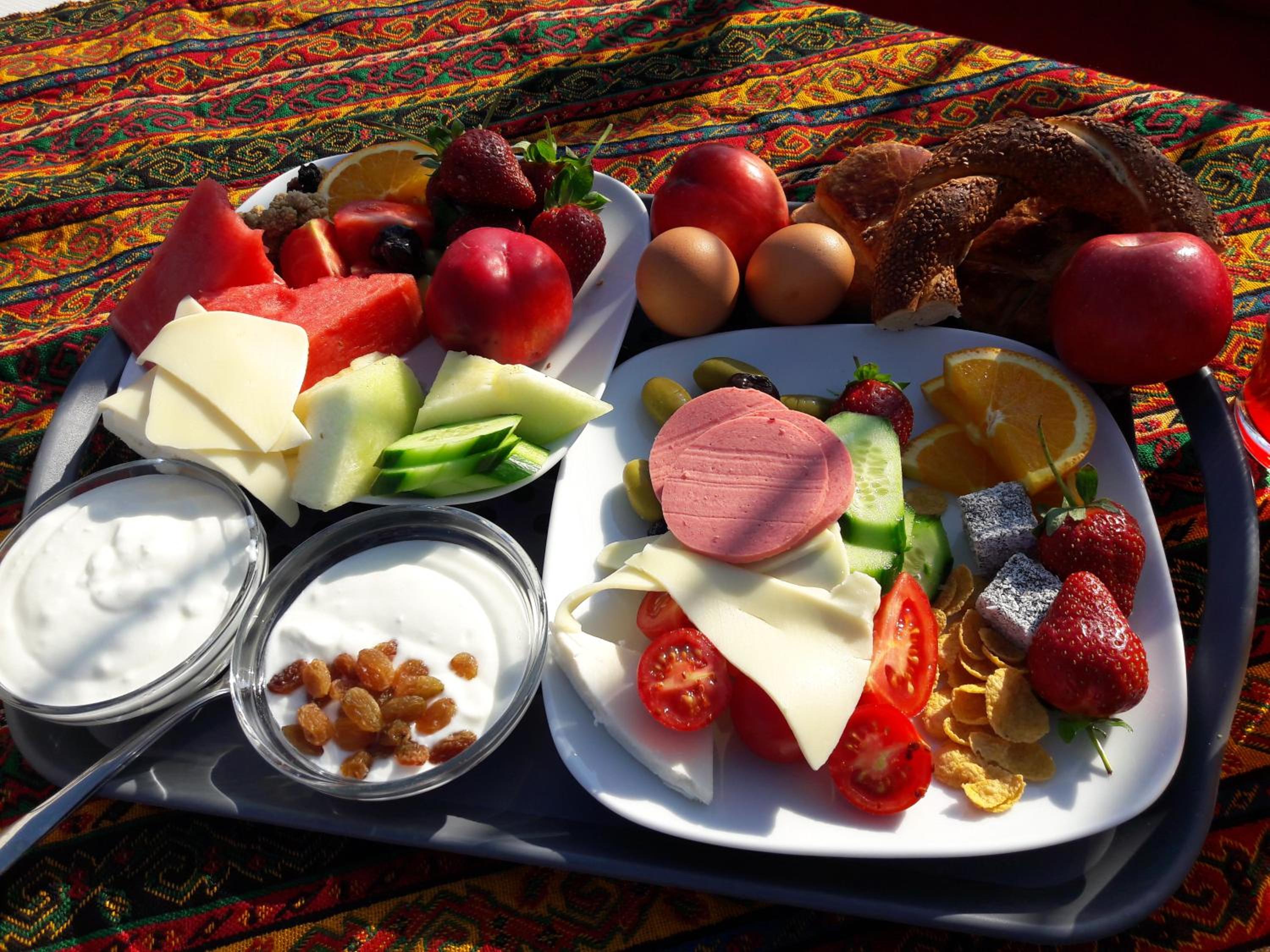The breakfasts were on time and fresh. There were cucumbers, tomatoes, 2 kinds of cheese, hard boiled eggs, 2 kinds of juice, 2 kinds of olives, 1 kind of sausage, little packets of jam and honey, 1 kind of bread.