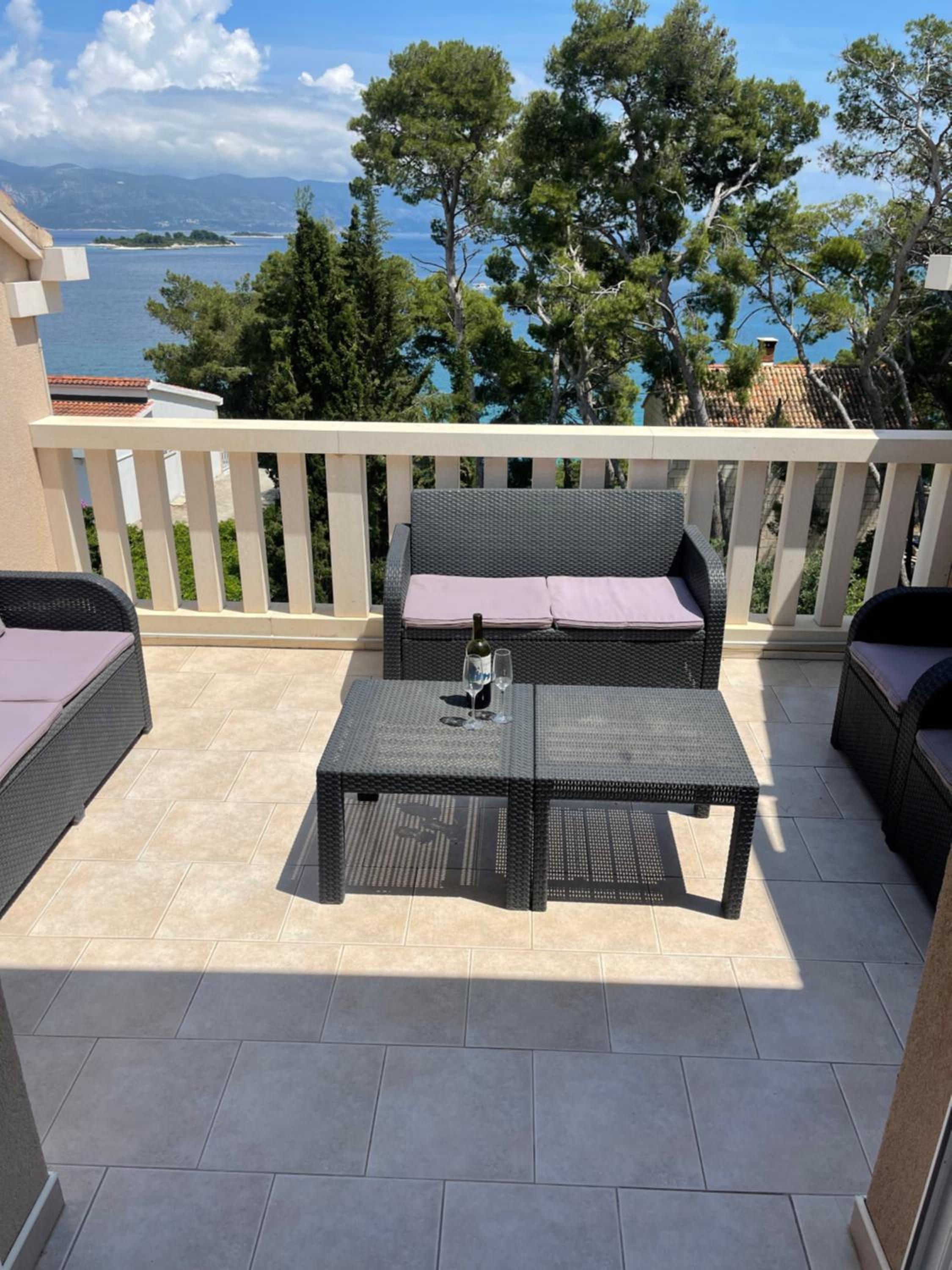 The terrace is great with a nice seaview and plenty space. From the appartment to the sea it was only 50 meters to a stair that leads to a nice place where you can into the sea and laying around. Plenty opportunities to sit in the sun or shadow. Very quiet neighbourhood with a look at Lumbarda village at the other side of the bay. You can walk to there in 10 minutes or swim in 20 minutes.