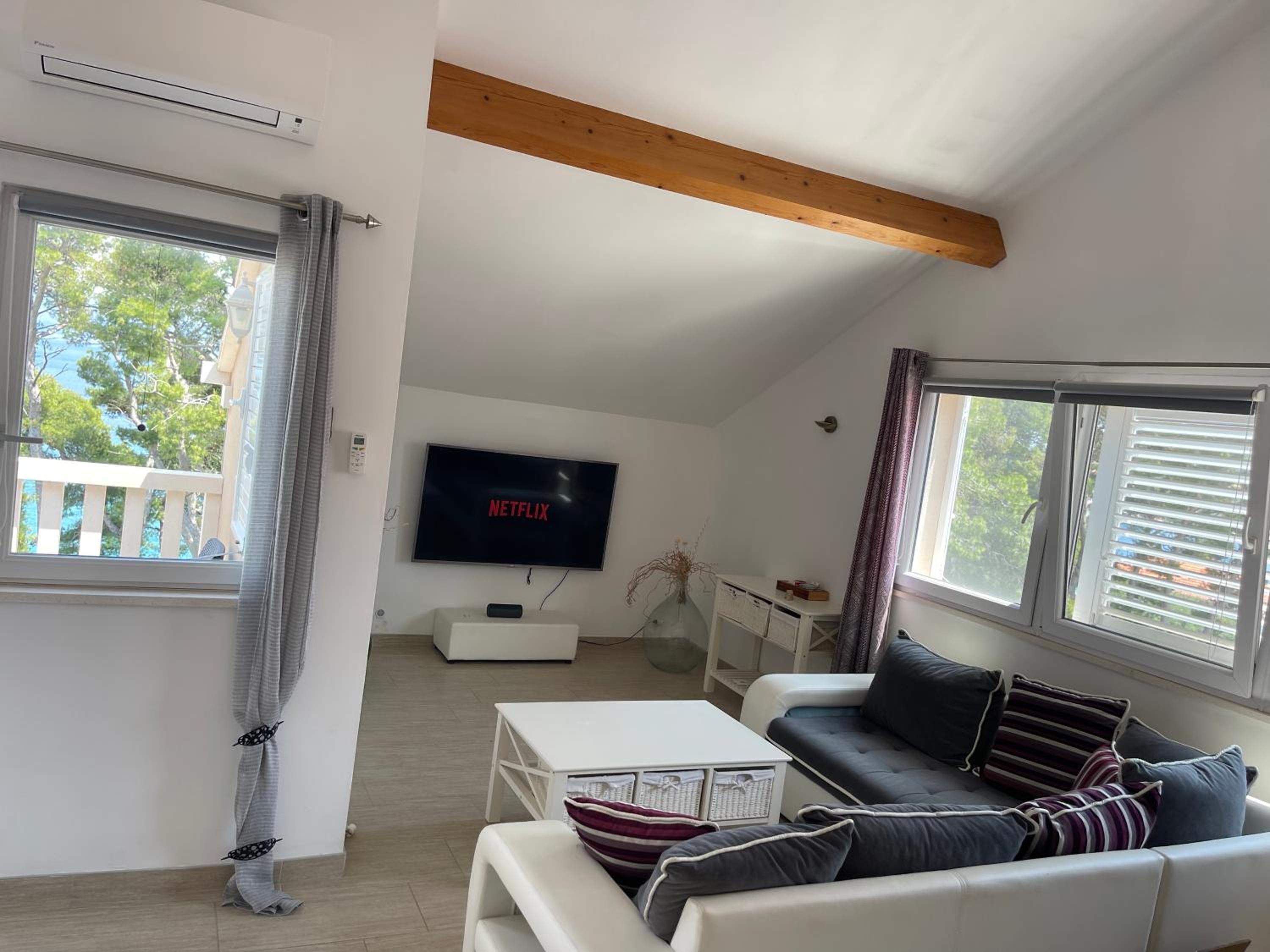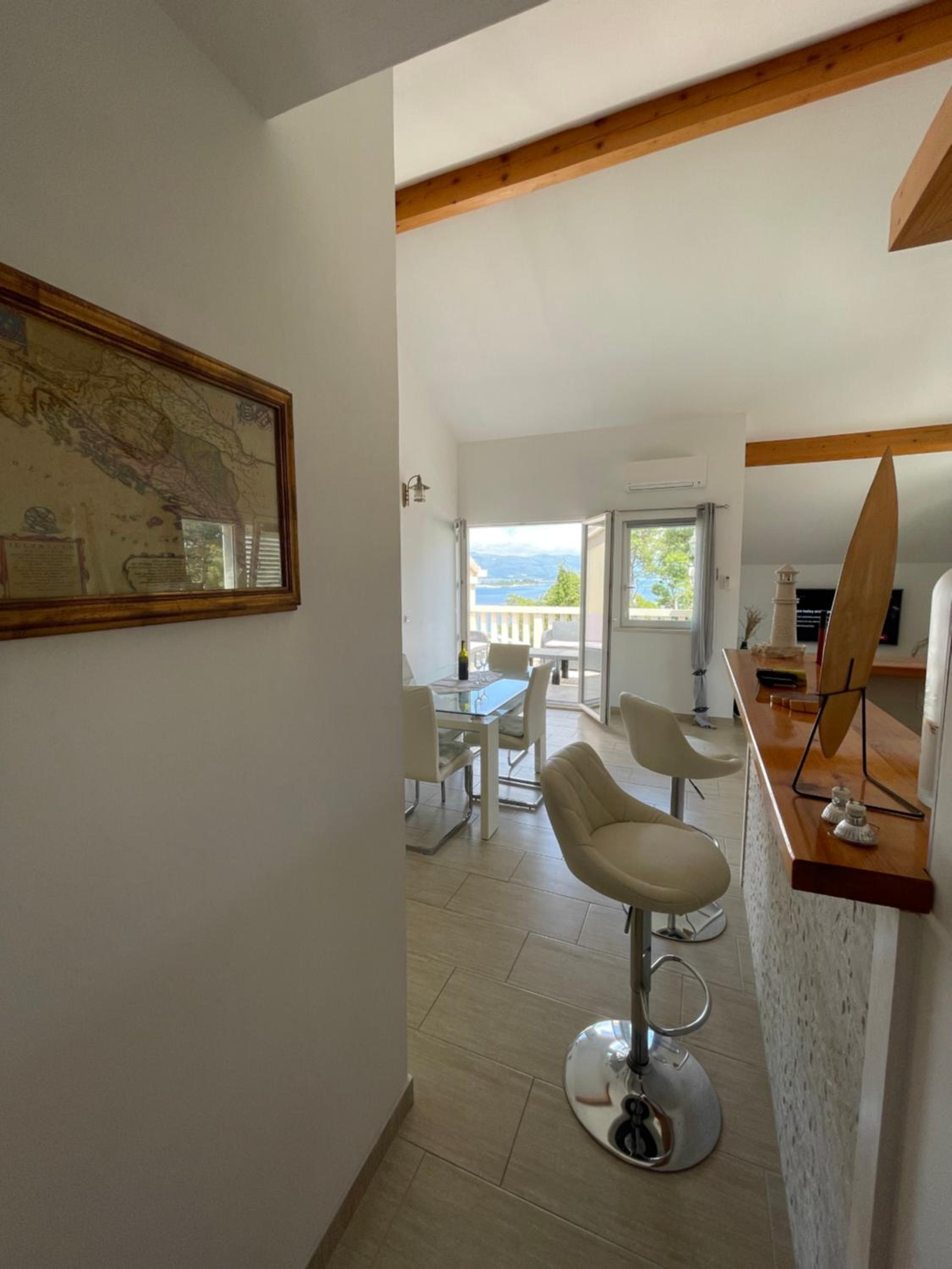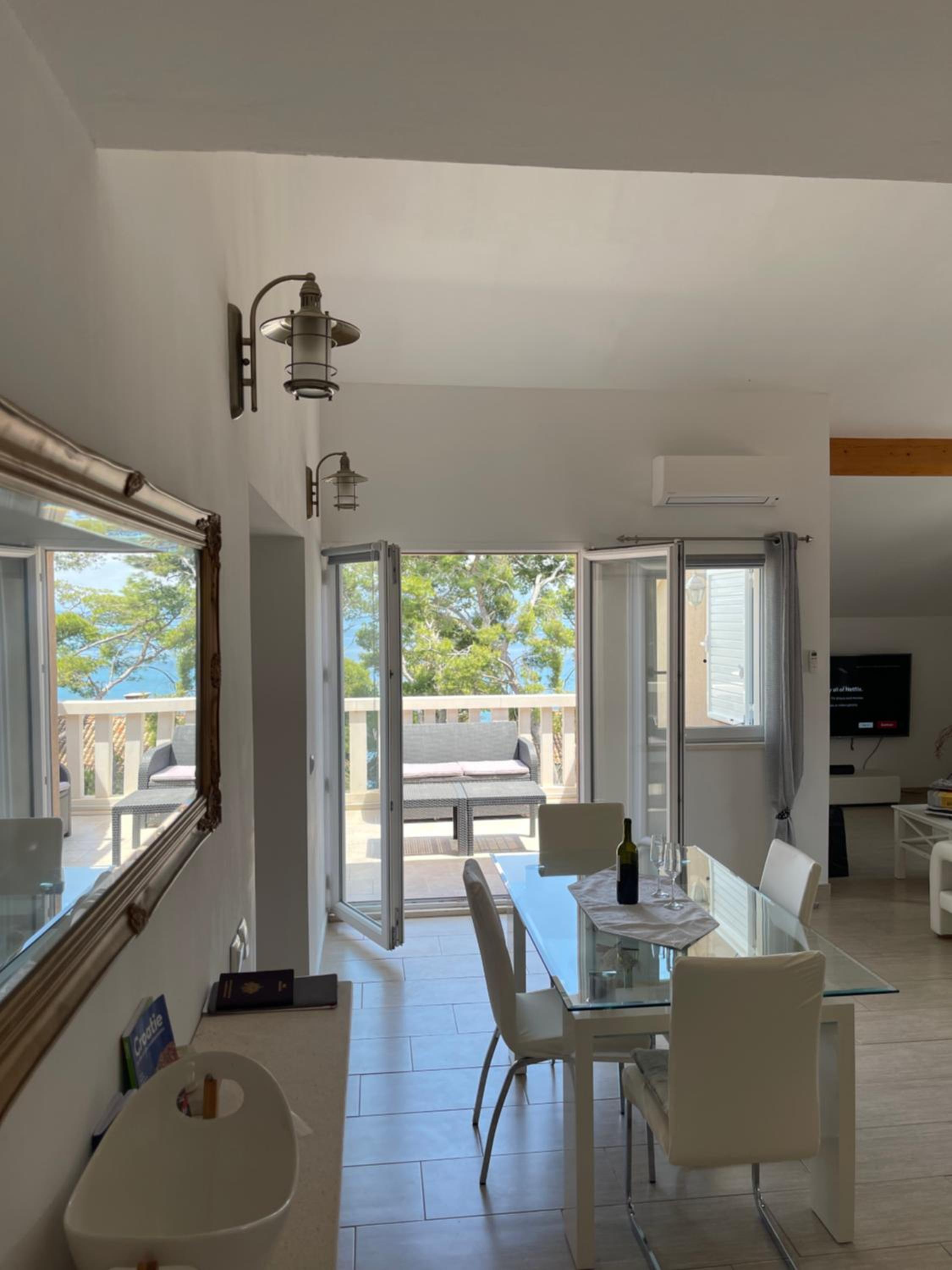 a large apartment with a homely atmosphere. A very nice host, whom we immediately liked. Great large balcony with a beautiful view. Comfortable bed. Comfortable shower - covered with a curtain, but since the shower is very large, the curtain is not a problem (it does not stick to the body). There is a convenient shelf for cosmetics in the shower. A large number of kitchen utensils - good quality pots, etc The apartment is equipped with a brush + dustpan, mop... Quiet area, the house is located on a small street, second line from the sea. Access to the sea takes 1 minute (a very pleasant promenade for walking or lying on the stones and swimming) Parking on the street in front of the house, in the season it can be tight, but there is always a place nearby. 10-15 minutes walk to the center of Lumbarda The bedroom window overlooks the neighbors' house nearby, but there are curtains and blinds to protect privacy. The window in the bathroom overlooks the internal courtyard and, for comfort of use, usually requires covering with blinds. The fridge is large but does not have a freezer, in the case of products that require freezing, we placed them on the side of the fridge wall and set the fridge to cool more (it was effective) Air conditioning is installed in the living room connected to the kitchen, there is no separate air conditioner in the bedroom.
