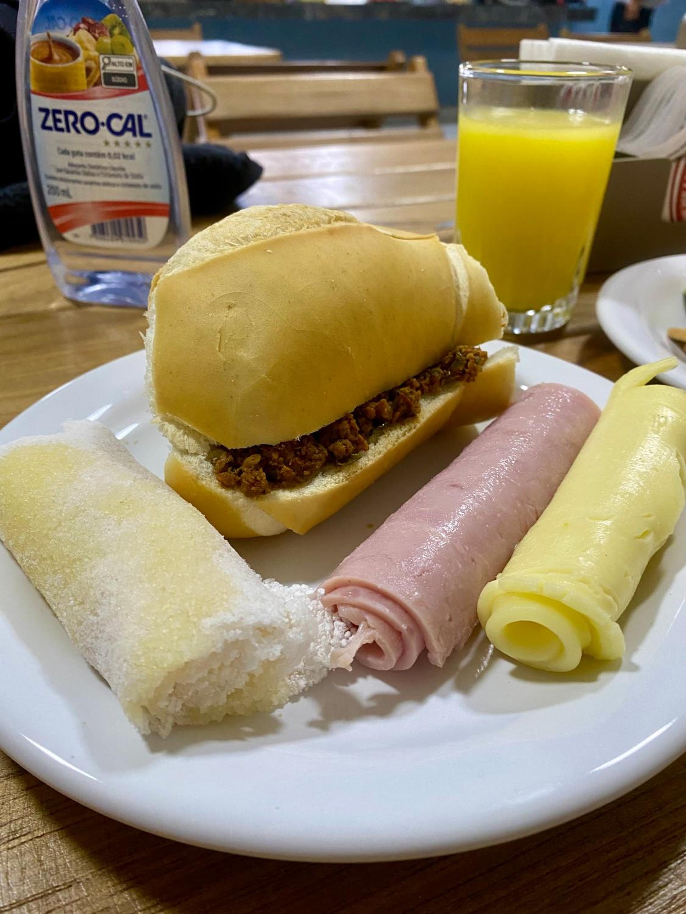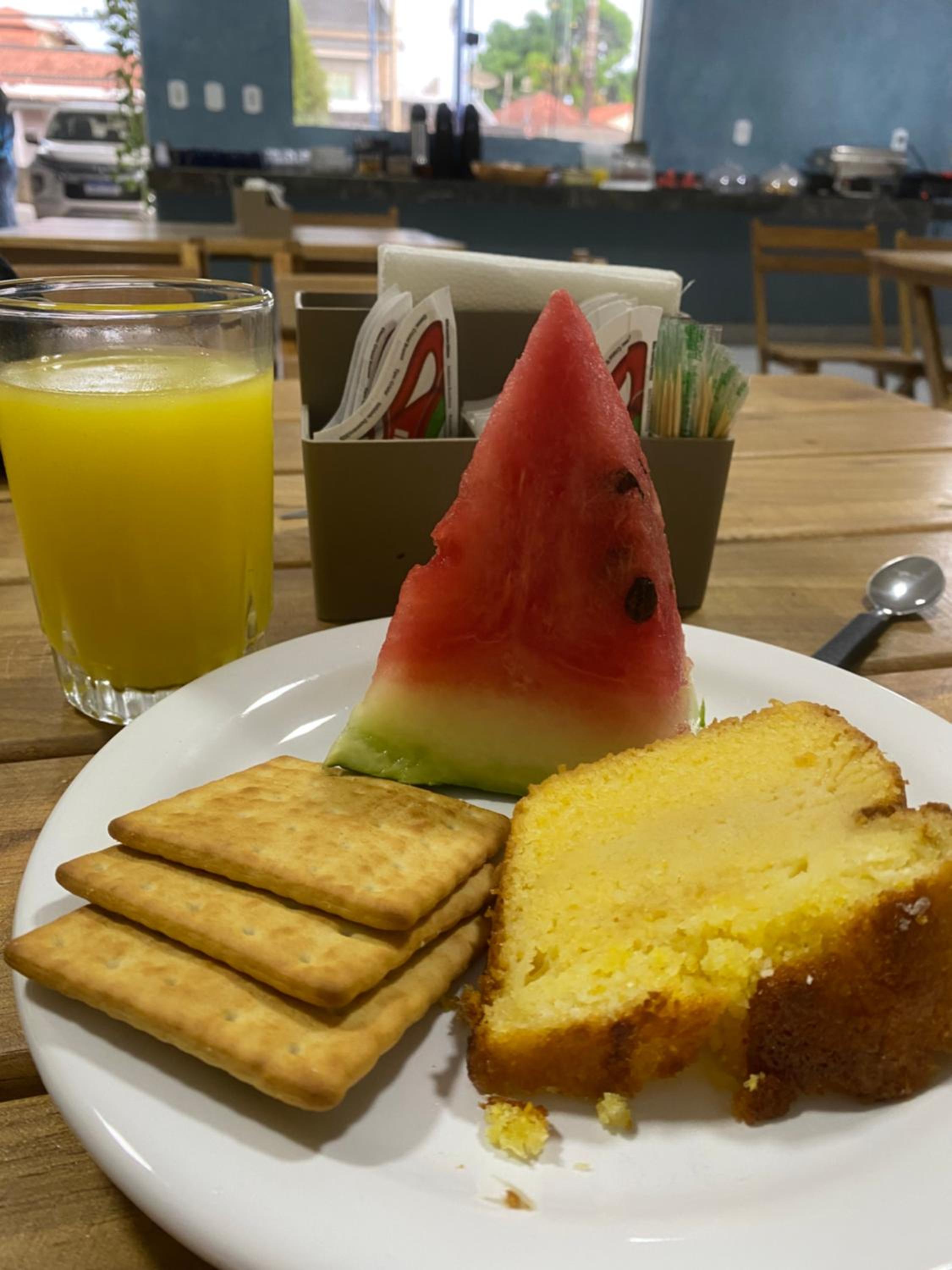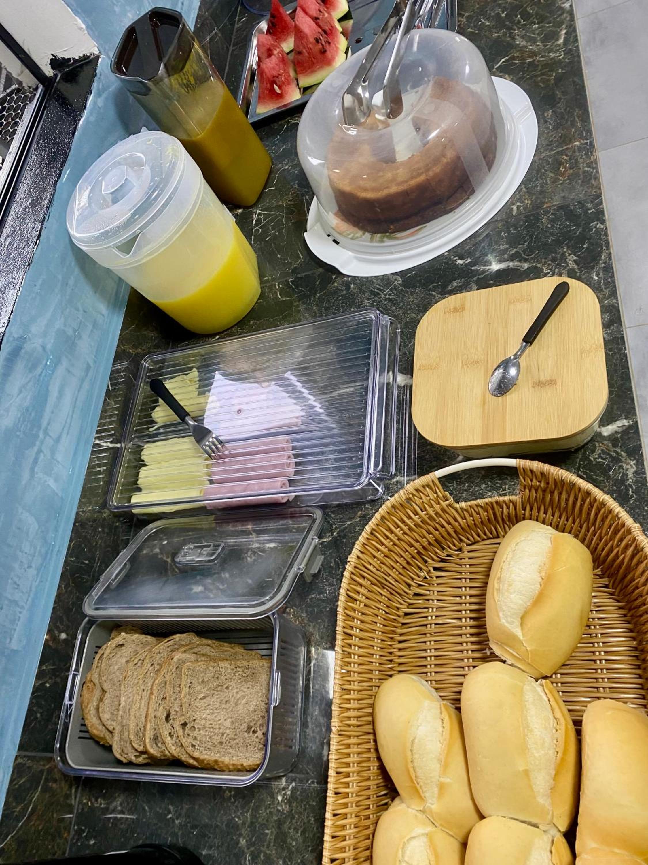 O café da manhã é simples, mas atende muito bem.