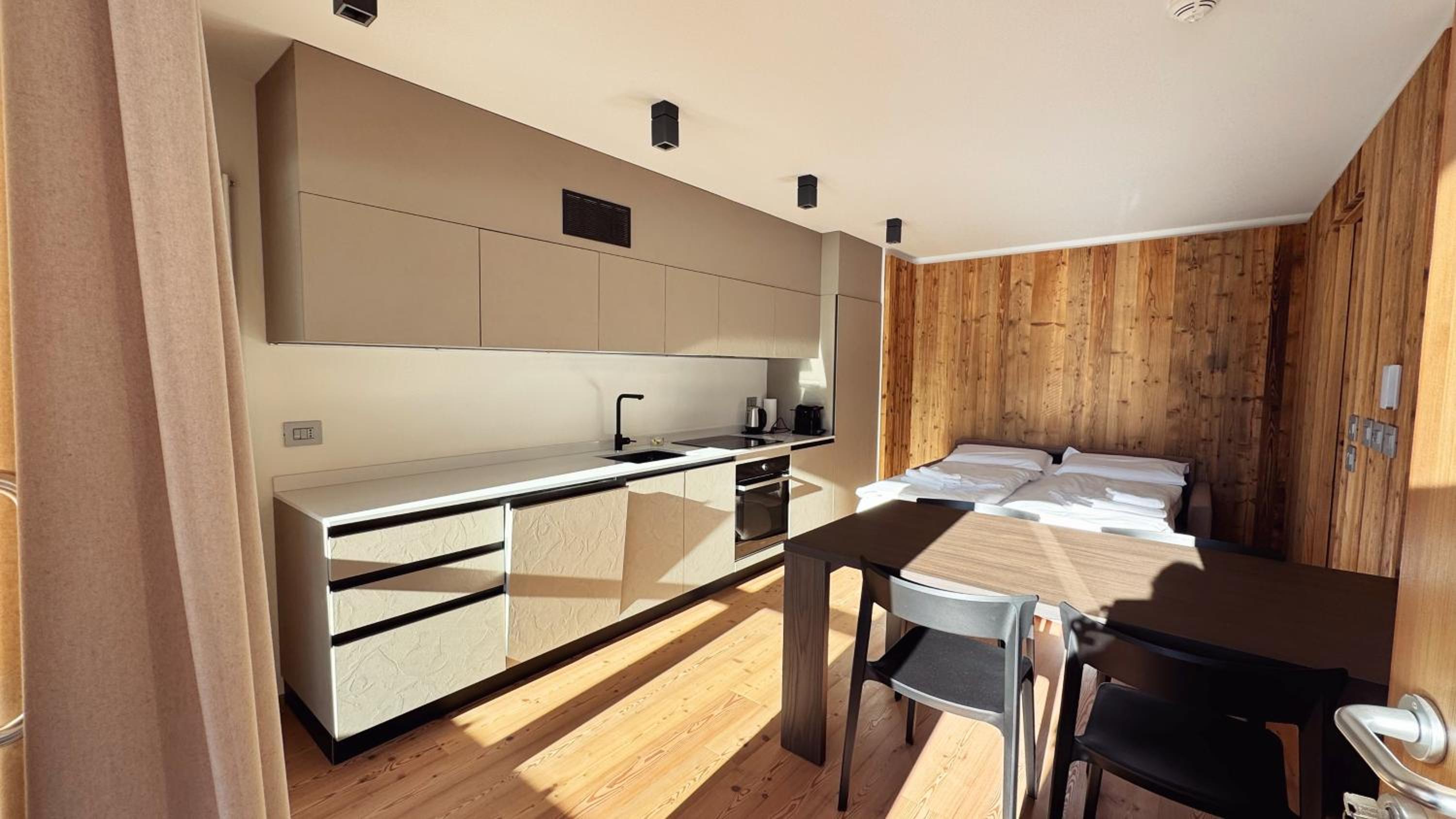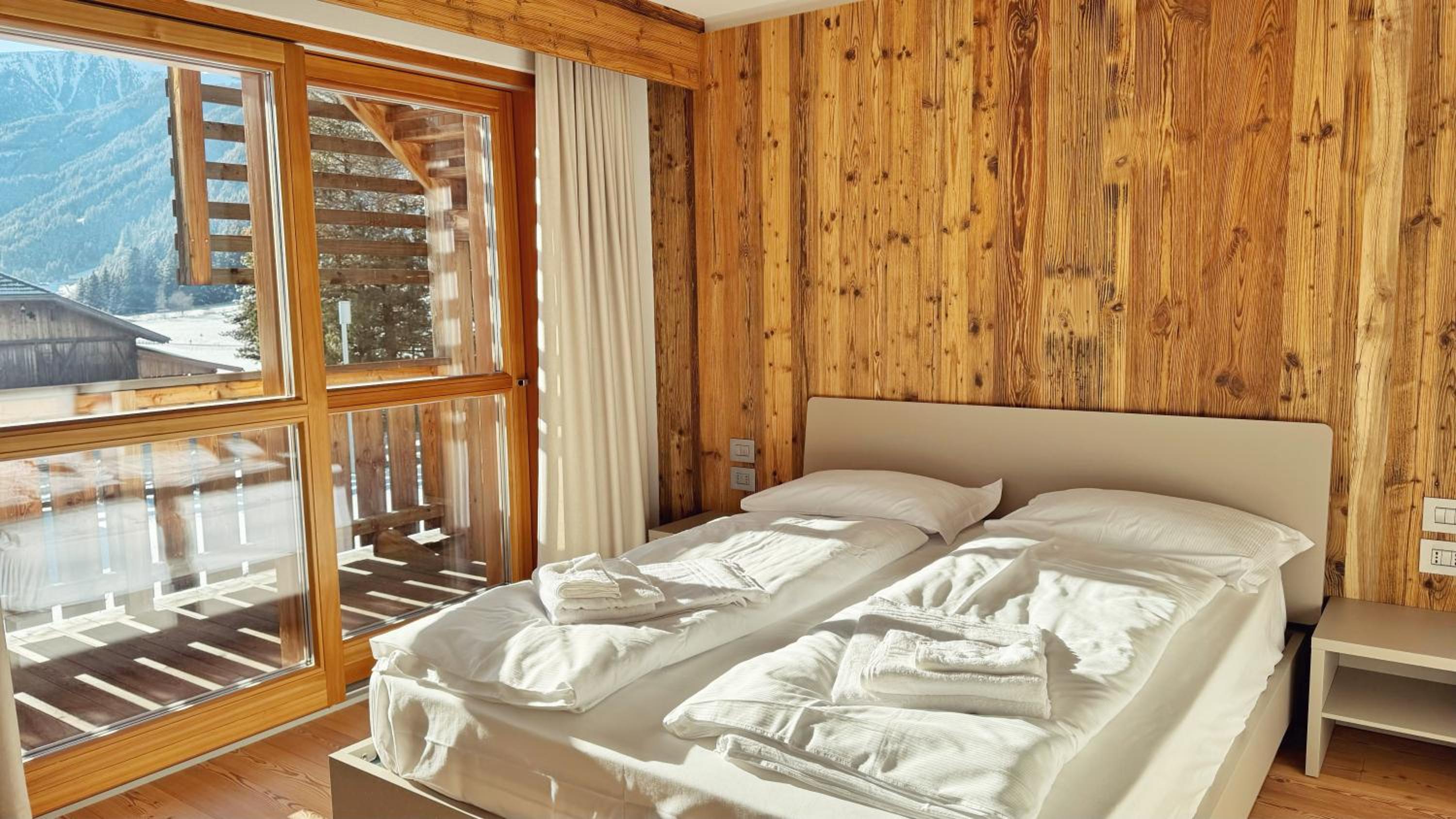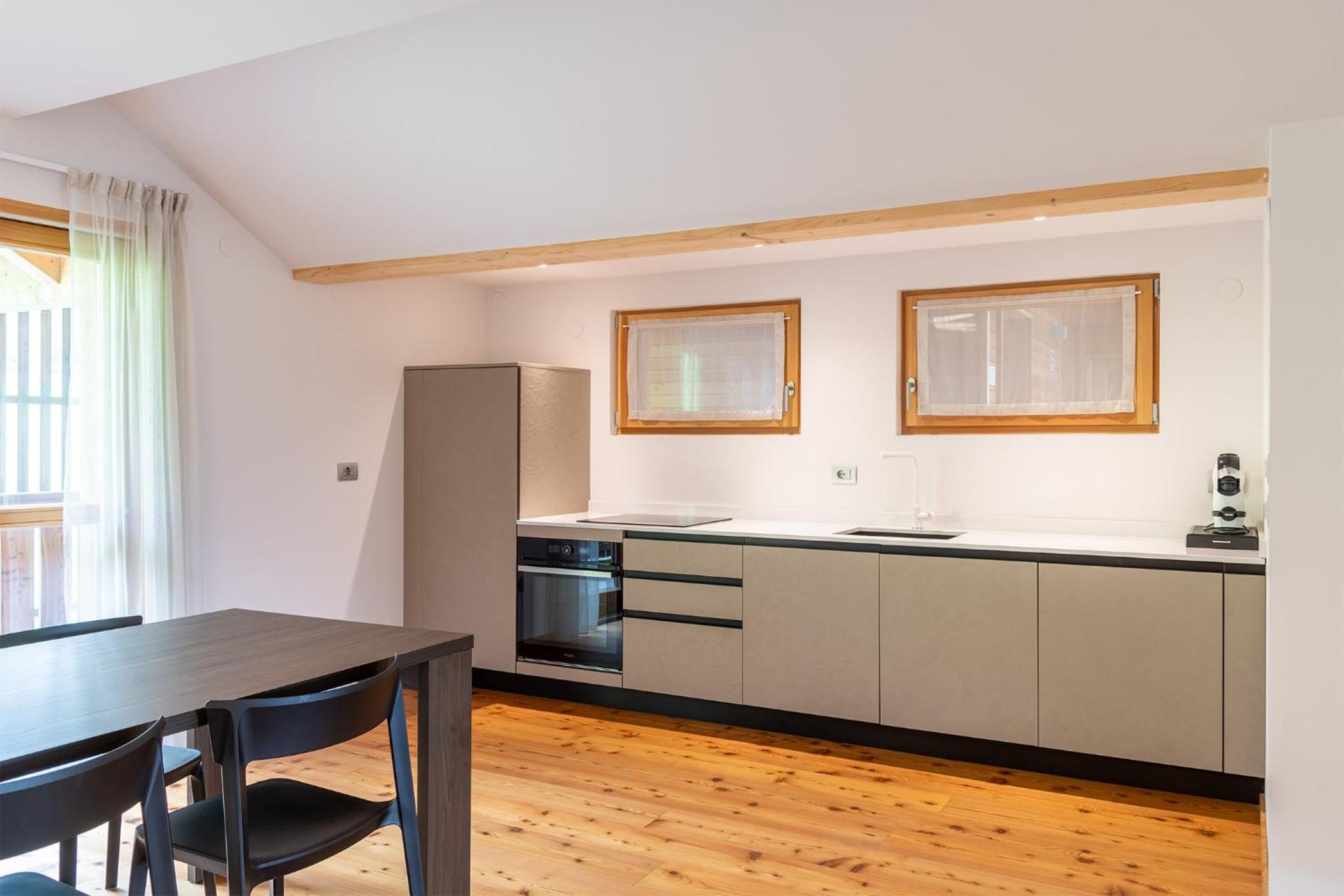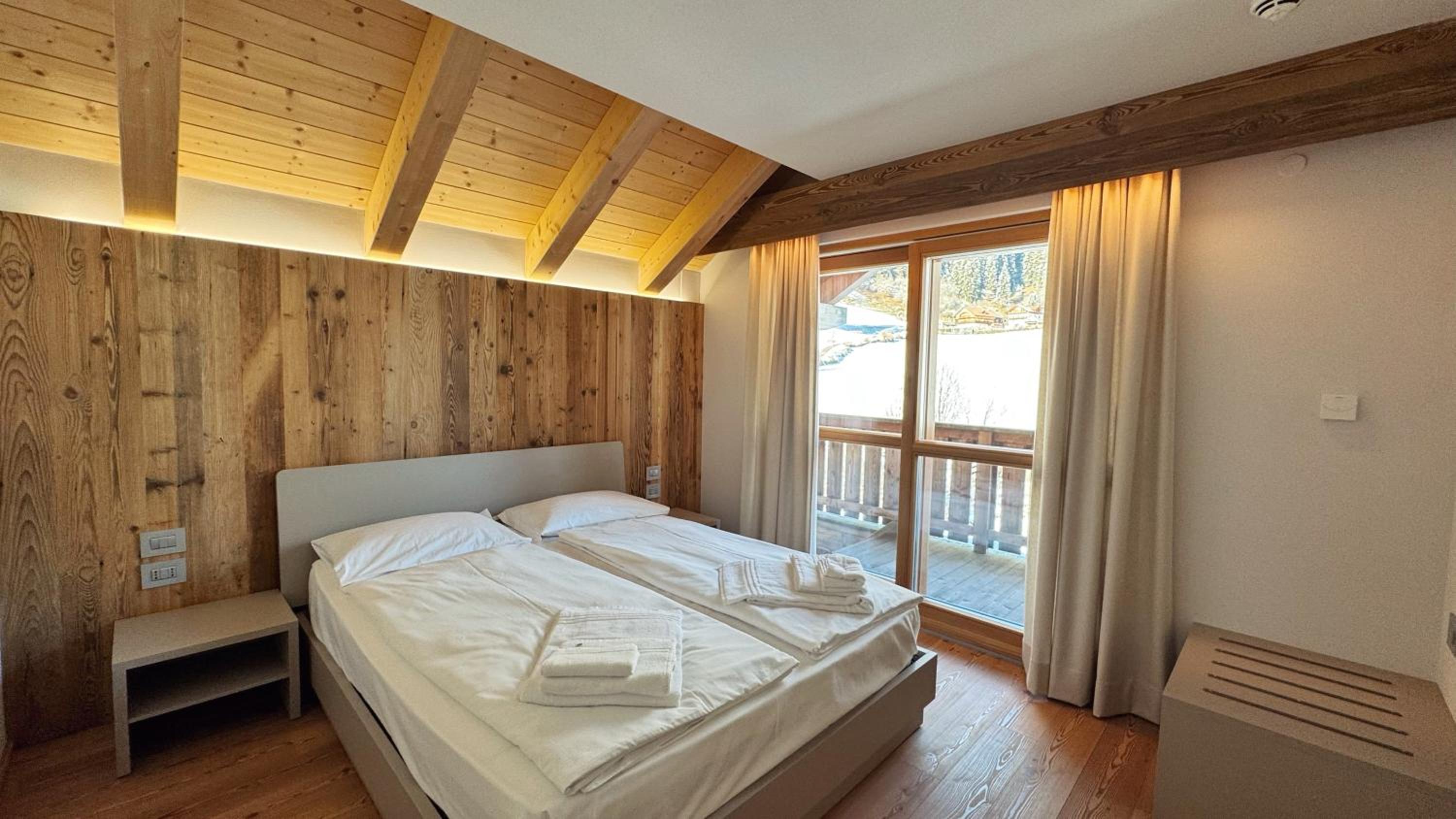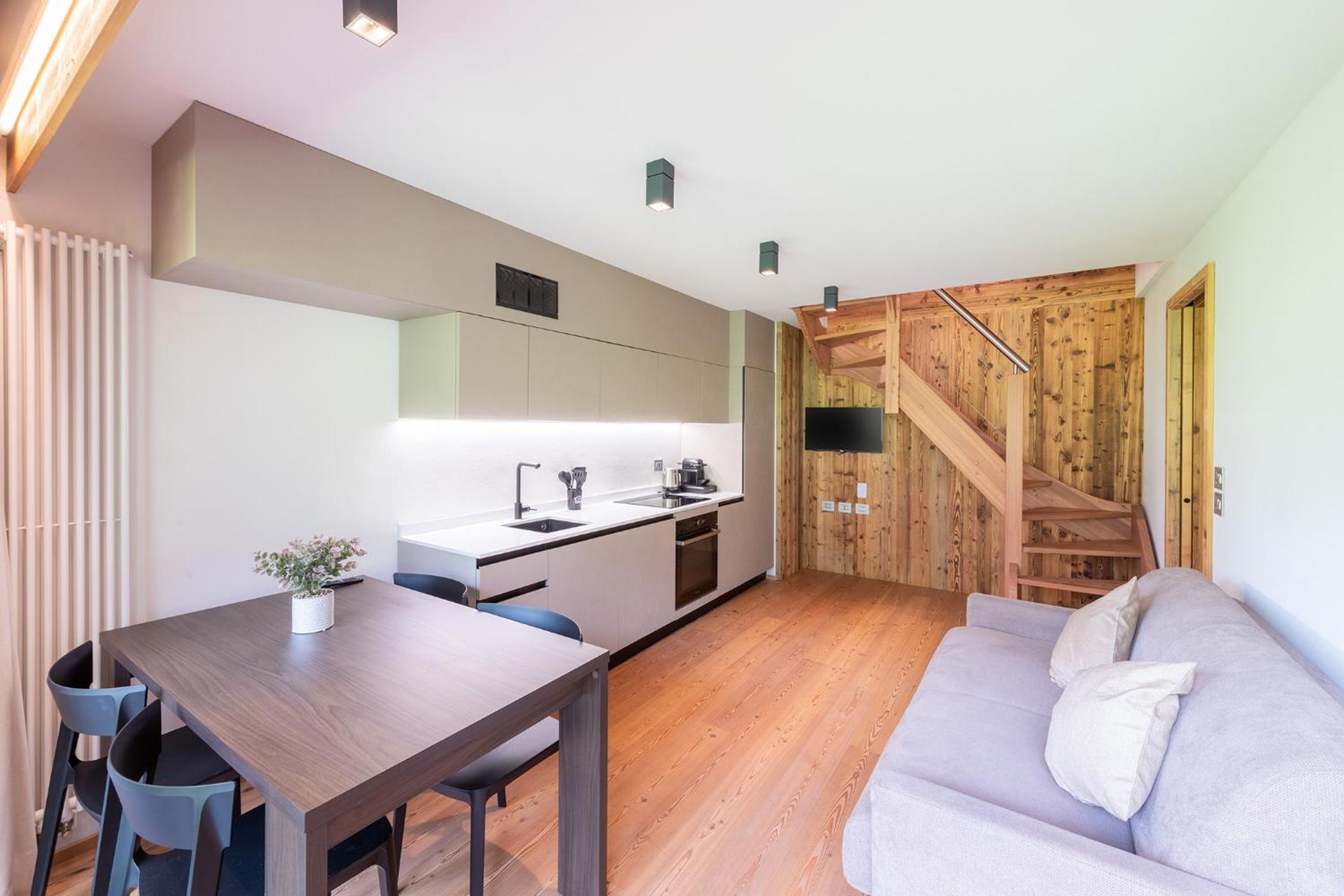Molto bella la struttura in legno ma allo stesso tempo non ben levigato quindi schegge dovunque anche sul pavimento.. scala perché scivolati. Non c'è moka ma macchina caffè senza cialde e non ti dicono prima di provvedere. Molto piccola zona cucina divano letto visto che appartamento destinato a 5 persone e un bambino piccolo. Nessun seggiolino o letto per il bambino anche se comunicato e pagato per 5 persone e un bambino di 1 anno. Problemi con antincendio che partiva da altri appartamenti e bloccava tutti. Nessuna presenza di personale