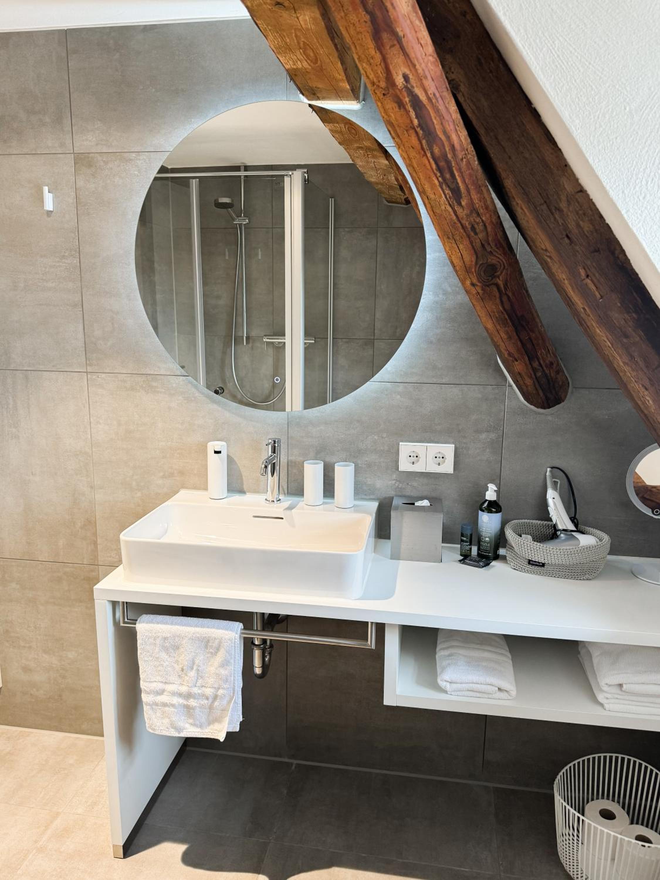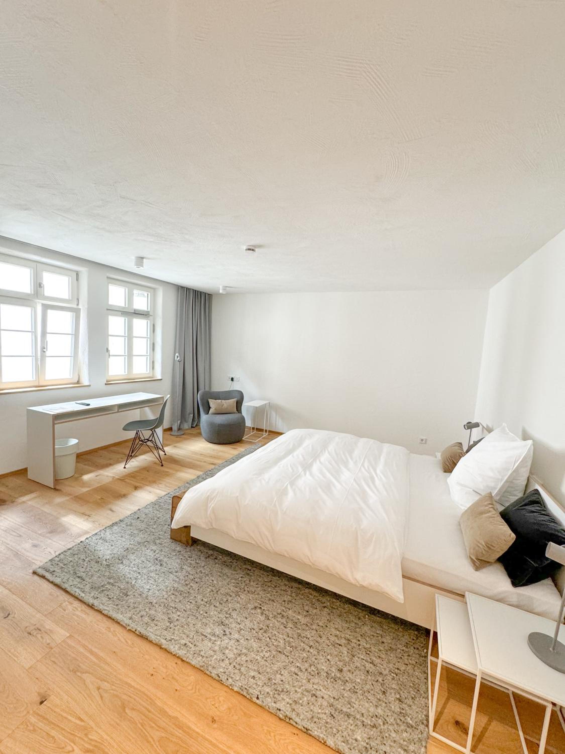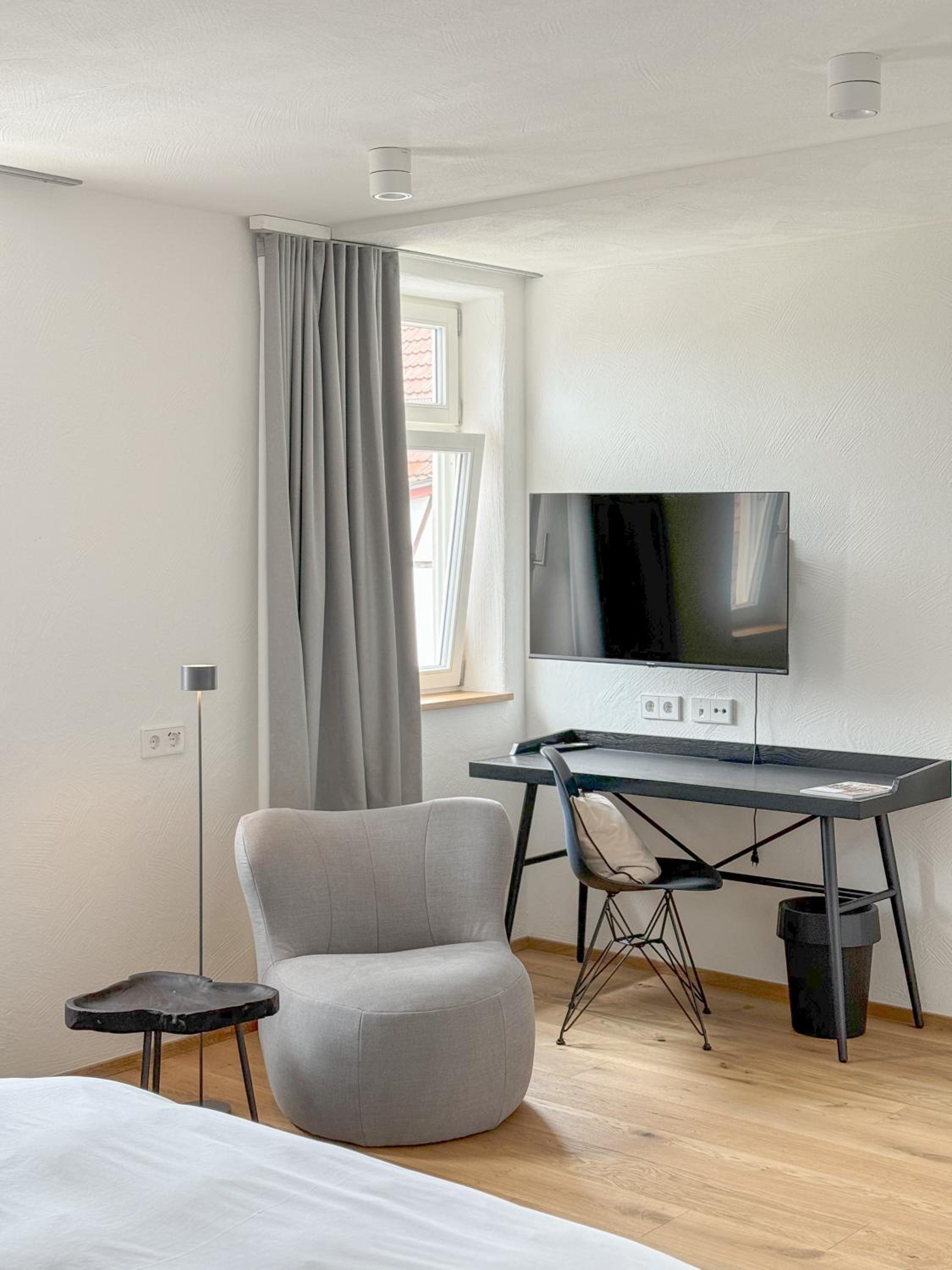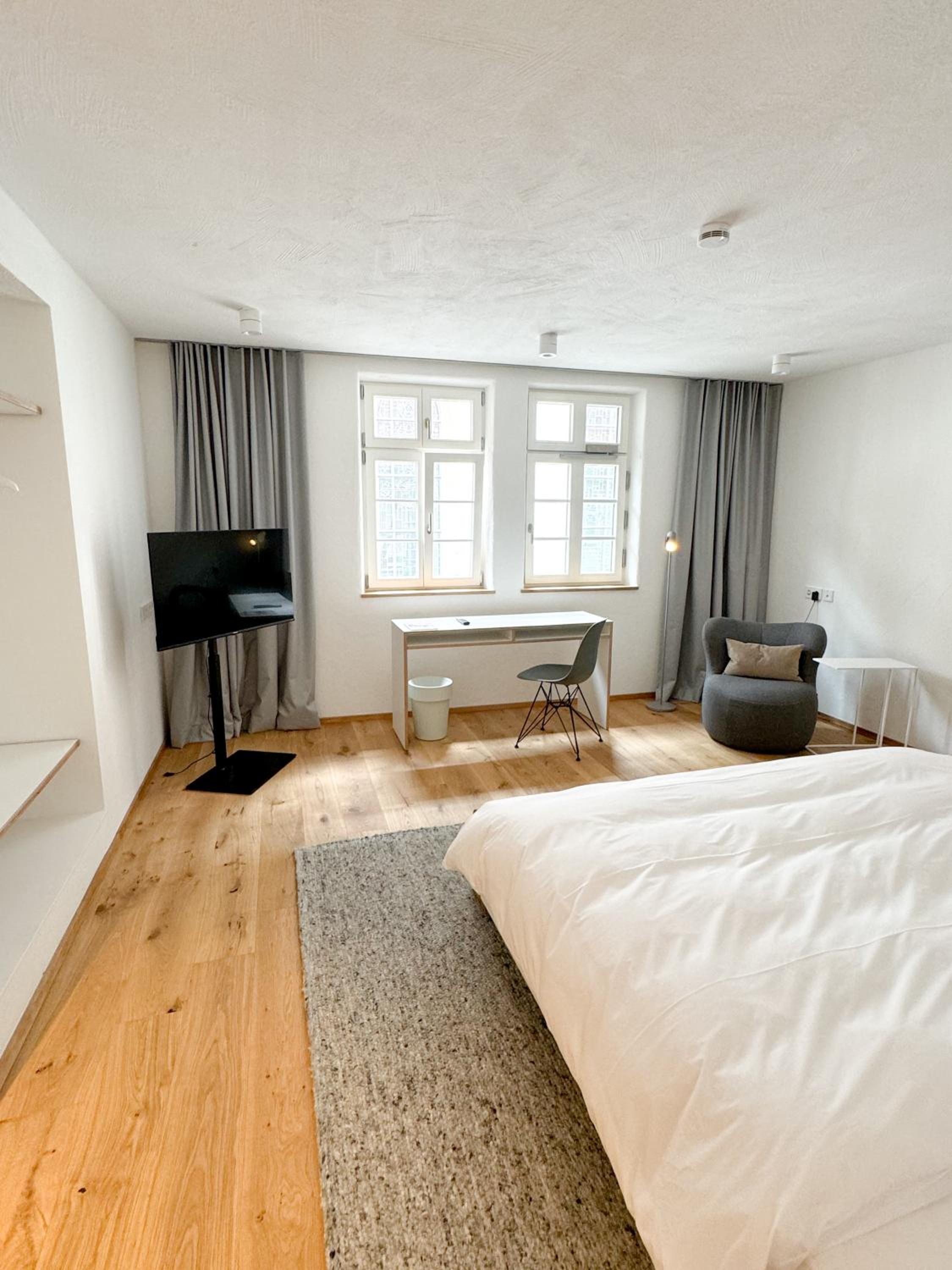 Die Rezeption ist der Tresen im (übrigens extrem empfehlenswerten) Restaurant "Faust" im Erdgeschoss des Gebäudes. Der Empfang ist freundlich und zugewandt, das Zimmer groß, sehr sauber und modern möbliert. Das Bett war ausgesprochen bequem - nicht zu weich und nicht zu hart. Die Renovierung/Sanierung des alten Hauses lag offensichtlich in den Händen eines/einer Architekt:in, der/die wusste, wie das geht. Und man hatte wohl auch Handwerker, die ihr Handwerk verstehen. Kurz: Alles, wie es sein soll. (Und wenn man dem Zimmer, in dem ich übernachten durfte, vielleicht noch ein, zwei Bilder für die Wände spendieren würde, wär's ganz perfekt.)