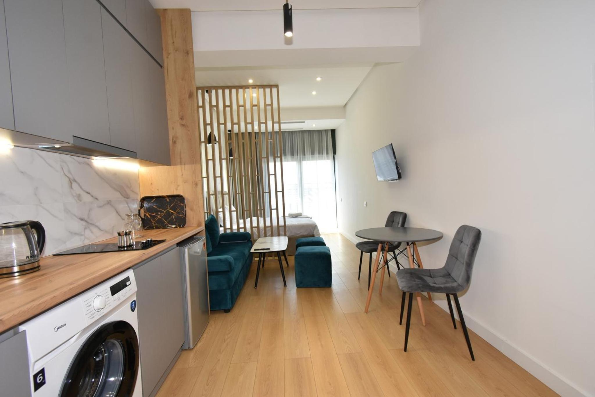Our aparthotel offers free WiFi, on-site parking, air conditioning, fully equipped kitchenette, flat-screen TV, and private bathroom amenities for a comfortable stay.
