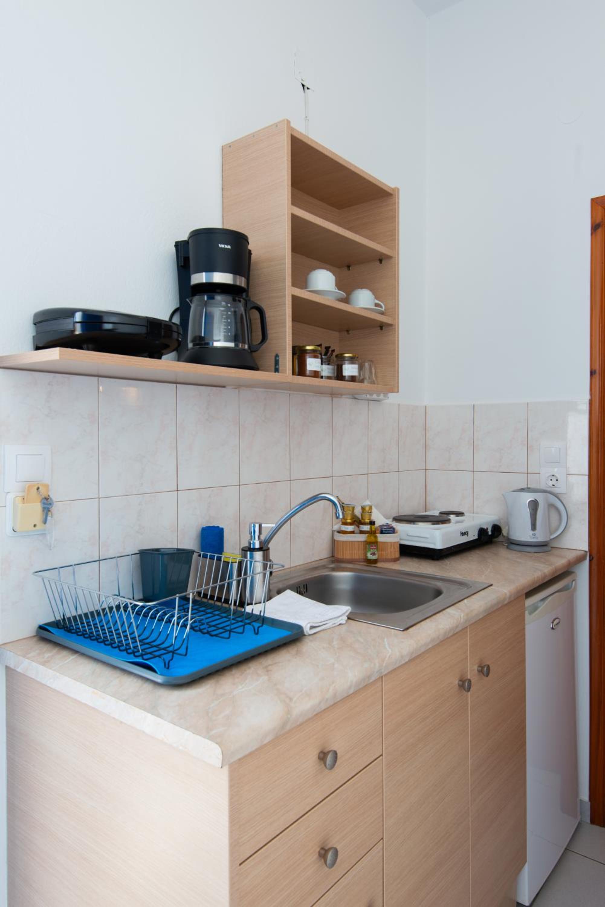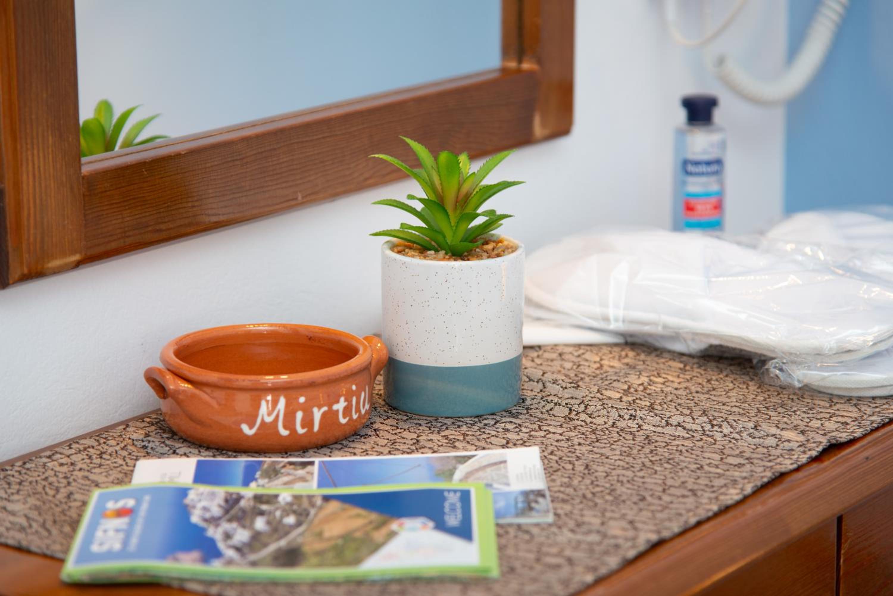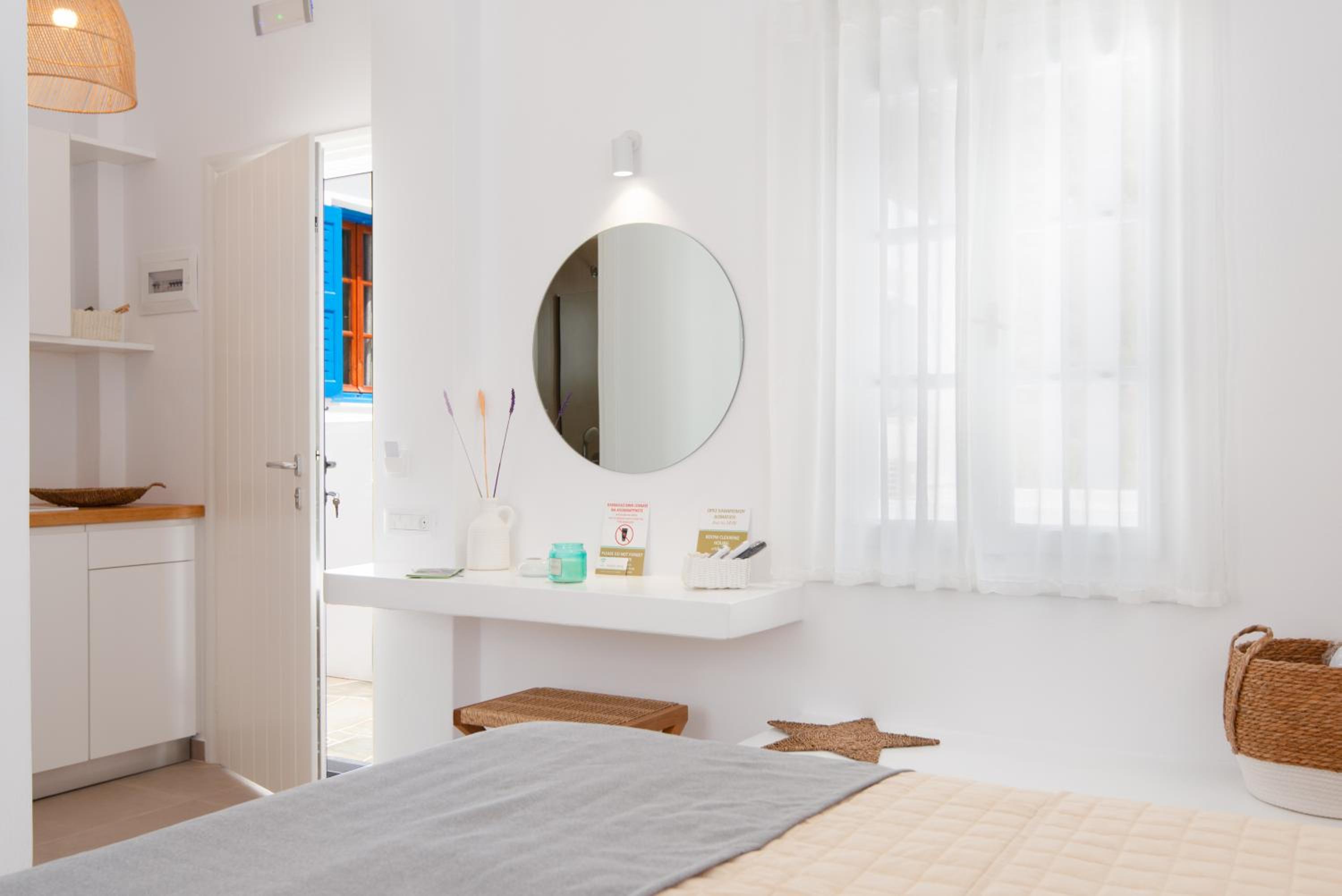 Proximity to the port, restaurants and the local market. Fully equiped kitcenette with all kinds of coffee machines along with coffee, sugar and cream, kettle, pots and pans, glasses etc. Plenty of local sweets along with pottery as a welcome basket. Fridge full with several kinds of local home made jams, and sodas, coke and beers. Very clean room with a balcony with nice view of the sea and the surrounding hills. Very soft towels and sheets and fully equipped bathroom with everything you may need, even sanitary napkins for women