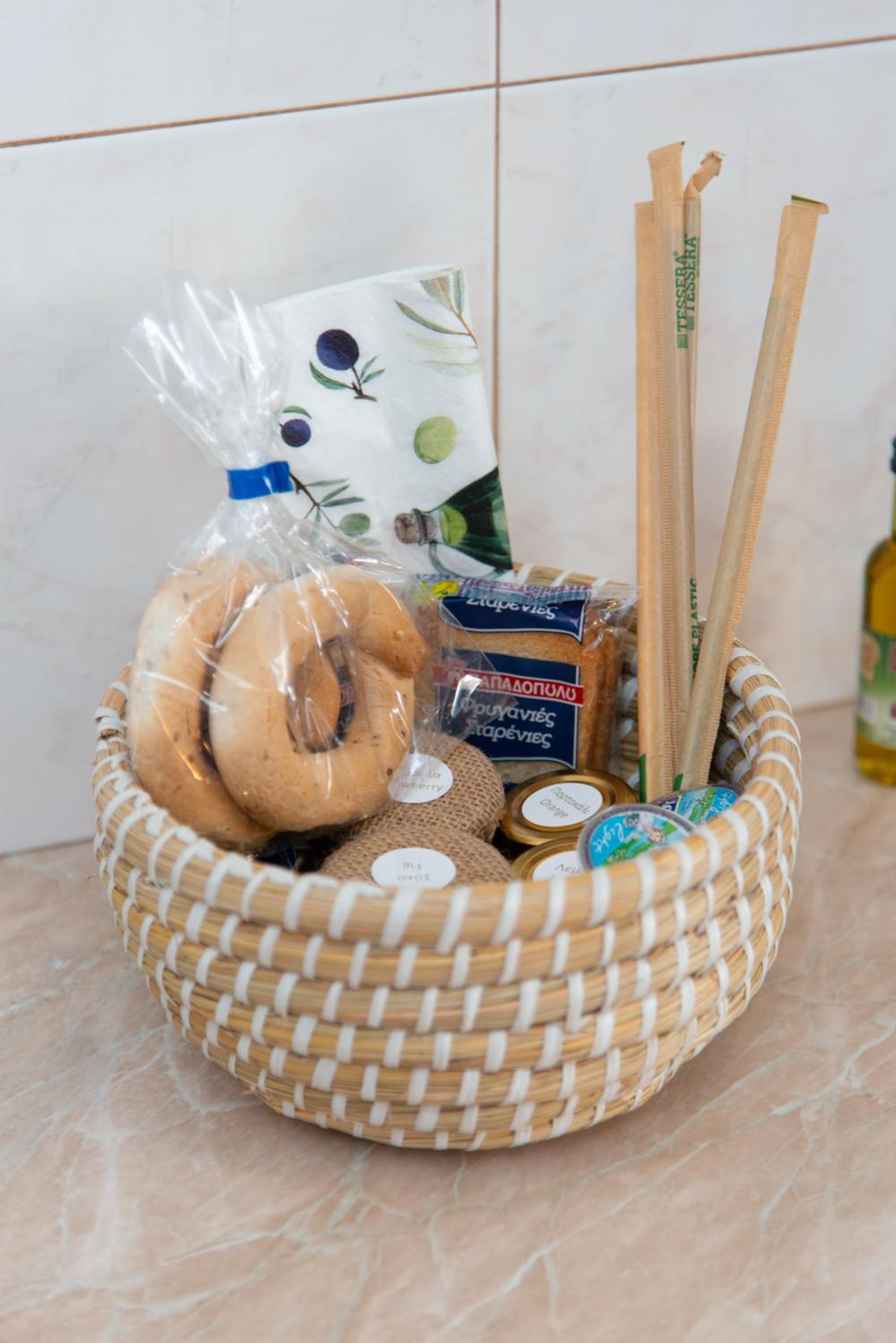 Nettes Geschenk erhalten mit lokalem Gebäck und einem Töpfersouvenir. plus Kaffee, Butter, Honig etc standen zur Verfügung