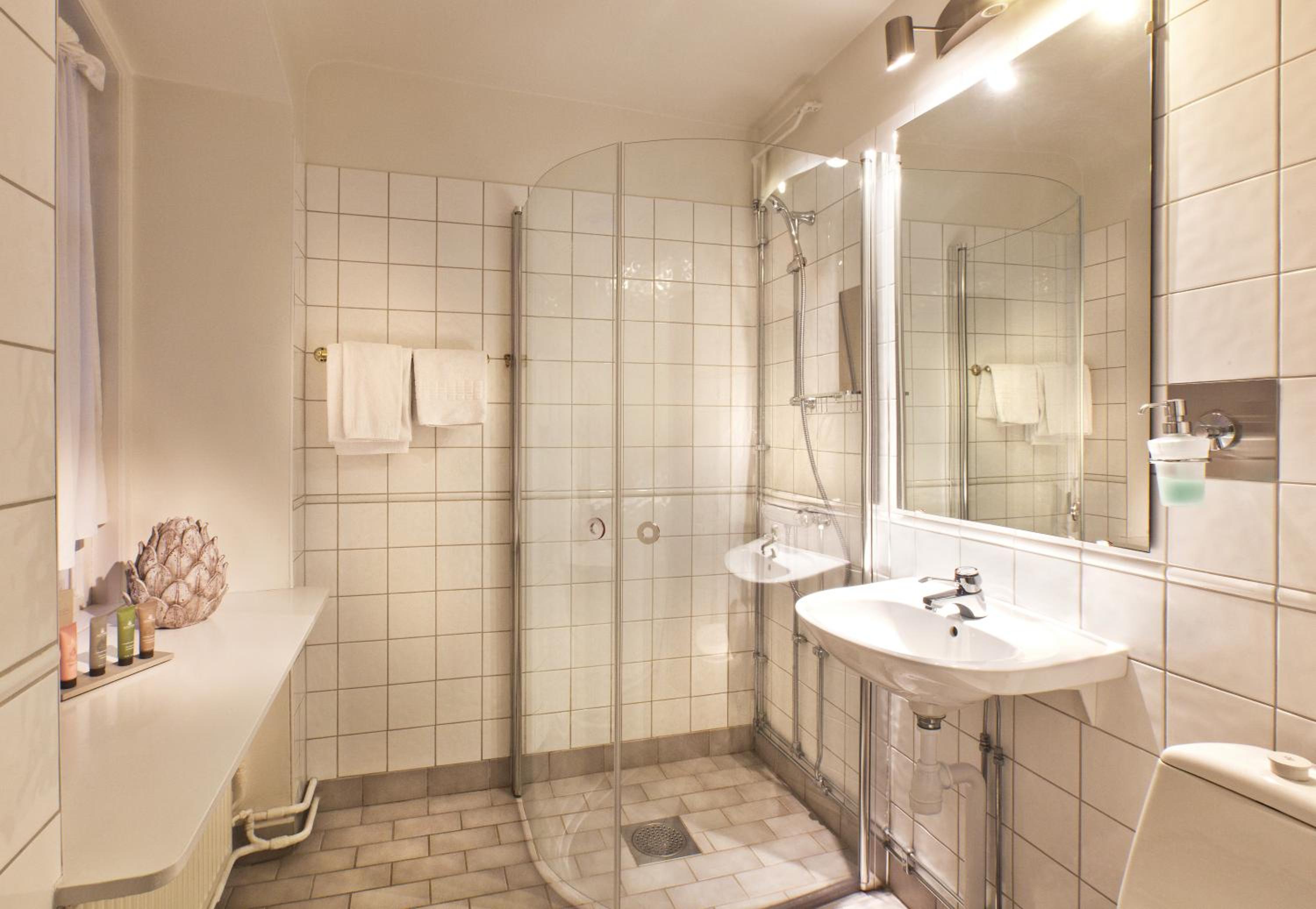 Det läckte vatten från duschkabinen till golvet framför. Handfatet var väldigt nära toalettstolen. Saknade några tavlor på