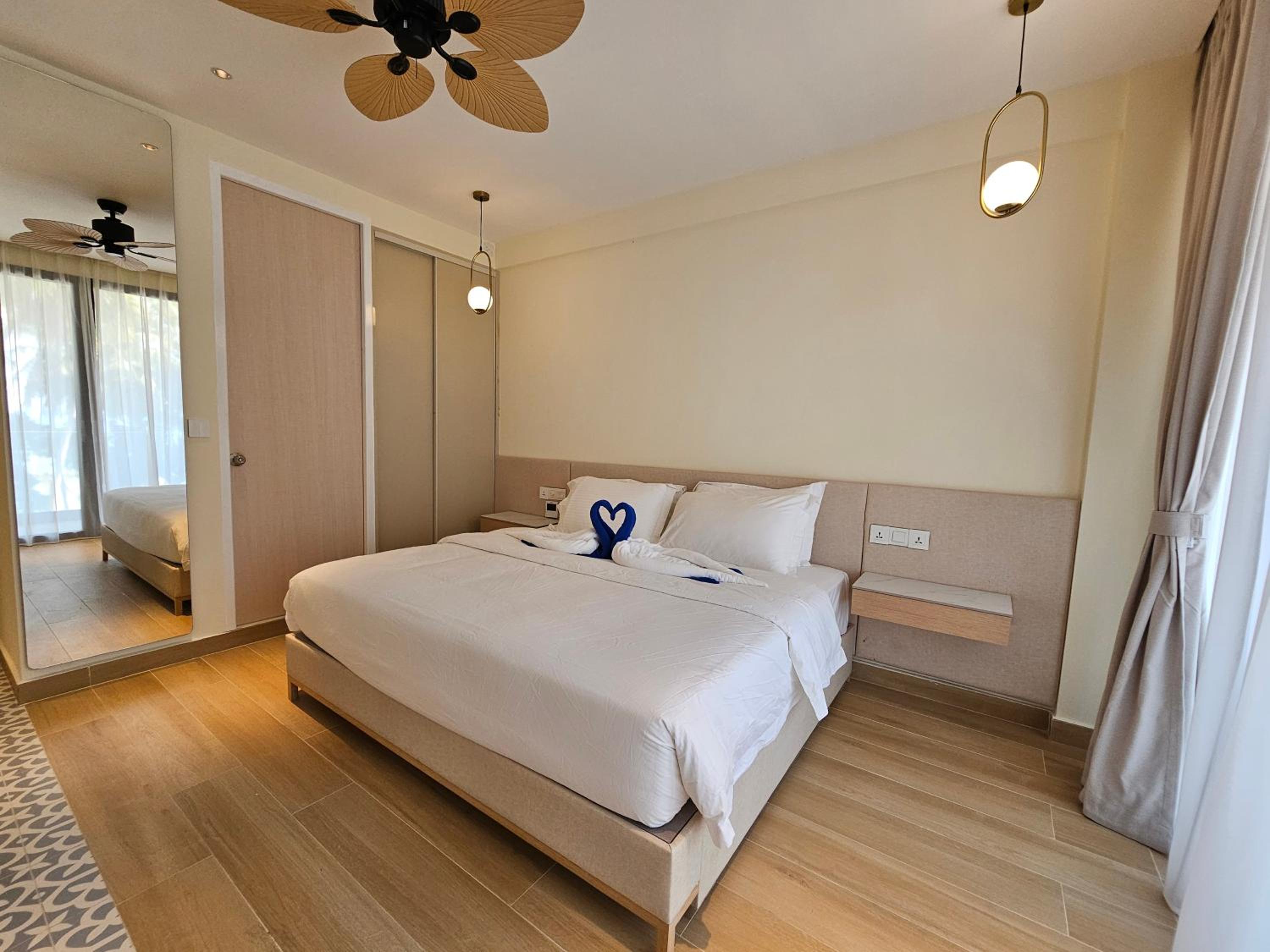 Location is excellent close to the shore, in a peaceful, less-trafficker part of the island. Cleanliness is incredible, the staff is literally cleaning the hotel floor continuously, everything feels super clean, they change room towels everyday, clean the rooms everyday, clean new beach towels everyday, make the beds - I really felt incredible. Views from the rooms facing the sea are super nice. The beds are huge - can fit a couple and 2 kids I believe 😌 I also liked the excursion staff - I made 3 excursions with them to snorkel with the sharks, dolphins, turtles, visit the sand bank and the coral garden - all 3 incredible - the guys are really nice, protective and they will also film you underwater.