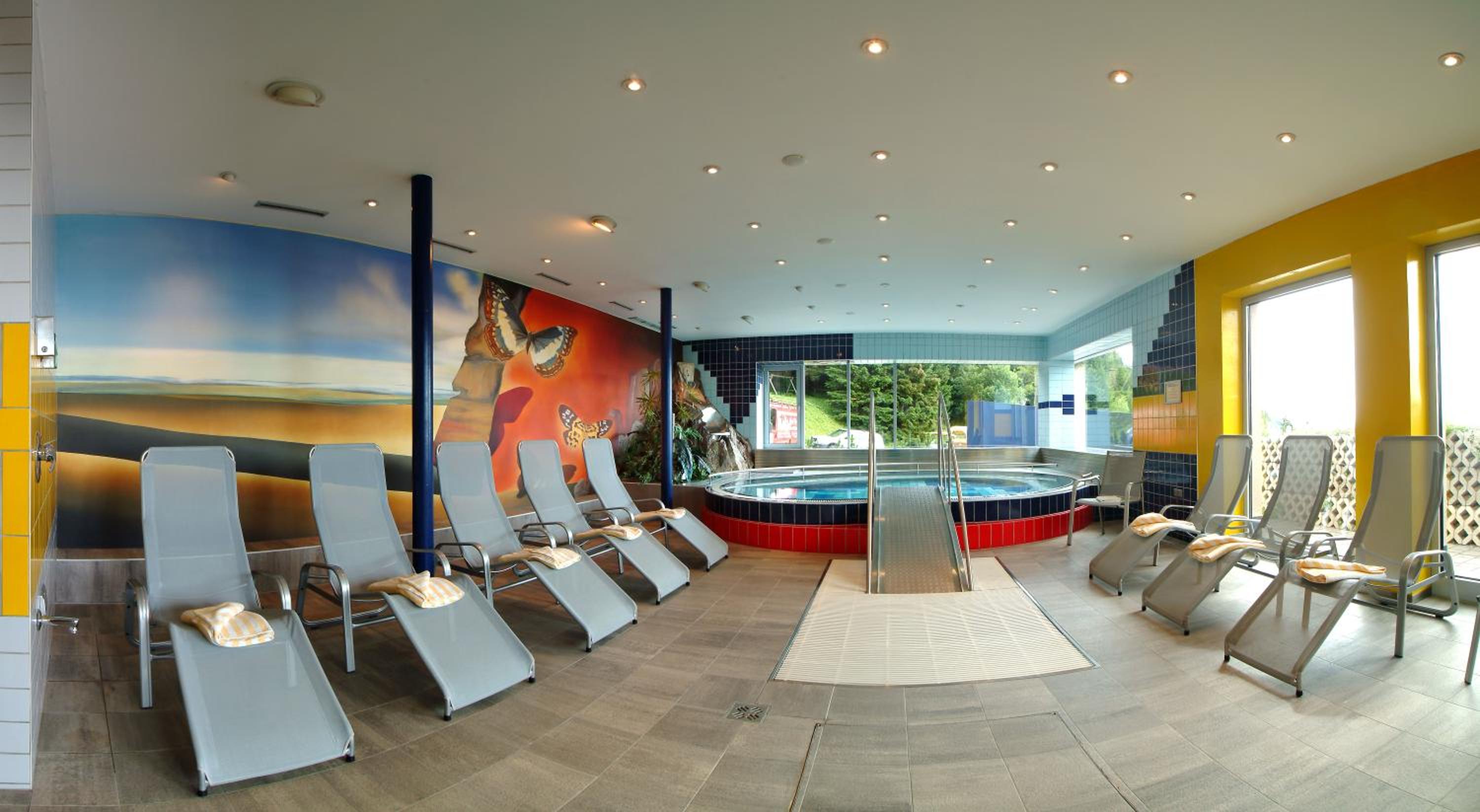 Indulge in relaxation at the large spa area featuring a sauna, steam bath, hot tub, sun bed, and a variety of massage options including Ayurveda.