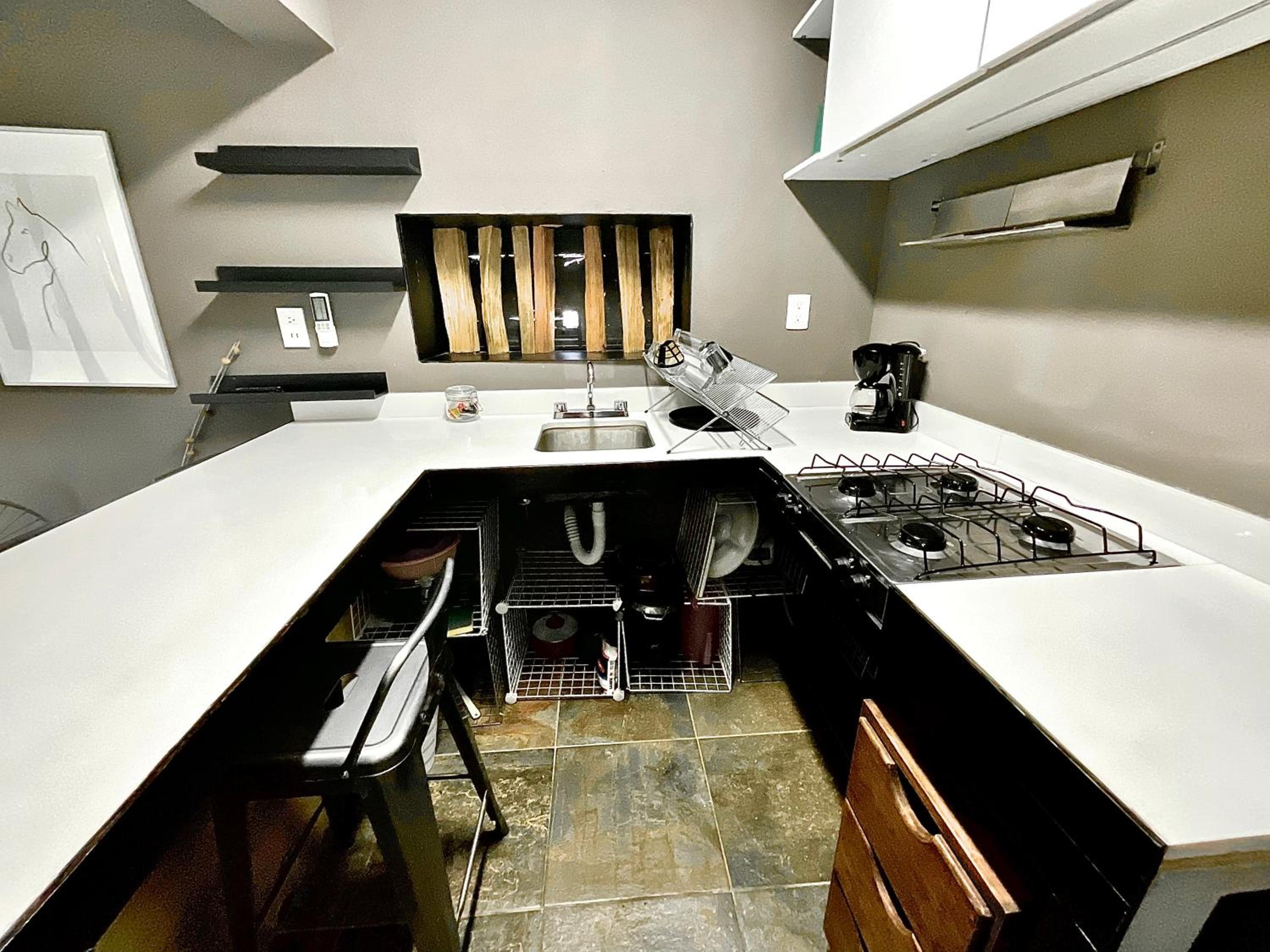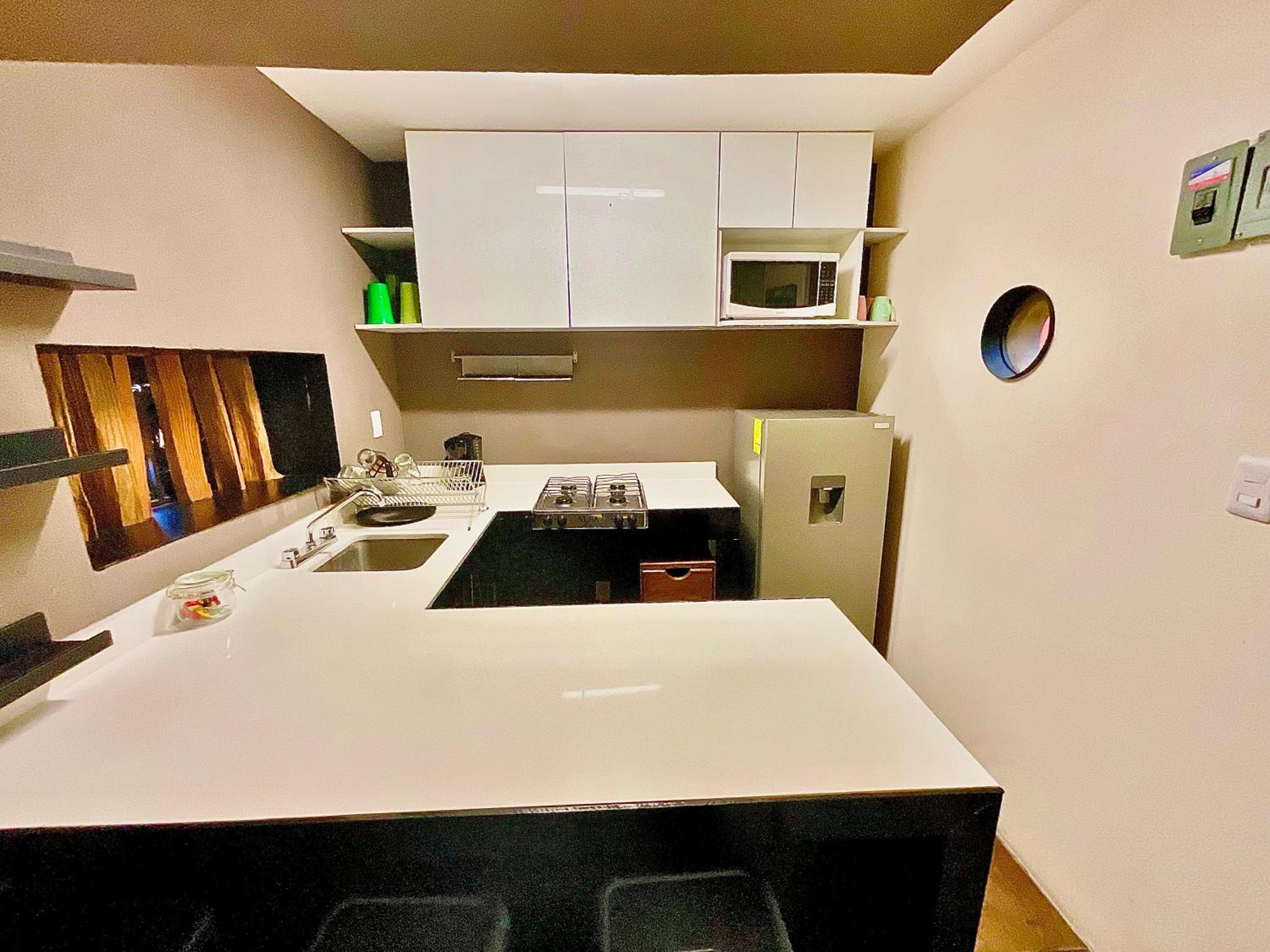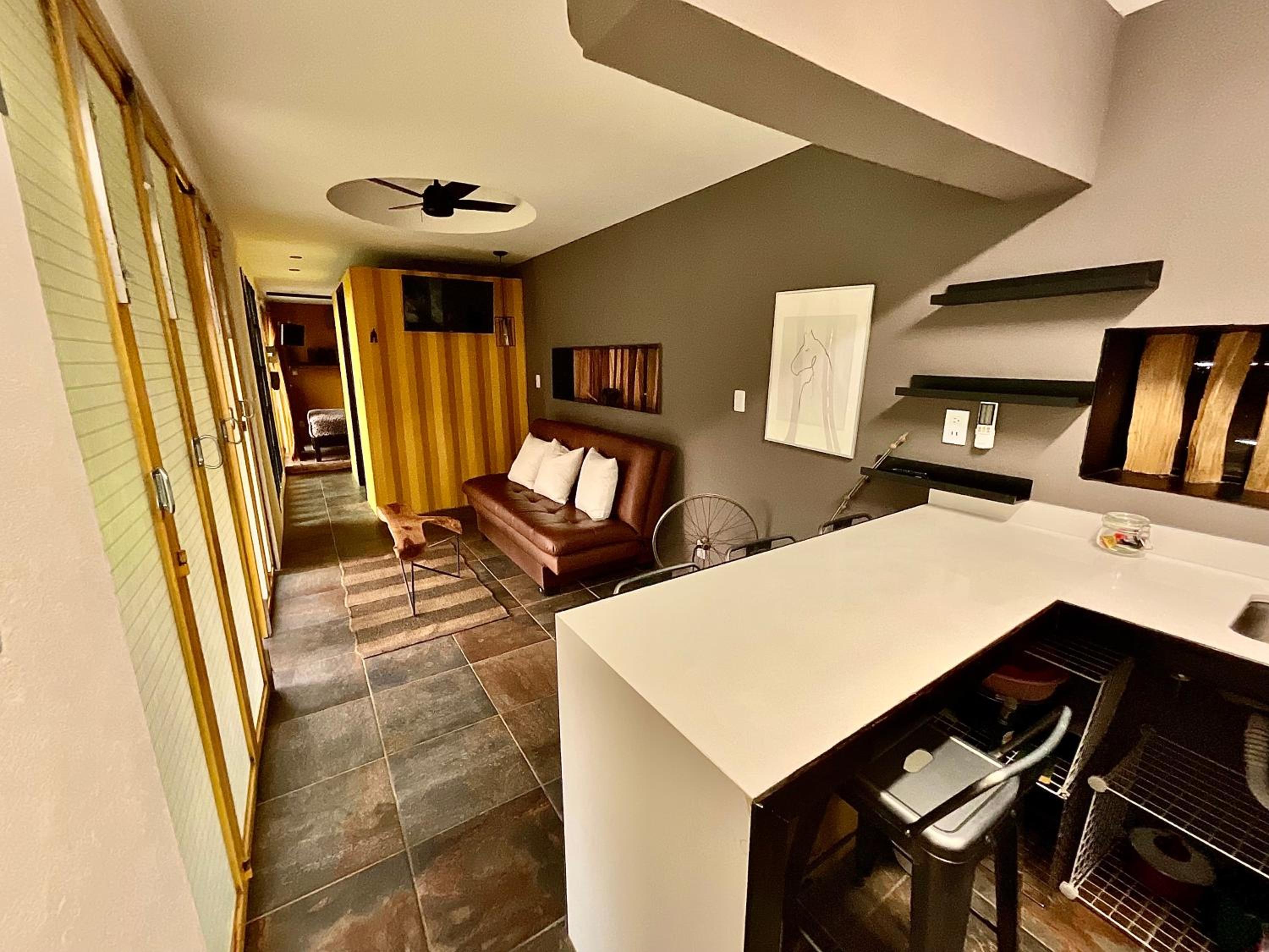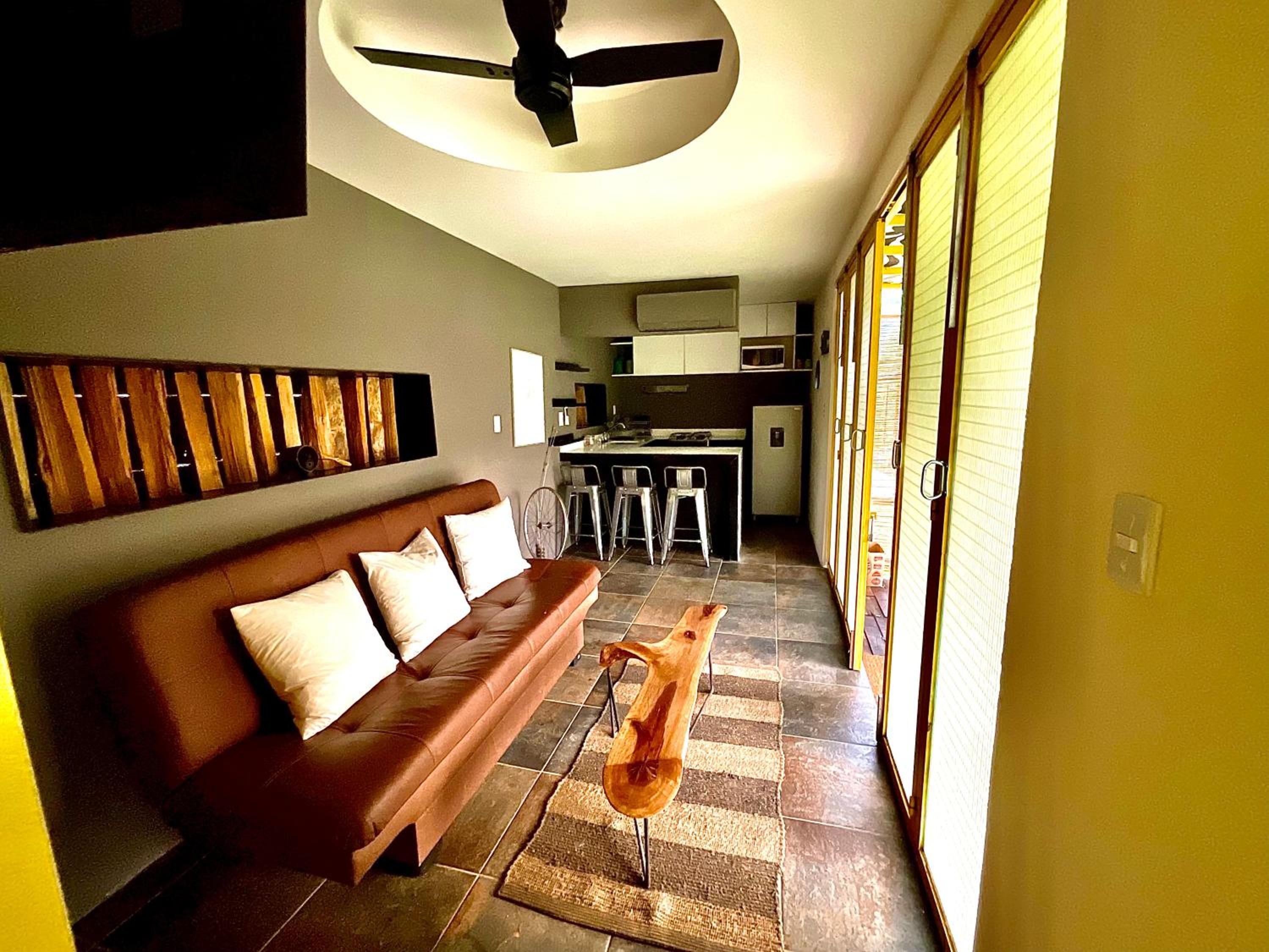 Modern Amenities: Relax in a fully equipped apartment with a flat-screen TV and kitchen.