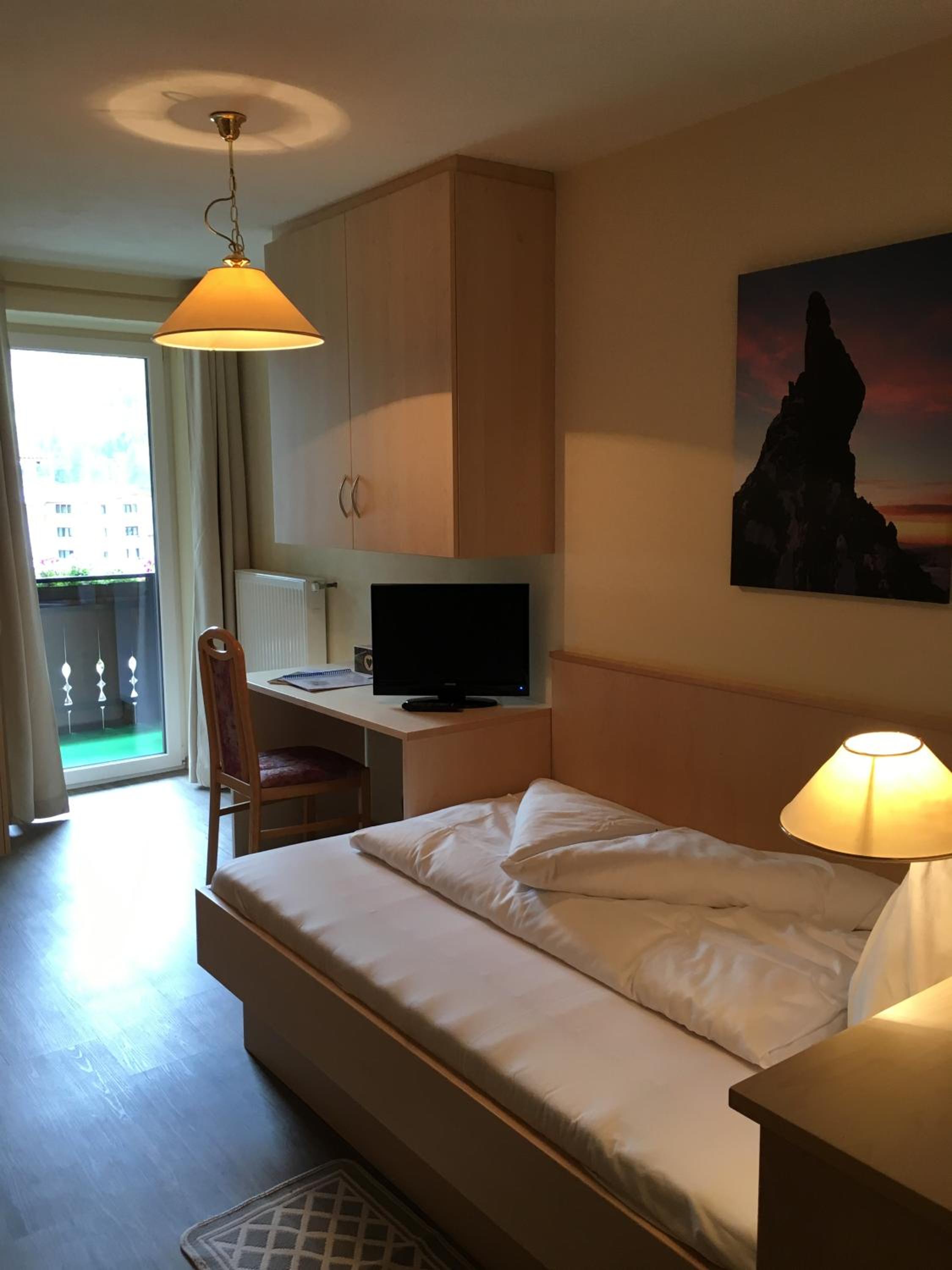 Immerse yourself in the traditional mountain atmosphere of Hotel Cornelia's rooms, each offering stunning valley or mountain views from a private balcony. The light-wood furniture and modern amenities like flat-screen TVs ensure a comfortable stay.