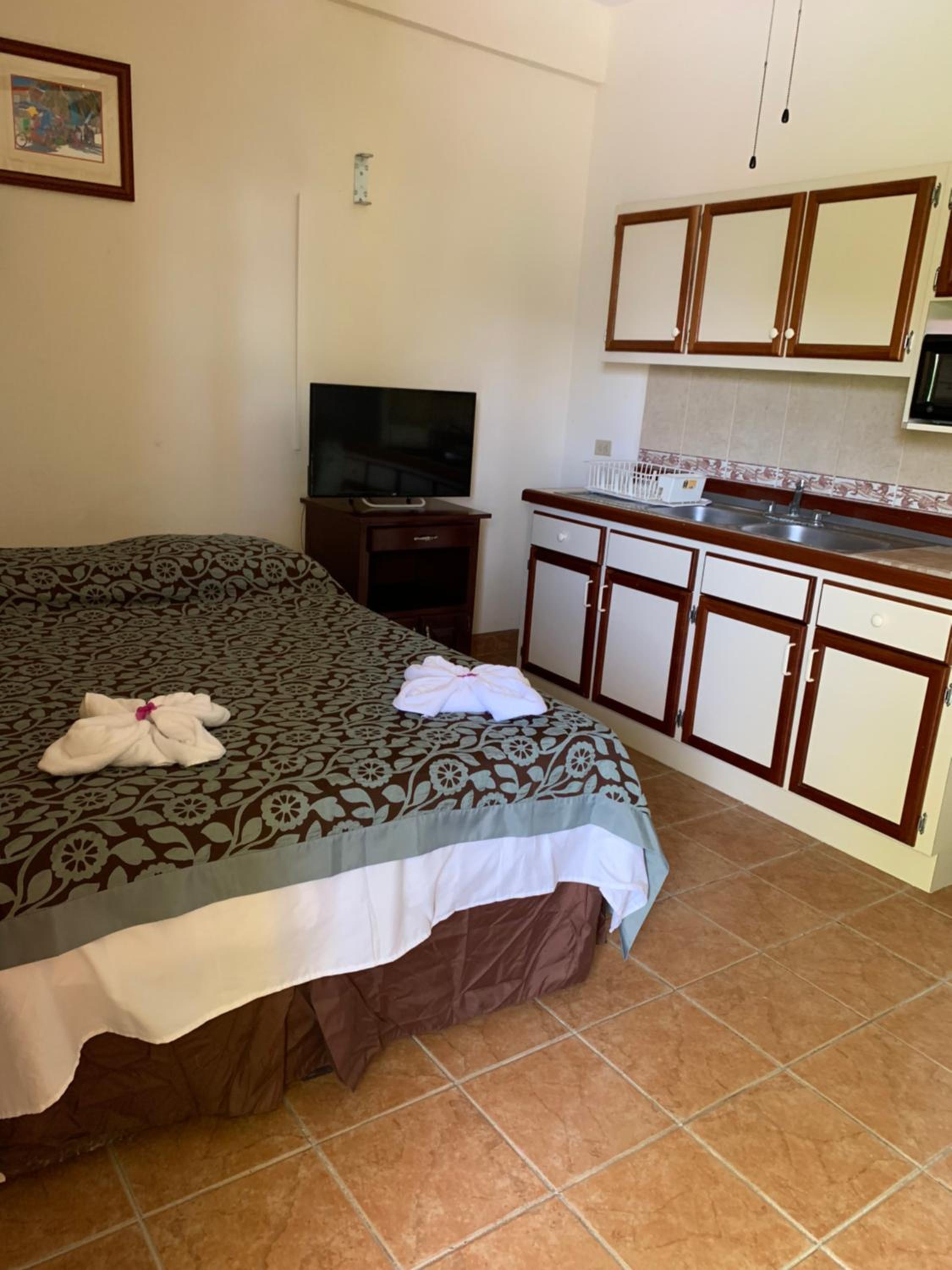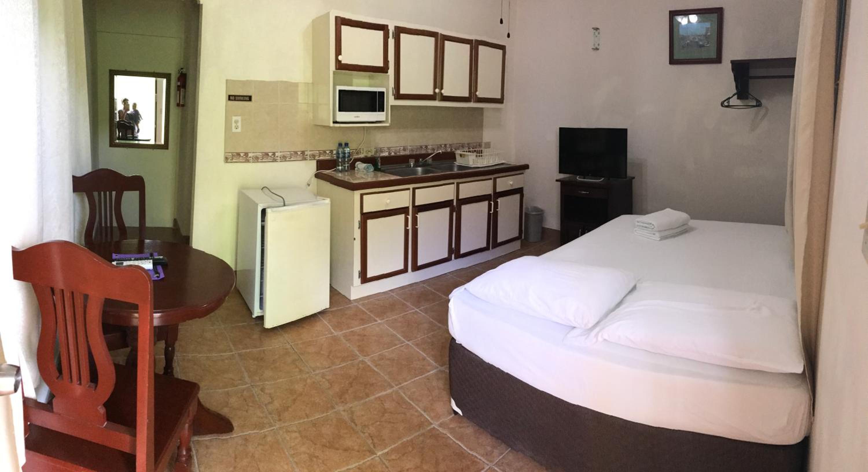 The bed was old and worn out. Didn't need or ask for a kitchenette, but at that price. I din't feel like I was paying a lot extra for it. Two people would have to share a shower to have enough hot water.