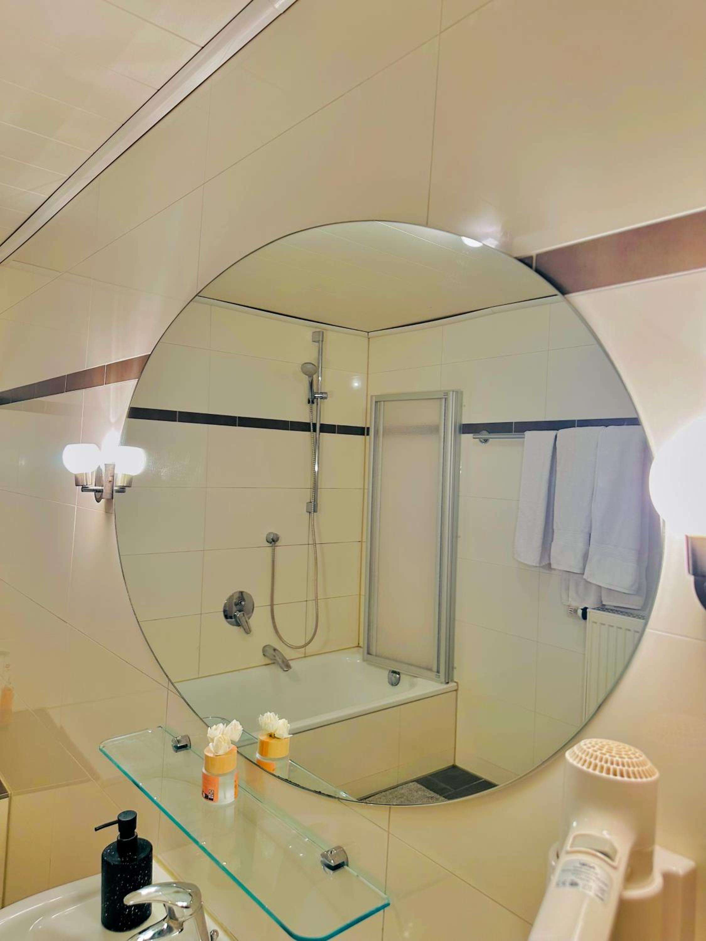 Das Zimmer war schön groß. Einrichtung hat mir auch gut gefallen. Alle waren sehr freundlich. Ein Herr hat sogar unseren Koffer hoch getragen. Handtücher waren sauber und haben sehr gut gerochen. Es gab Duschgel und Shampoo sogar. Im Sommer ist es bestimmt noch schöner da wir einen Biergarten mit Schaukel und Rutsche gesehen haben.