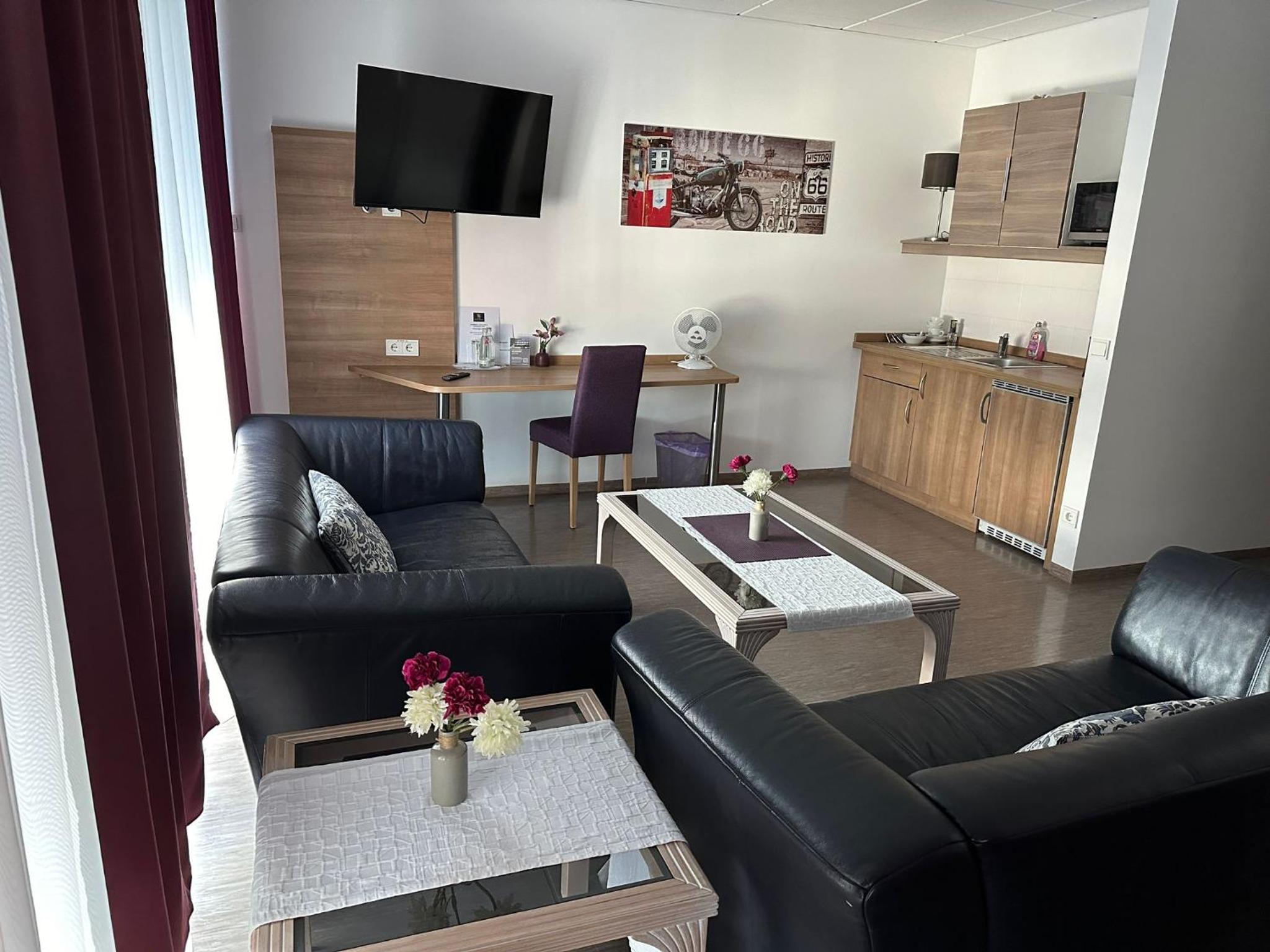 The hotel offers well-equipped rooms with modern amenities including a flat-screen TV, private bathroom, and kitchenette in selected rooms.