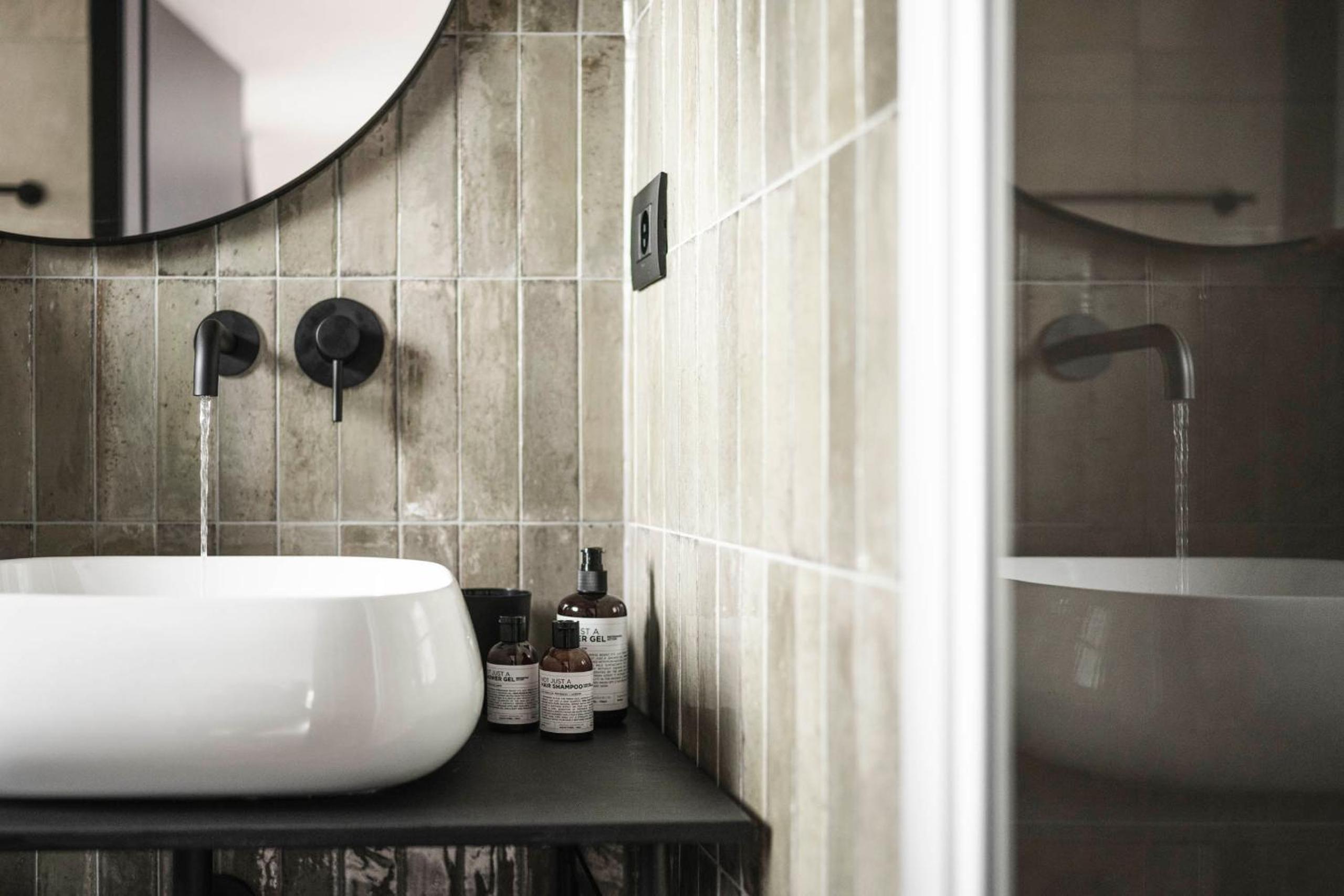 Die offene Dusche und der Waschbereich im Zimmer.