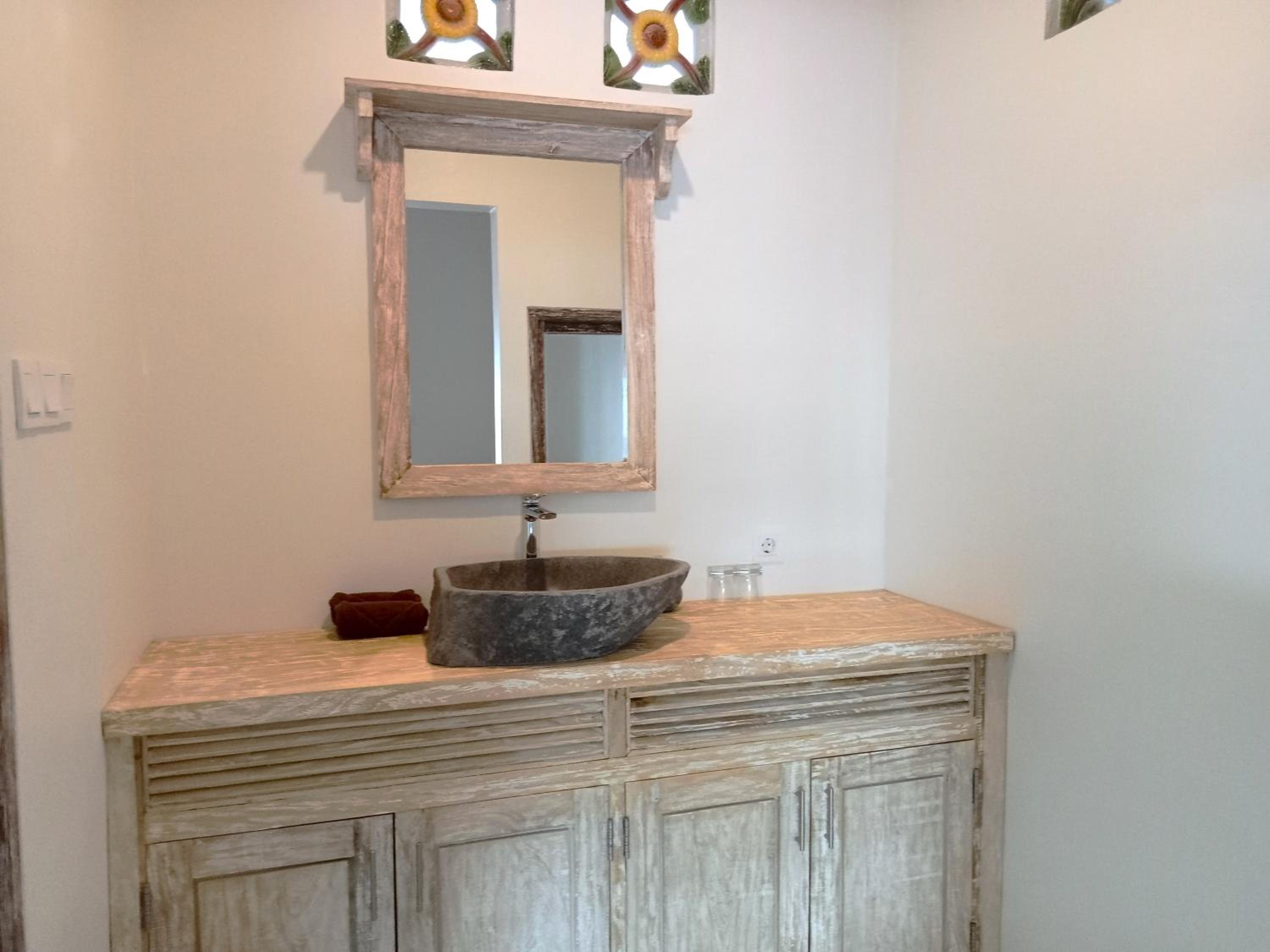 • The bathroom is also nice and clean.