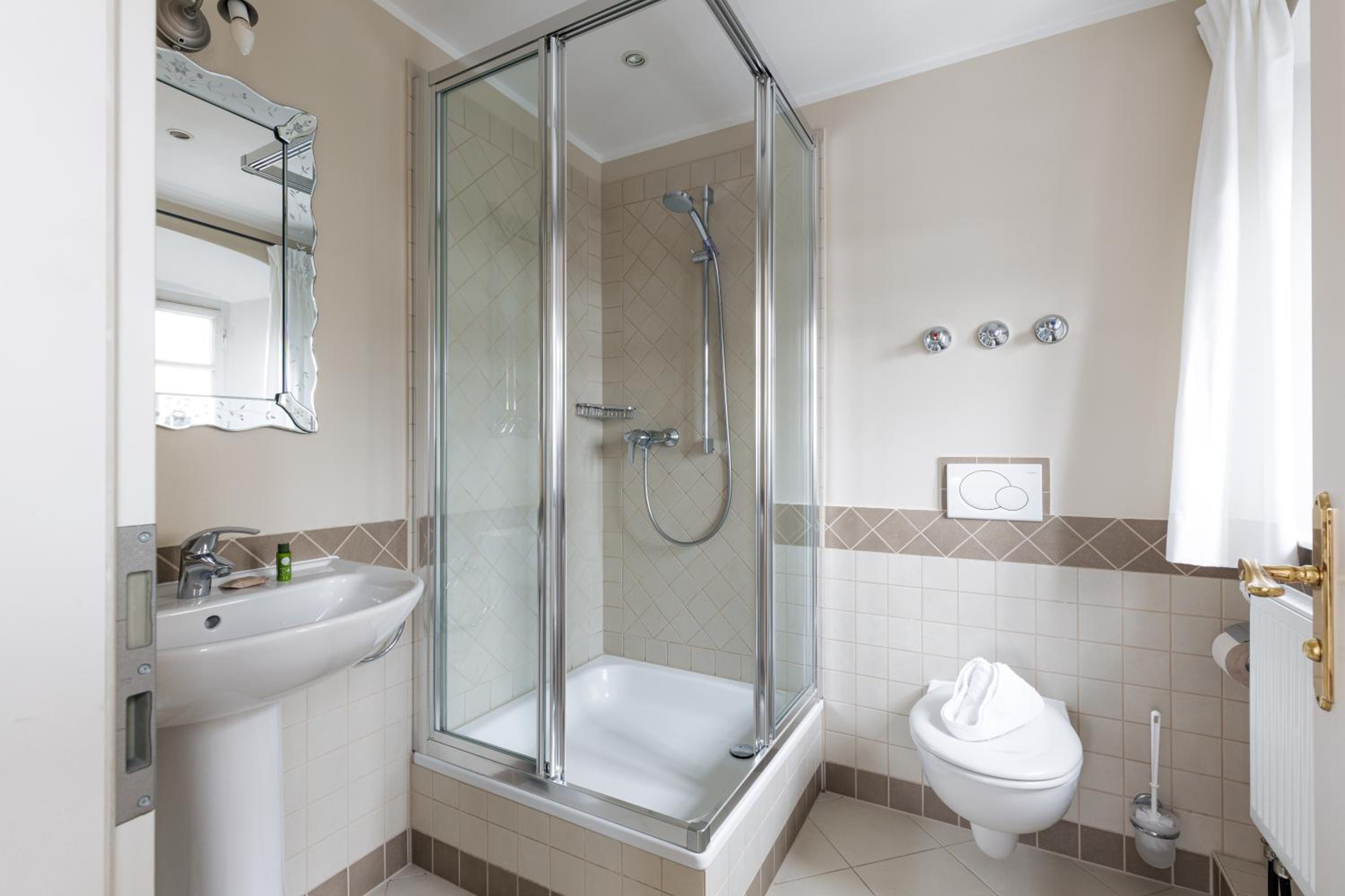 Im Bad habe ich im Spiegel nur meine Stirn gesehen ( Größe 157). Und kein Wasserkocher, keine Gläser/Tassen im Zimmer(.
