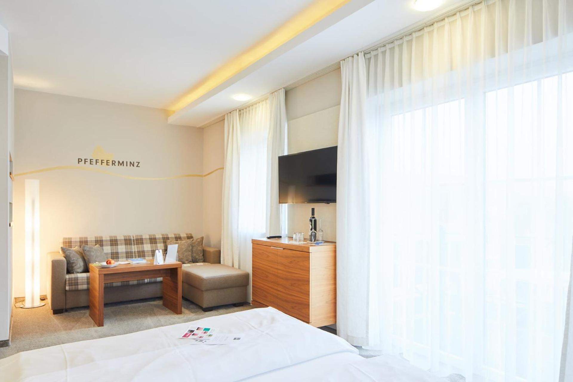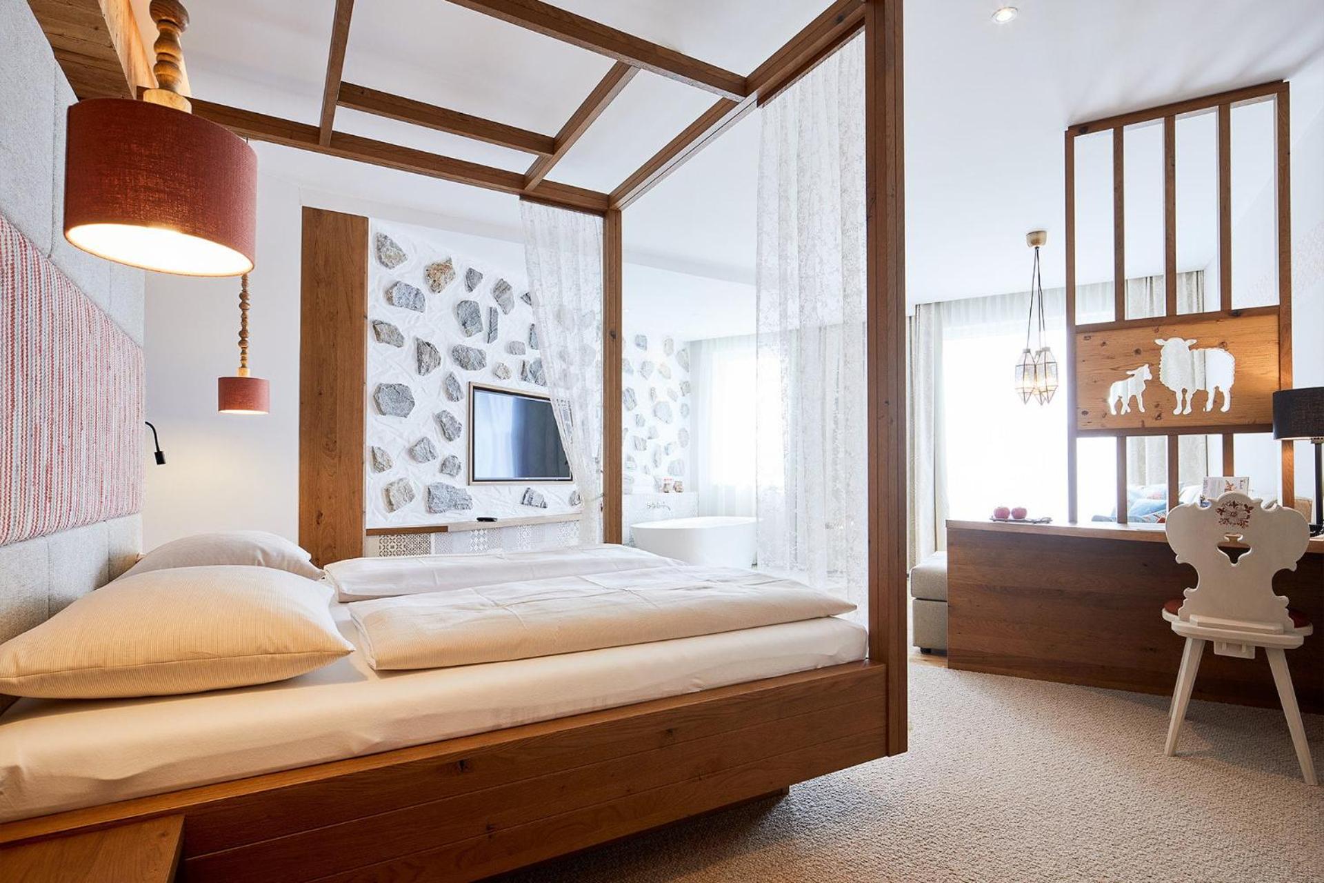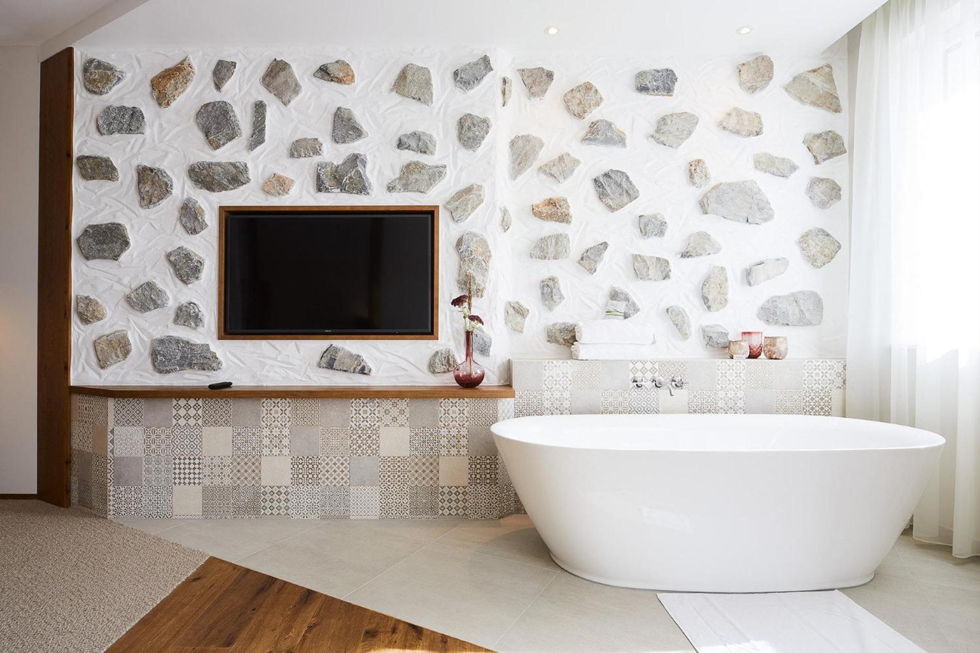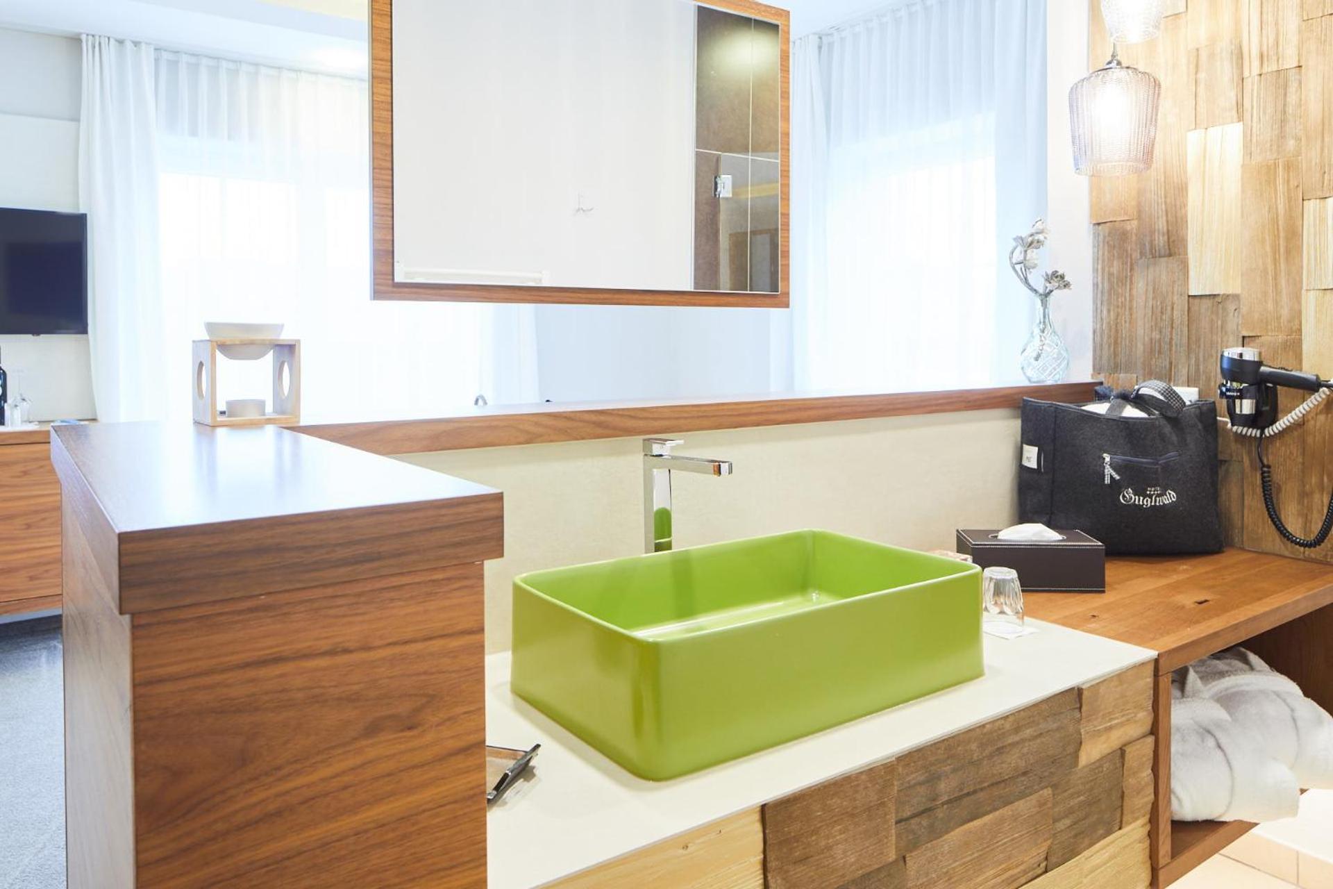 Each room at Hotel Guglwald is equipped with modern amenities, including a flat-screen TV, private bathroom, and balcony with pool views.