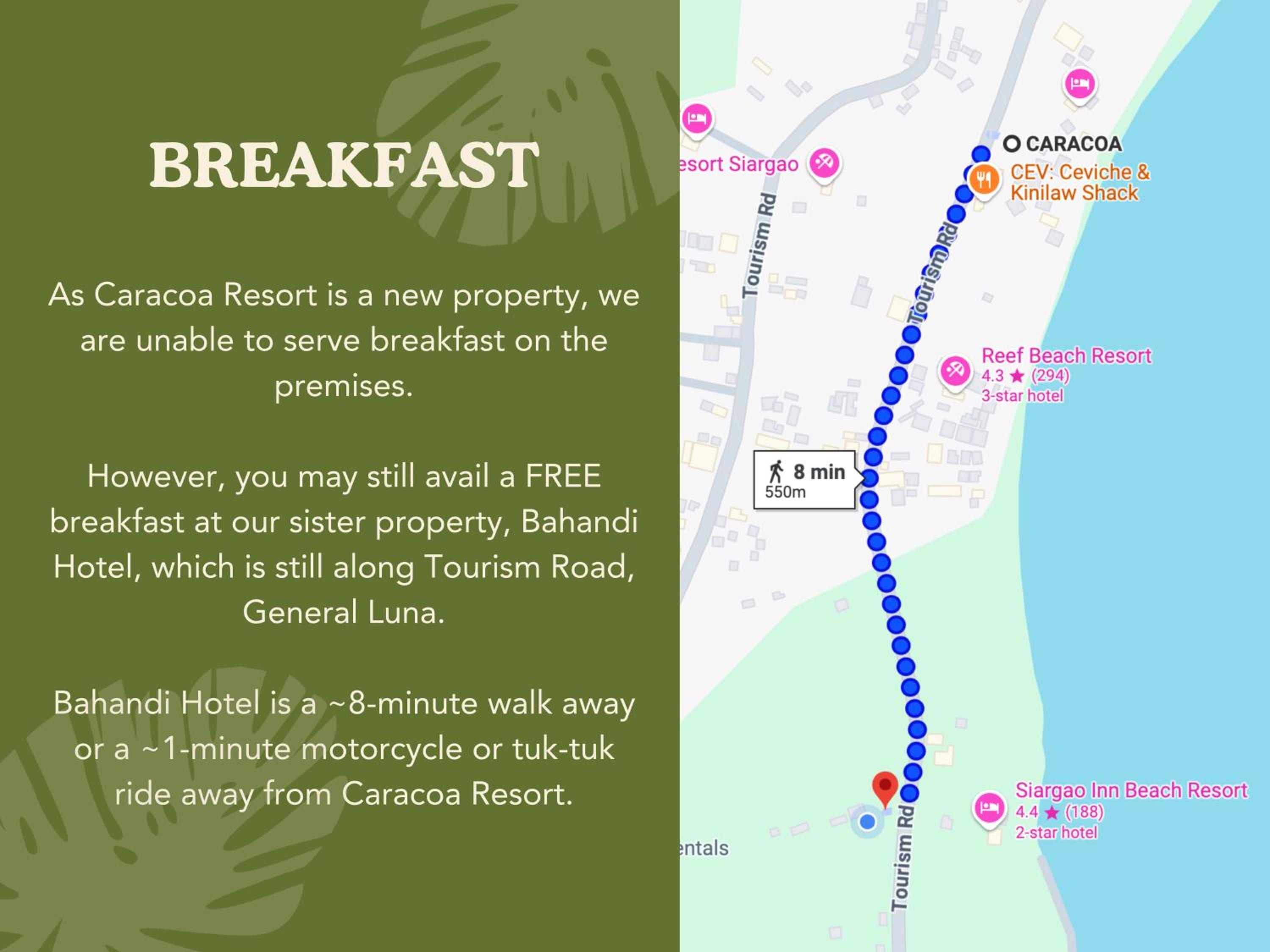 The location is great, the atmosphere is relaxing, and the overall experience exceeded our expectations. We would definitely stay here again and highly recommend Caracoa Resort to anyone visiting Siargao.