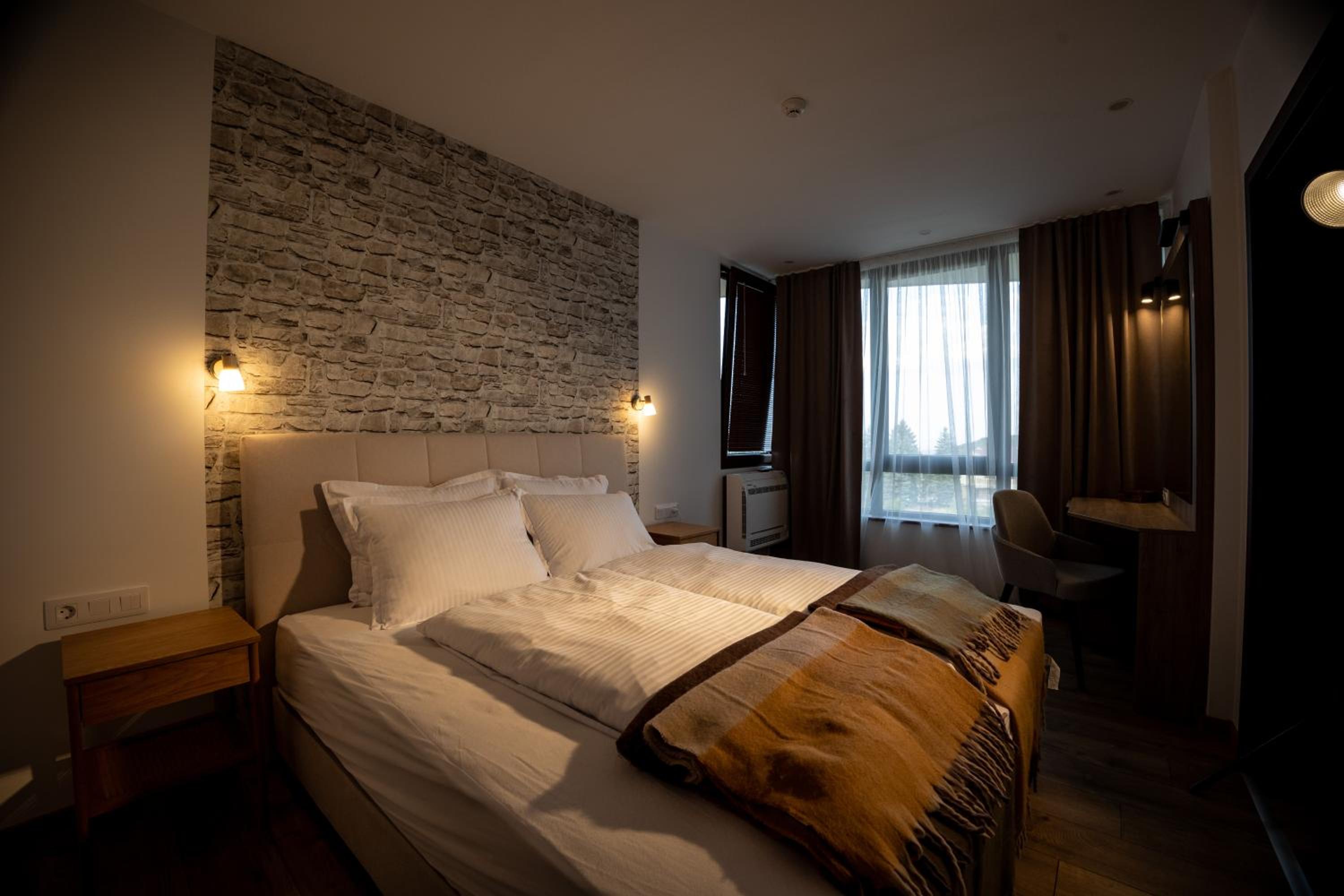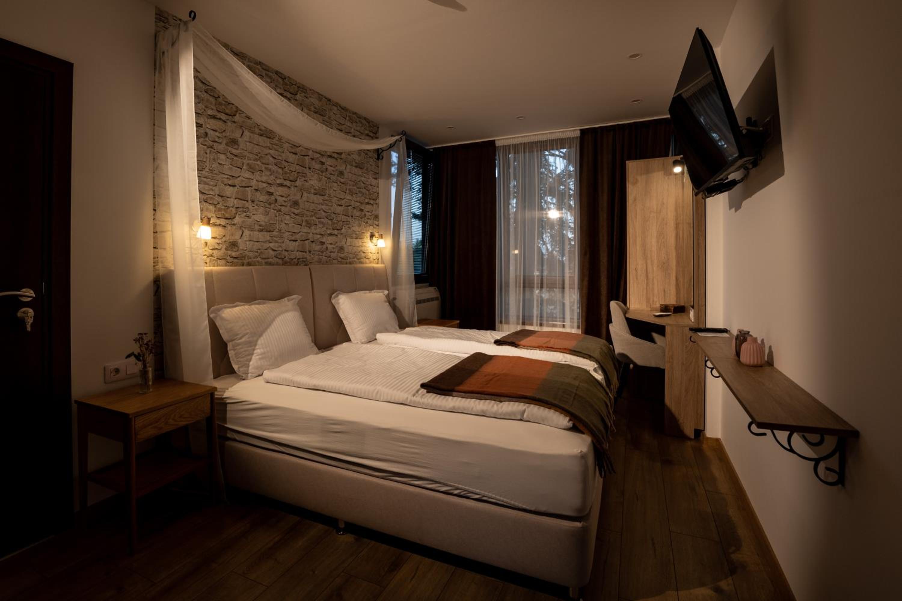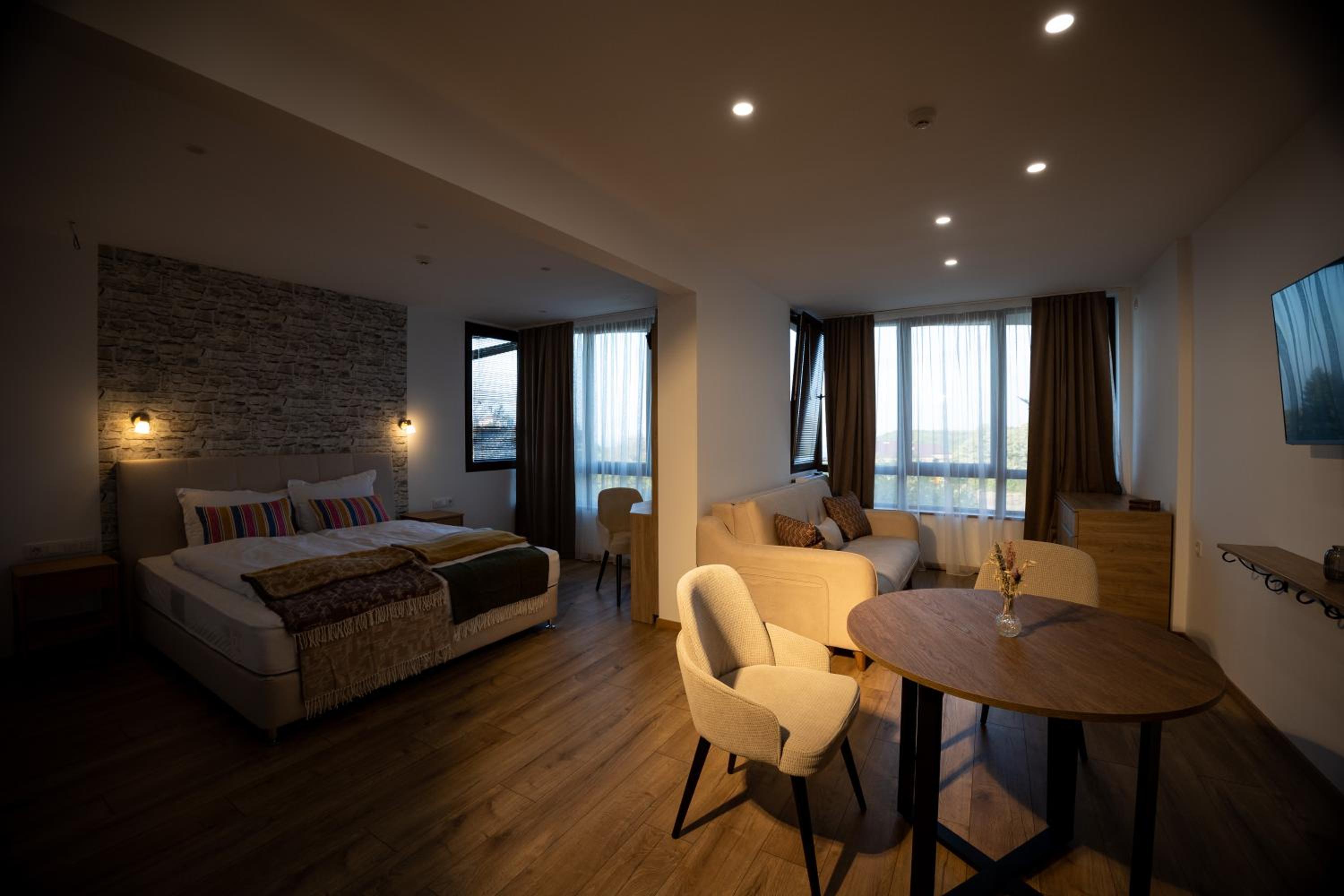 Отель новый, в нашем номере даже новой мебелью еще пахло. Наш номер (студио) был очень просторным. Было очень чисто, кровать и диван были удобными. Вид из окна был на крепостную стену и ели. Сервис очень понравился. Персонал был обходительным, услужливым, очень помогал, когда нам это было необходимо. Очень понравился ресторан при отеле. Вкусно и уютно. Неплохая территория, красивые места (отель находится в окружении леса). Рядом немало достопримечательностей. Обязательно приедем еще! Рекомендуем
