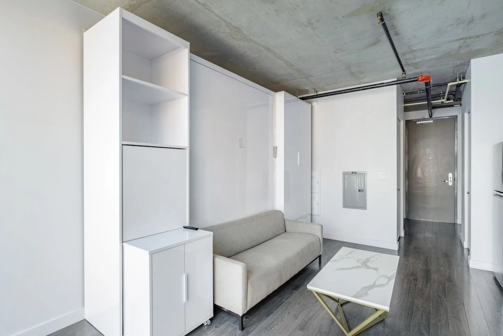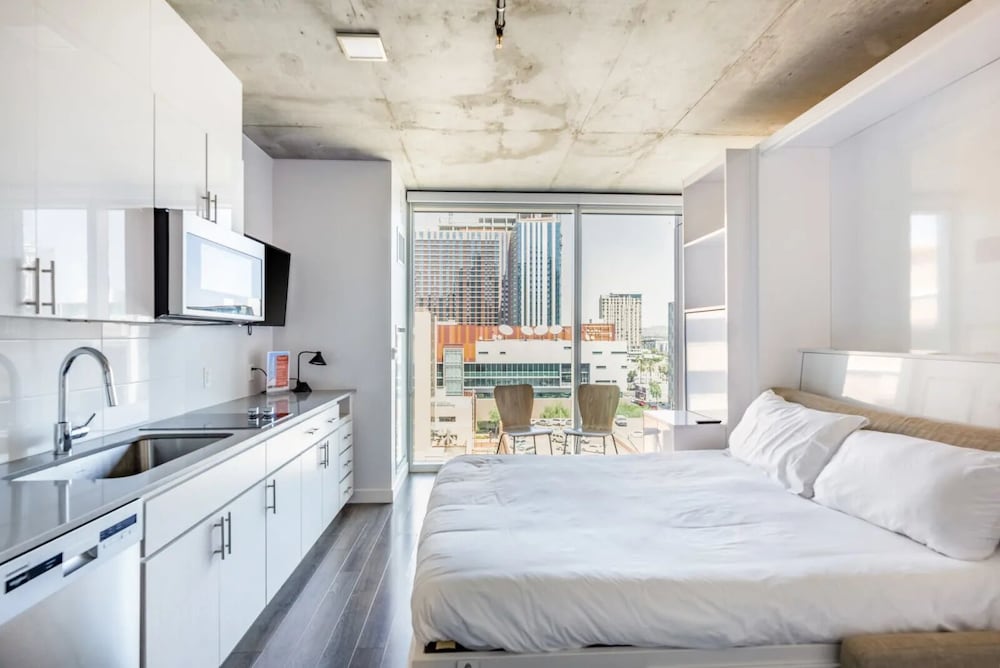 Very nice place, conveniently located, modern upscale apartment complex. Friendly, welcoming and helpful staff. Three big elevators are very fast. Excellent security. Very quiet despite being in the downtown area. Kitchenette with full size refrigerator, big microwave, stove top, kitchen and dining wares was very useful. The mezzinnine area was excellent, big and comfortable. Outside large patio nicely furnished. Workout gym and pool. Garage parking available. But Metro light rail and bus stops are close by. Easy to get around without renting a car. Take light rail into town from the airport. Nearest stop is only across the street. Beware, entrance is NOT on Central but rather Polk.