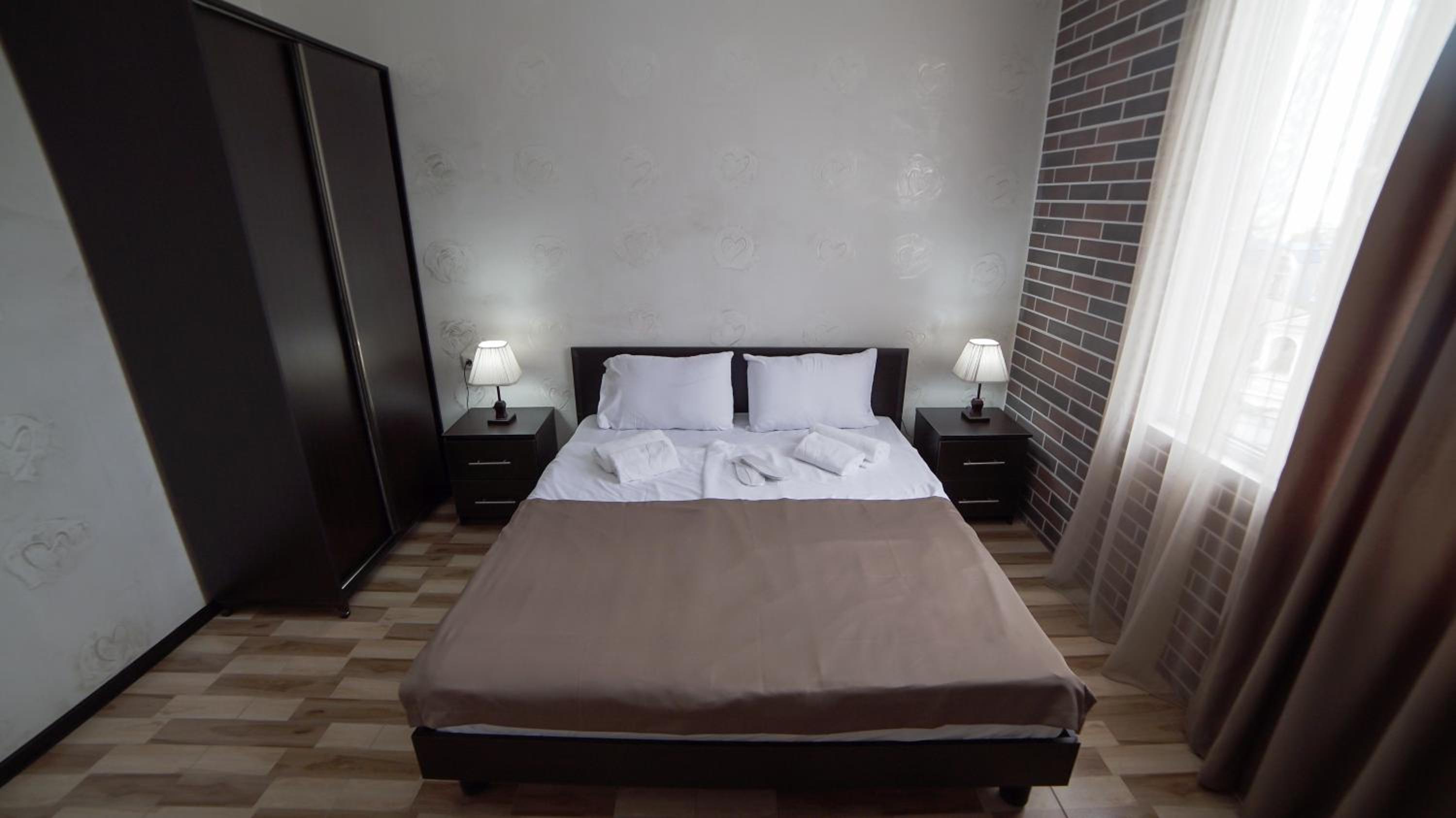 маленькая комната, дверь туалета сбоку напротив изголовья кровати в 40 см. нет шторки в душе, протекает вода по полу. сильно пахнет сыростью, повышенная влажность в помещении, от постельного белья был неприятный запах, низкая звукоизоляция, высокий шум, дверь в туалет полупрозрачная, не было освежителя воздуха
