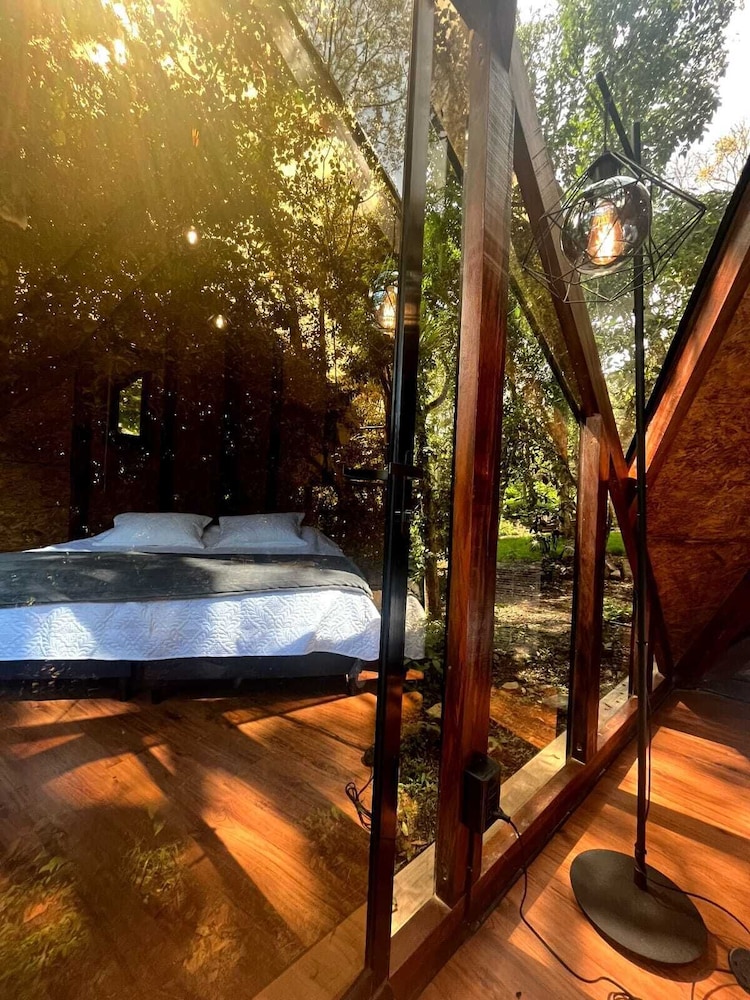 We stayed in the cabin. You feel part of nature here. The bathroom is separate but right next door (and private). The bed was super comfy.