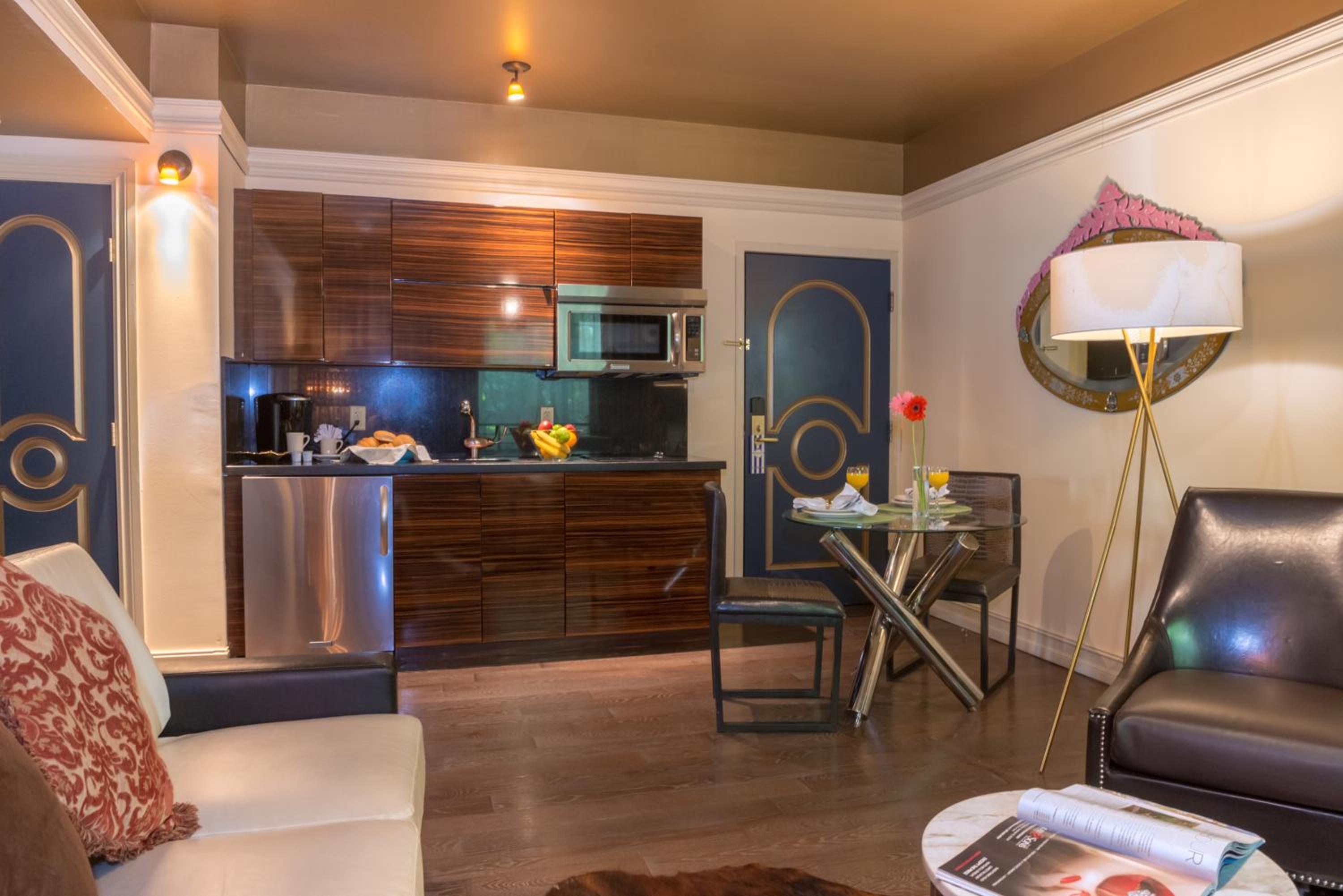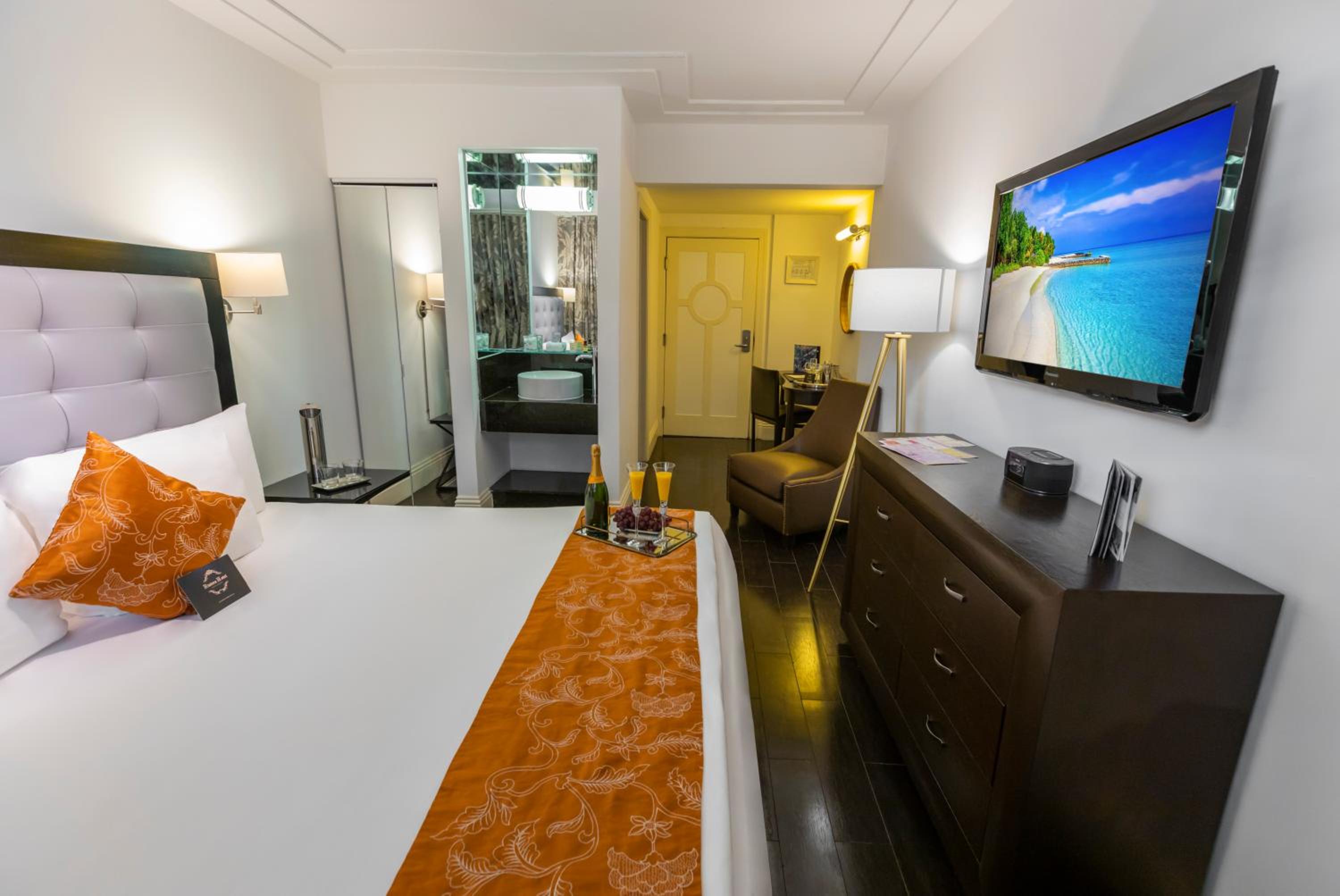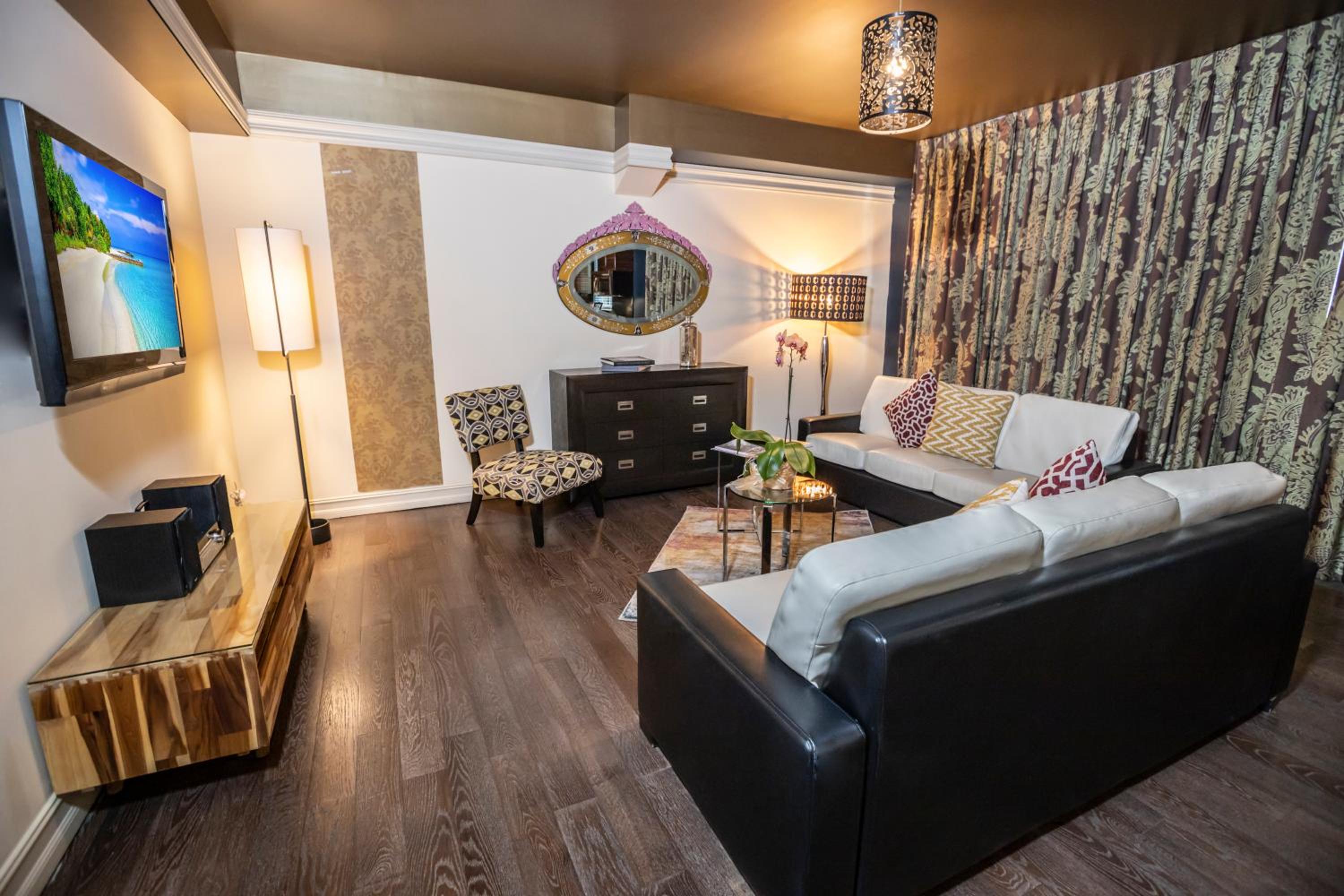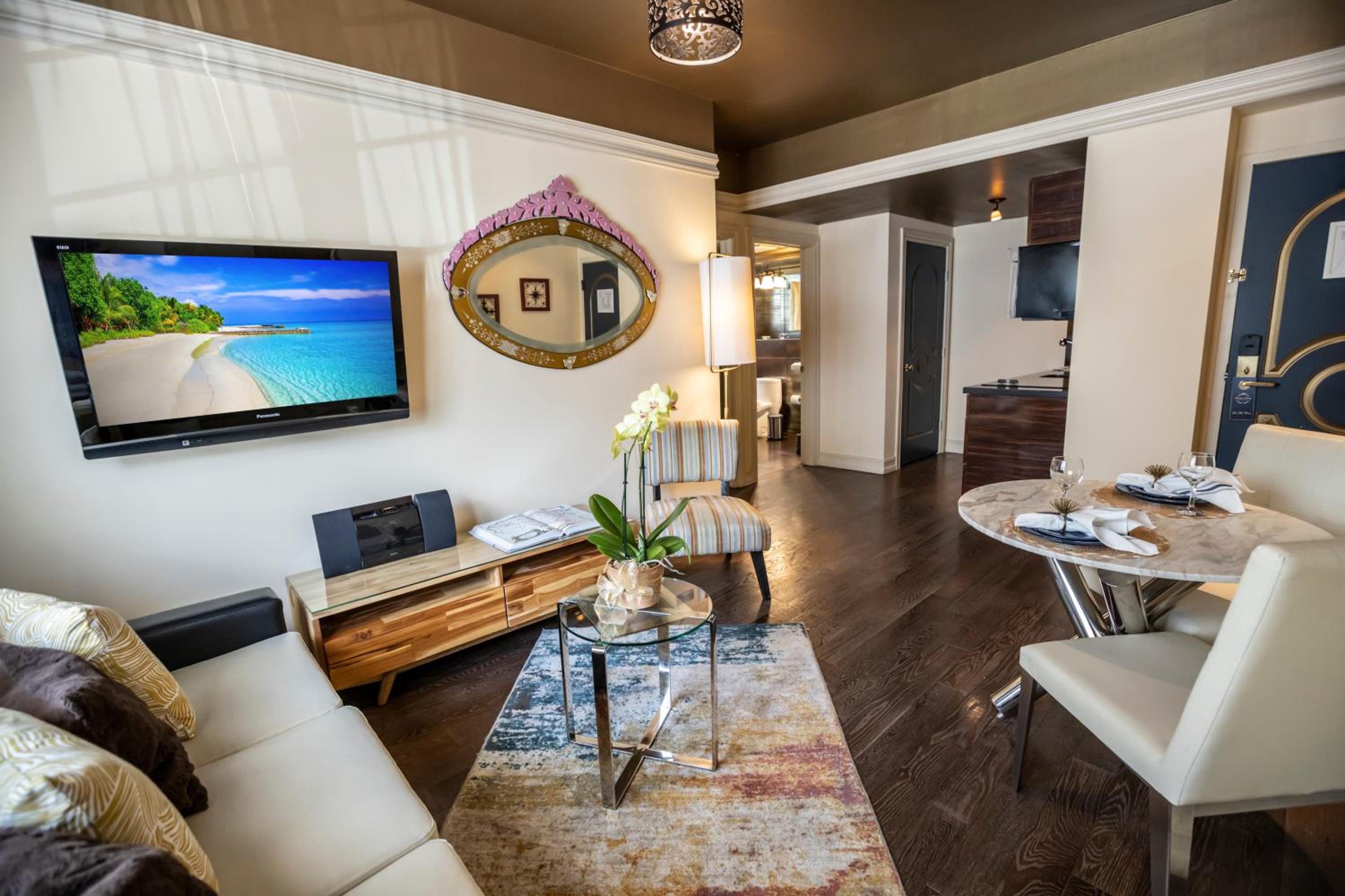 Riviera Suites offers spacious one-bedroom suites with modern décor, custom-designed furniture, and wooden floors. Each suite features a 42-inch flat-screen TV, providing a luxurious stay for our guests.