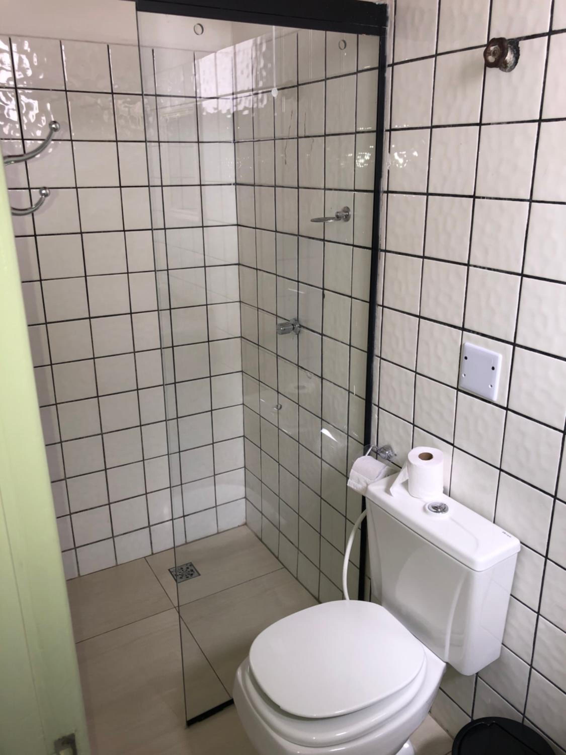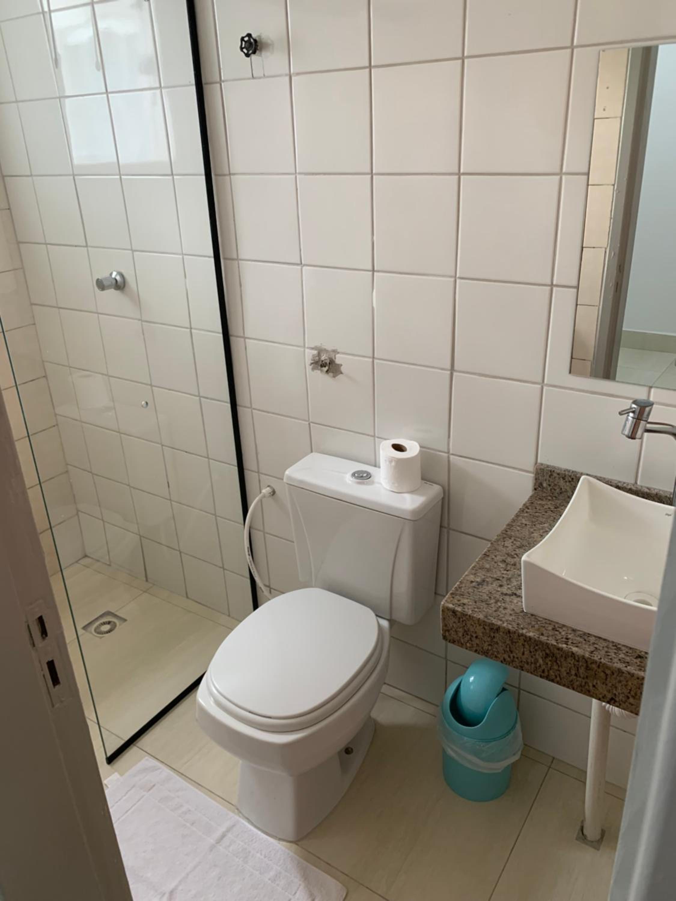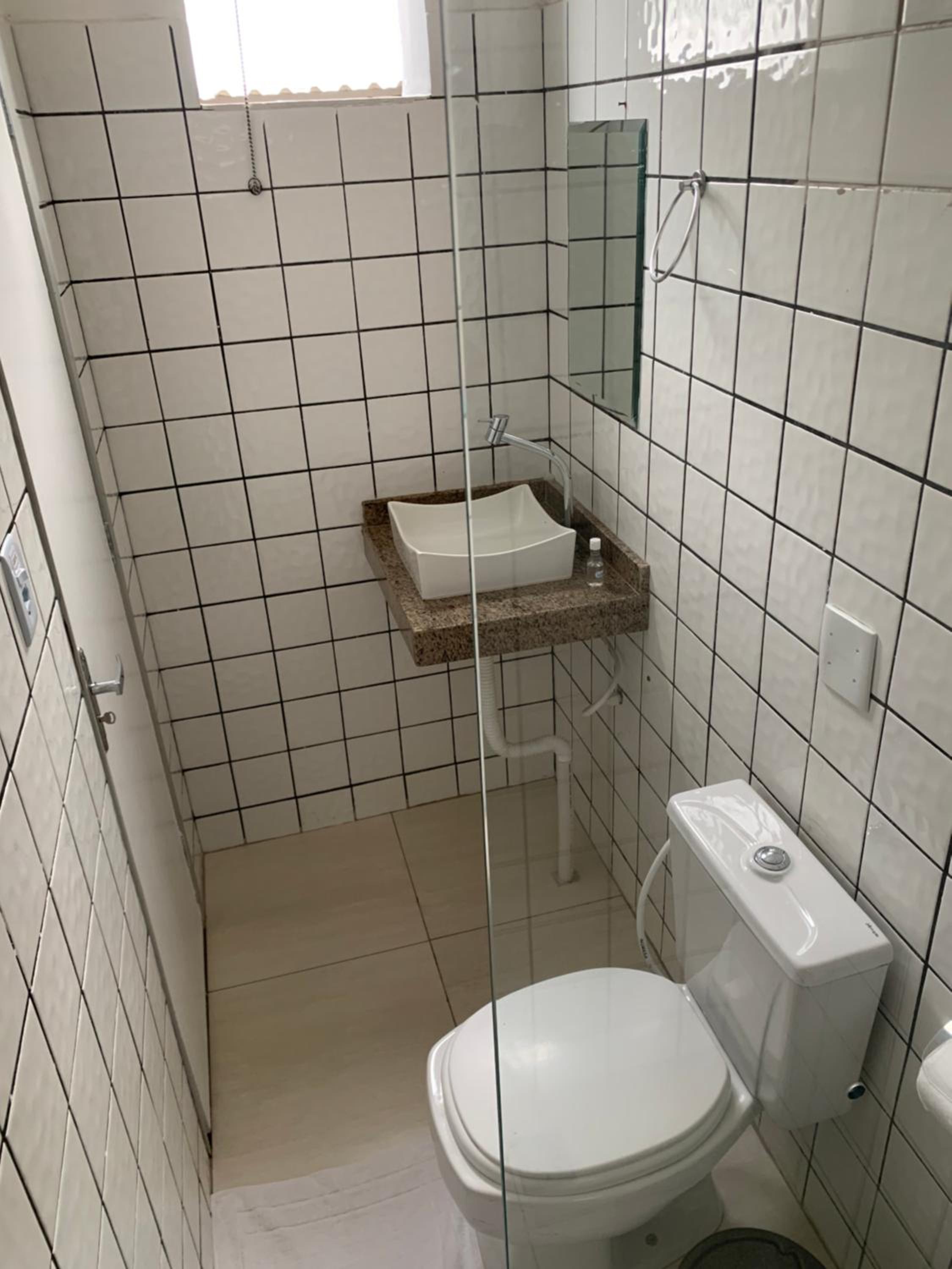 O quarto não é grande, a porta do banheiro abre e esbarra na pia, dificultando o acesso. O imóvel já começa a demostrar desgaste pelo tempo.
