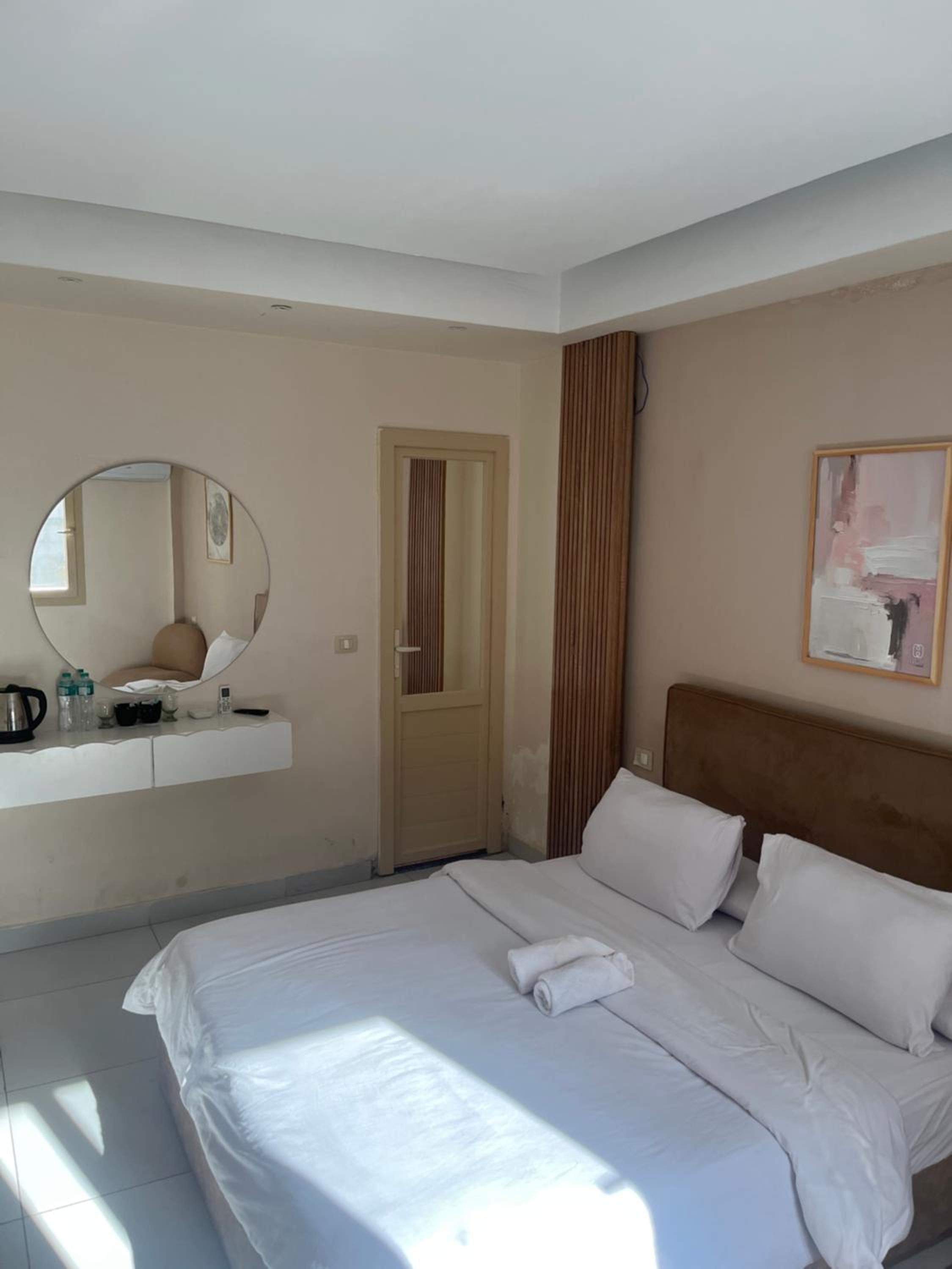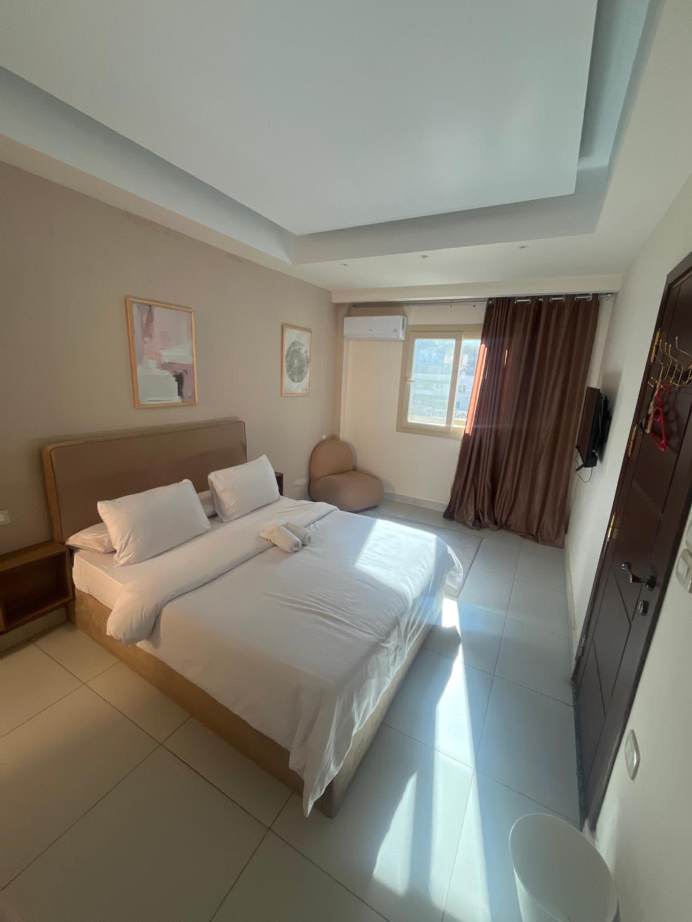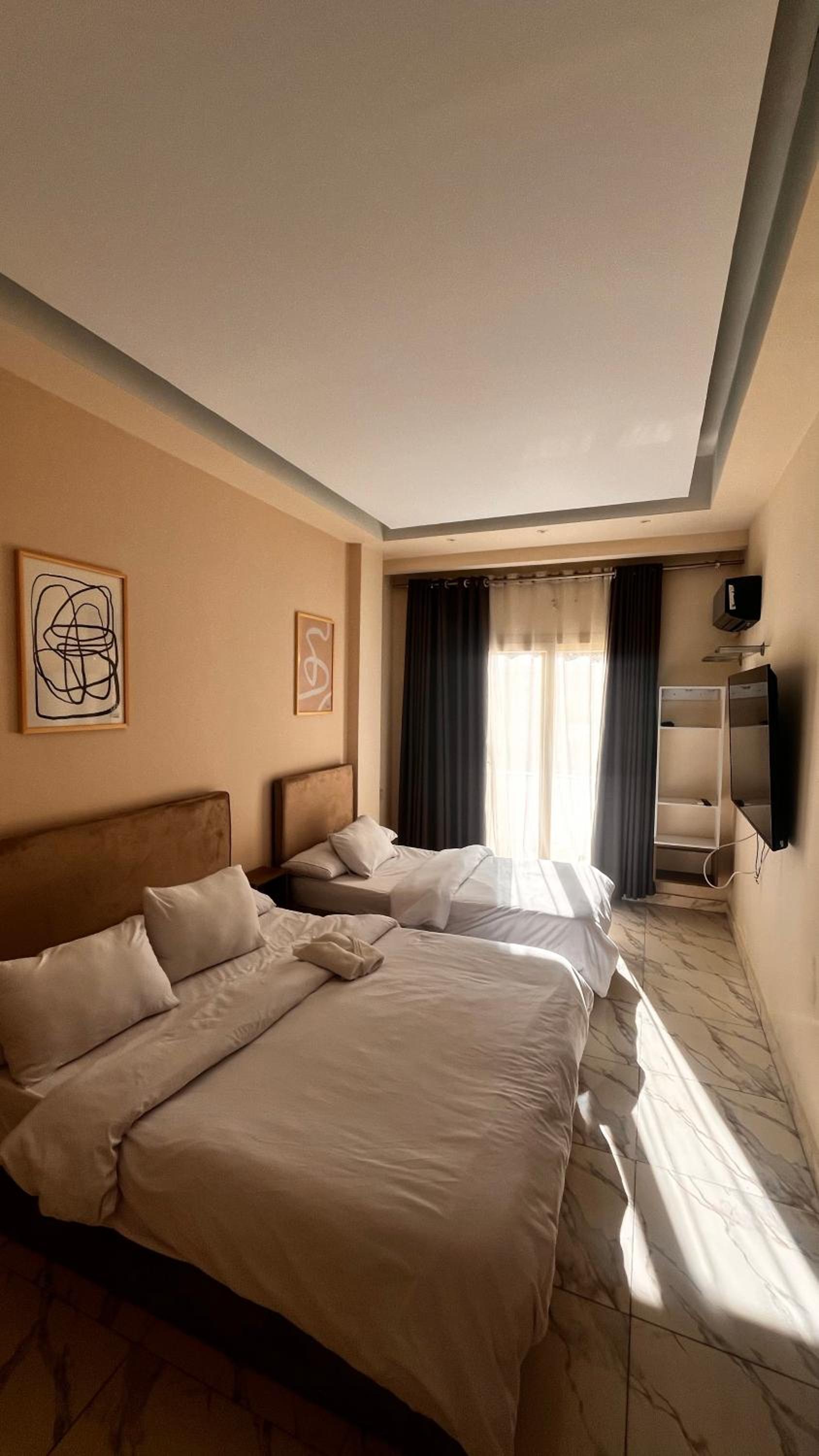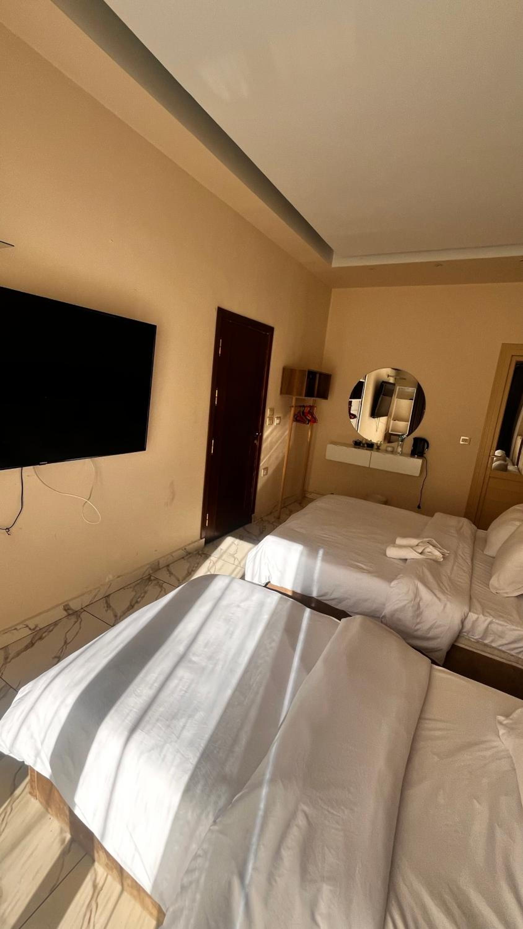 They were misleading us with the fake pictures and then told us that was the room we booked which was not true. The room was too small with tiny window, no view and dirty towels. The electricity was cut on us for 2 hours and also the water, in addition to no refrigerator during very hot temperature. There were no wardrobe. When we complained, they changed the room to a wider one but still with little to no facilities. Worst hotel I have ever been and so not recommended.