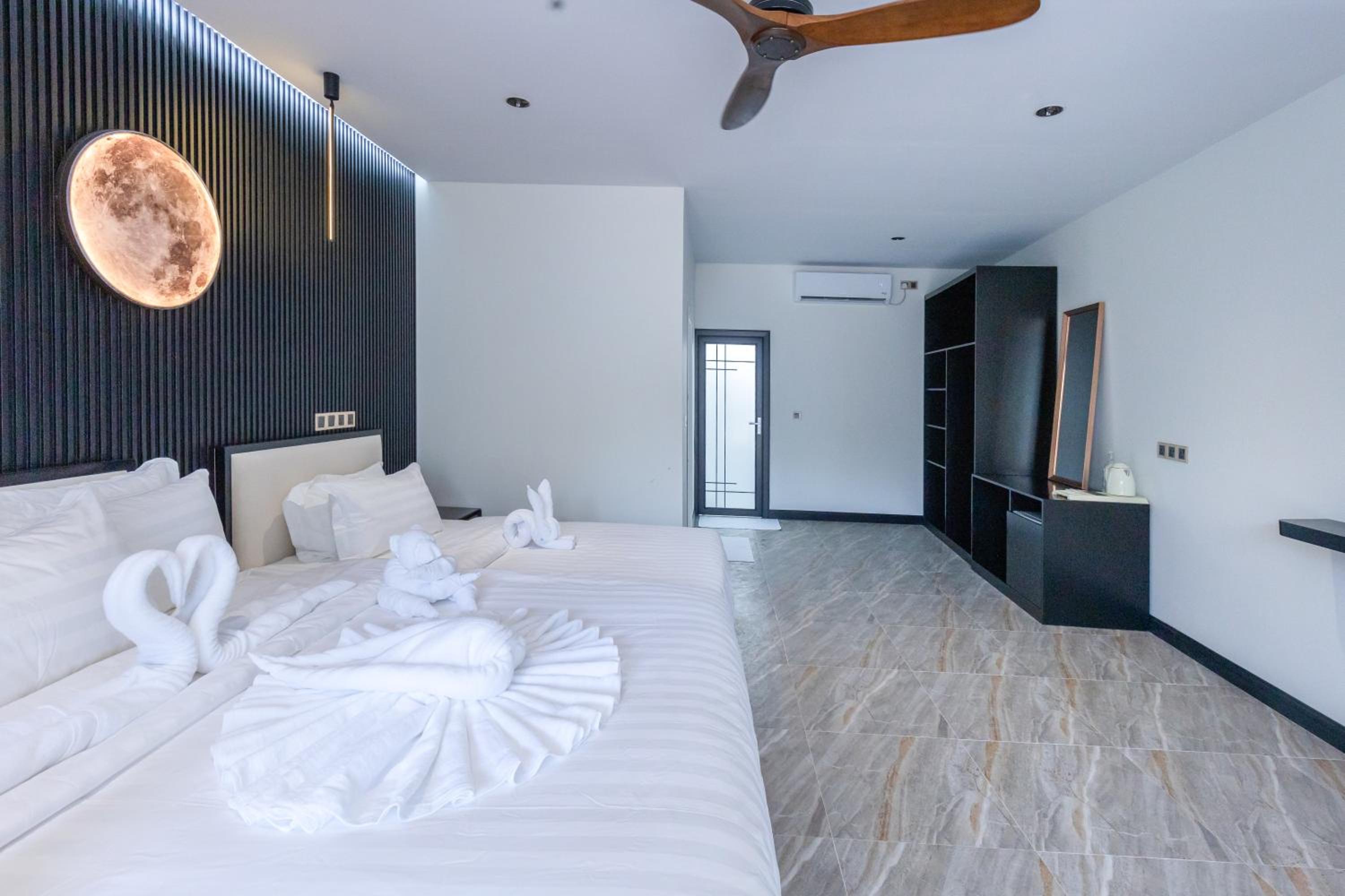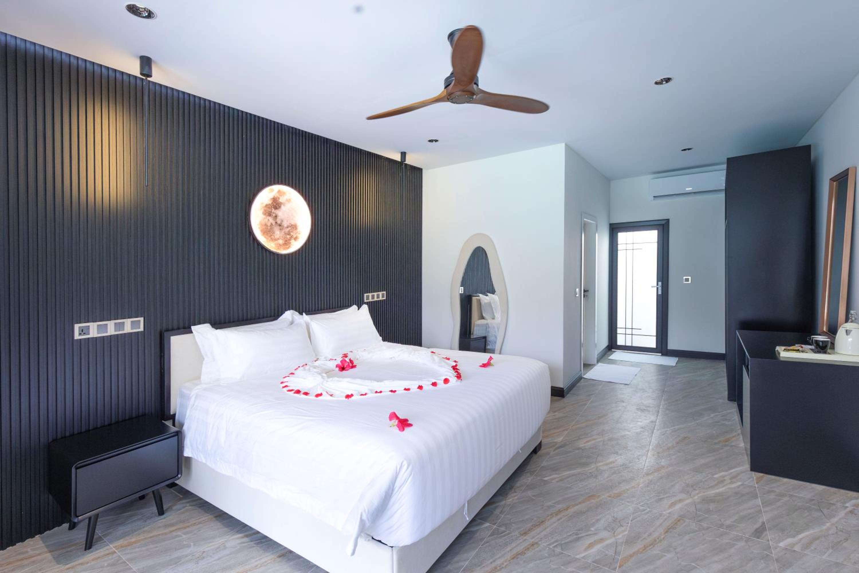 Location, pool, staff. Vibe, cleaning, room, light and moon on the wall.