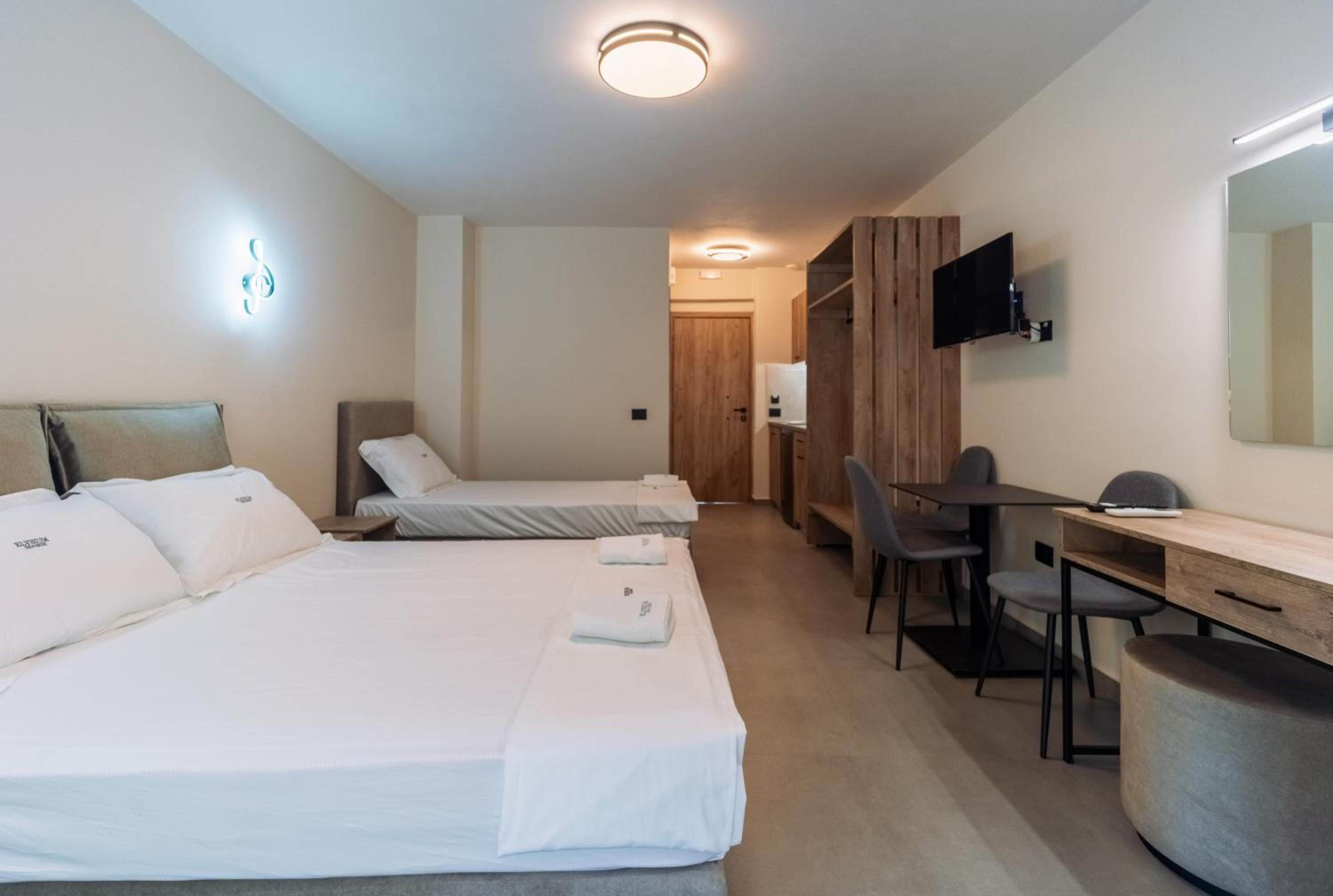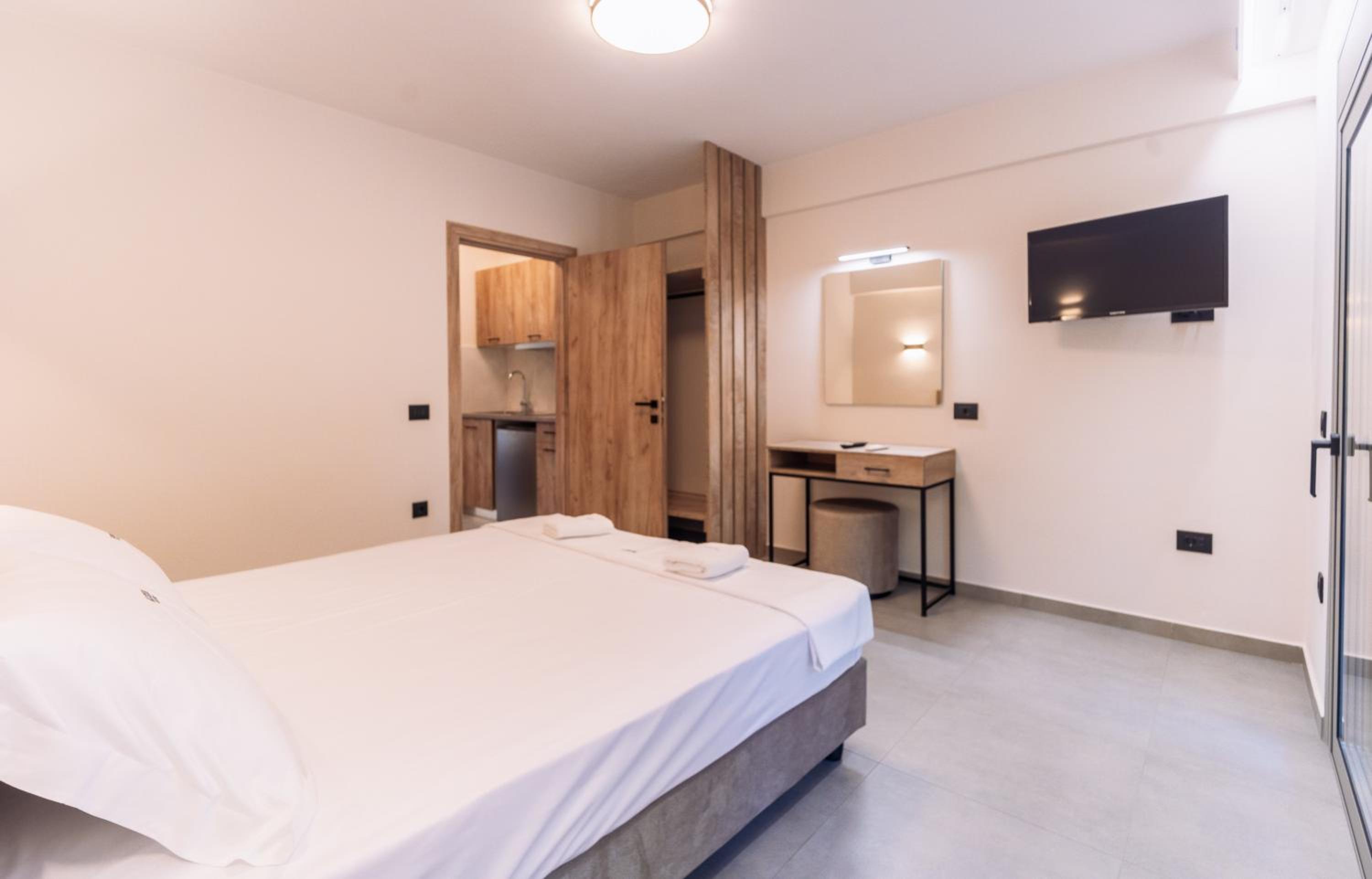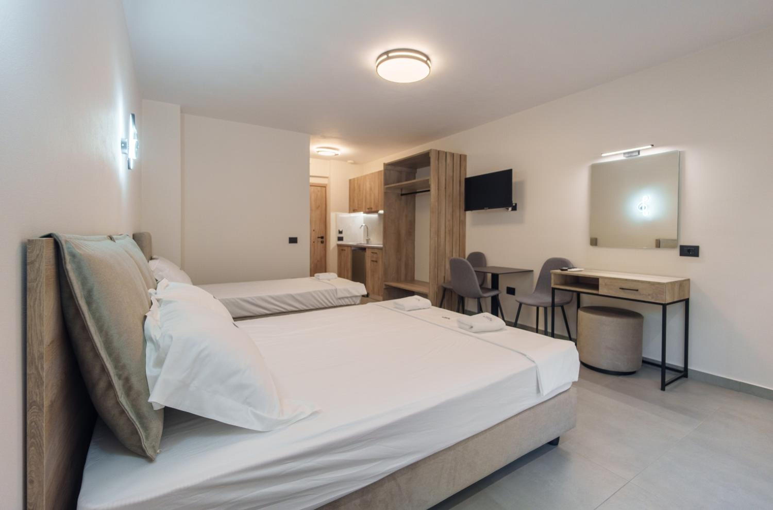 Tolle Lage, nur durch eine Autostraße vom tollen Sandstrand getrennt. Sonnenschirme und Liegen am Strand vorhanden. Sehr schönes neues Haus. Saubere, große moderne Wohnungen. Der Inhaber und das Personal sind sehr sehr freundlich. Einkaufsmöglichkeiten, Bars und Restaurants zu Fuß erreichbar.